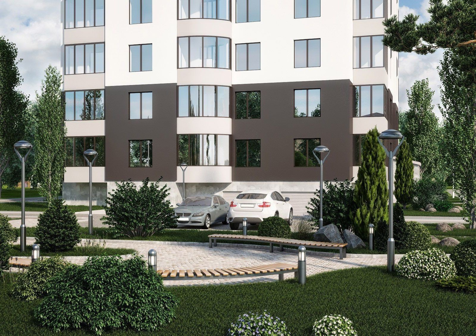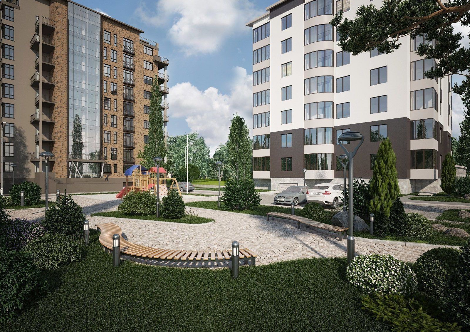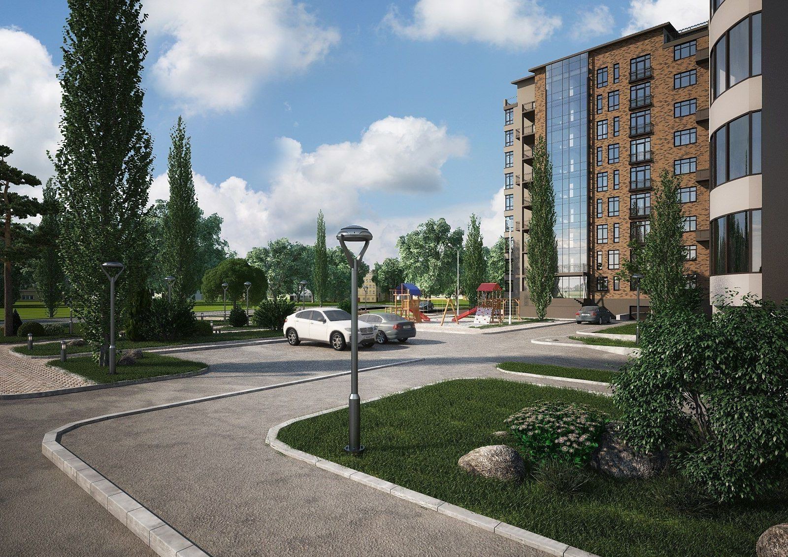 Придомовая территория будет озеленяться высадкой деревьев и кустарников, а также разбивкой клумб, рабаток и газонов. Предусматривается оборудование зон для отдыха и спортивных площадок. Не забудет застройщик и о детях: для них будут установлены горки, качели, песочницы. Для владельцев автомашин имеются встроенные гаражные боксы и гостевые парковки.