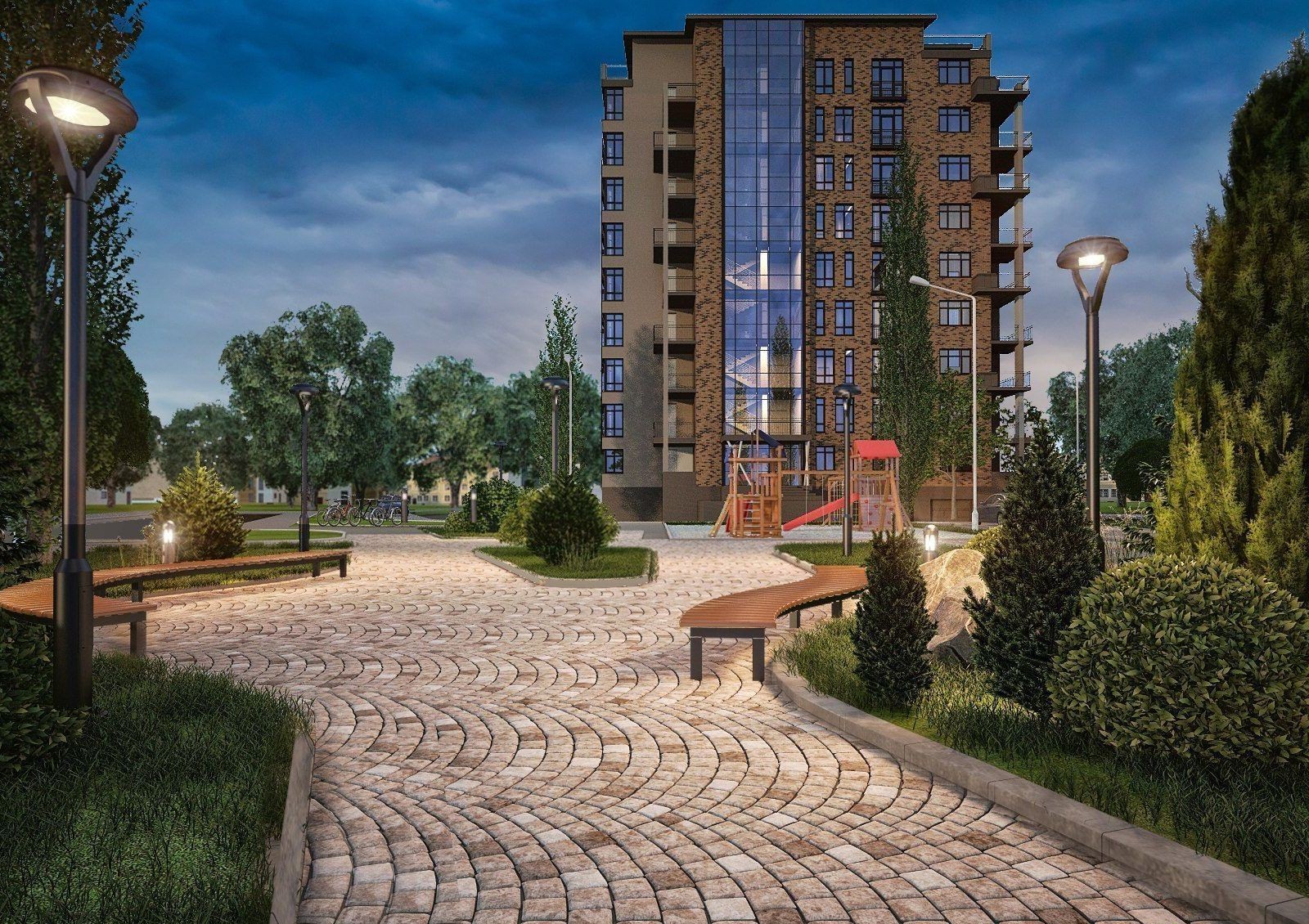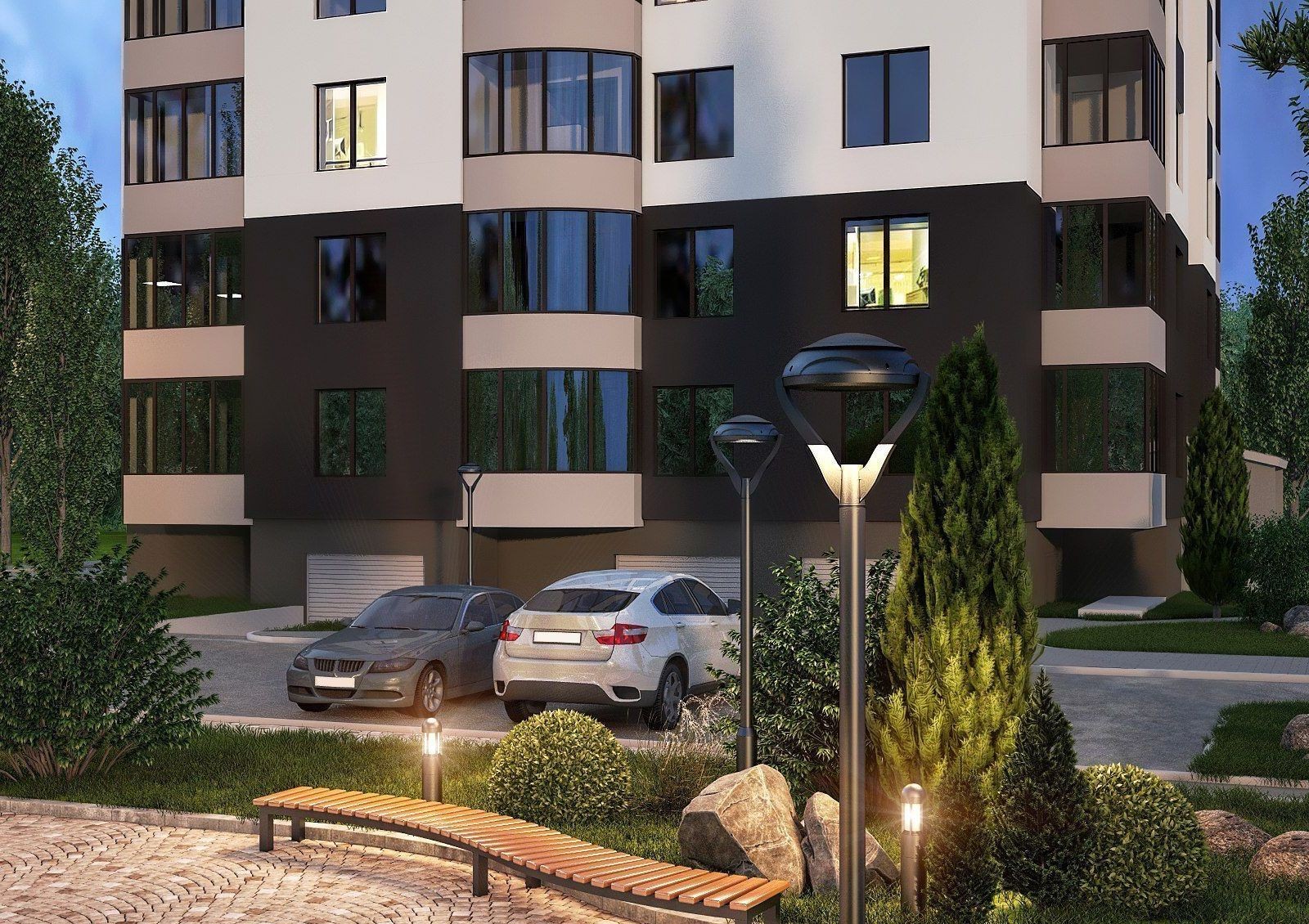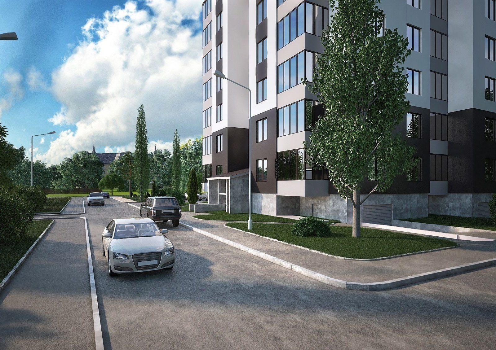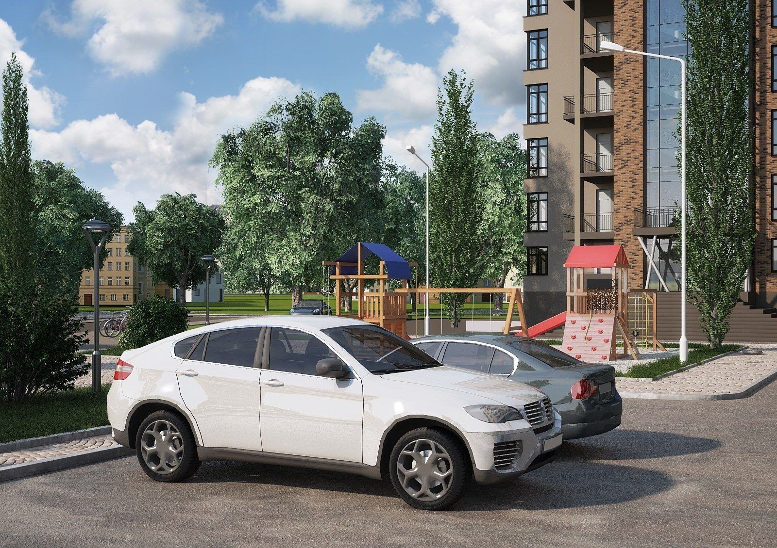 Придомовая территория будет озеленяться высадкой деревьев и кустарников, а также разбивкой клумб, рабаток и газонов. Предусматривается оборудование зон для отдыха и спортивных площадок. Не забудет застройщик и о детях: для них будут установлены горки, качели, песочницы. Для владельцев автомашин имеются встроенные гаражные боксы и гостевые парковки.