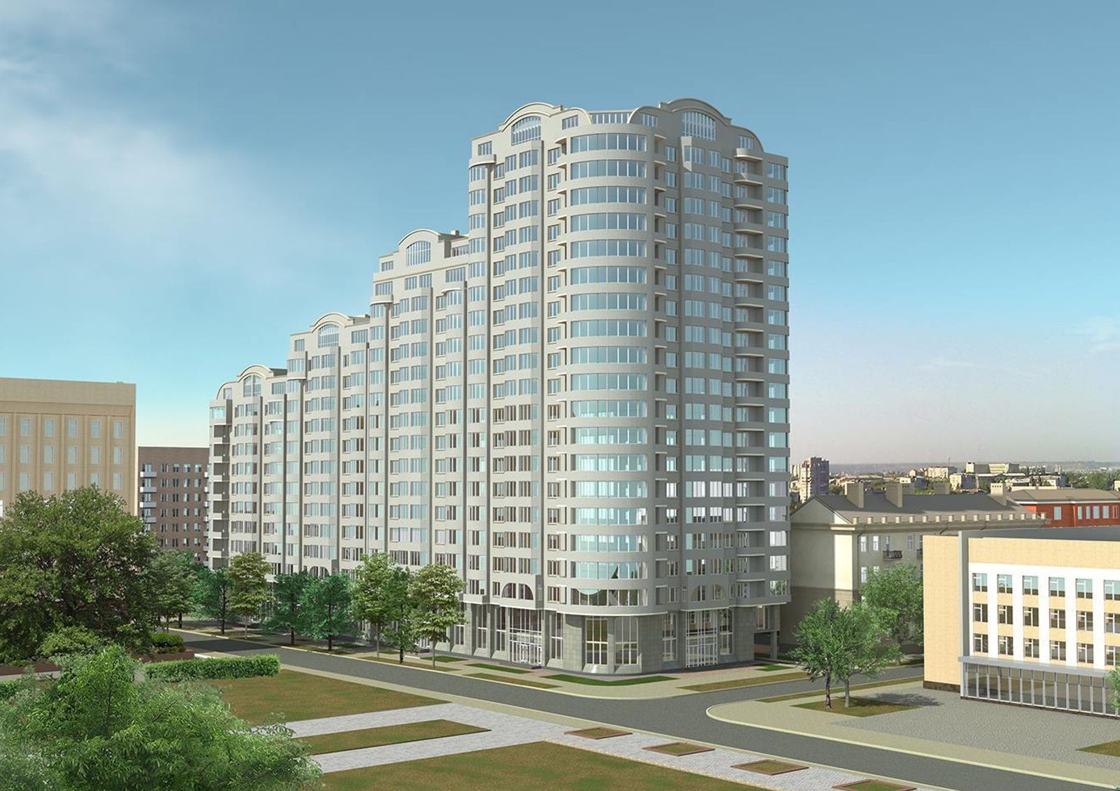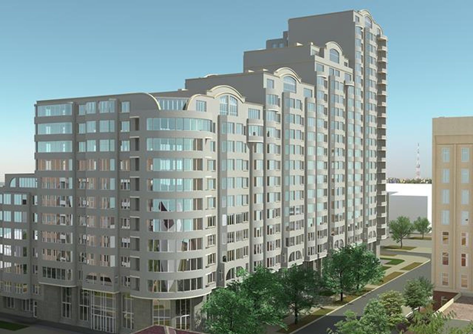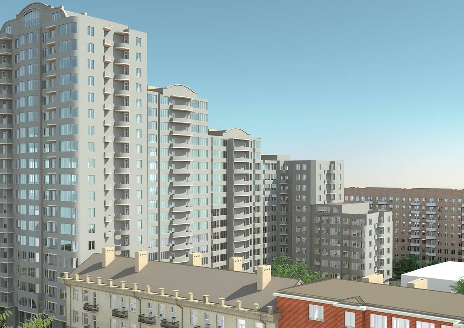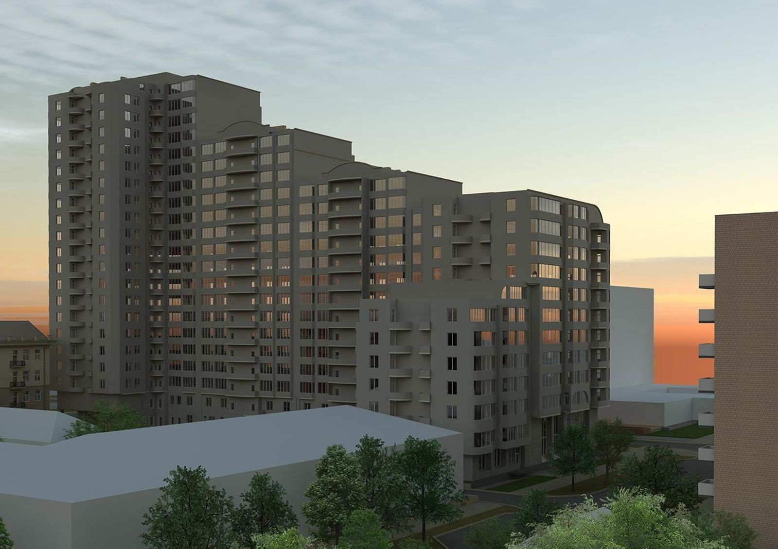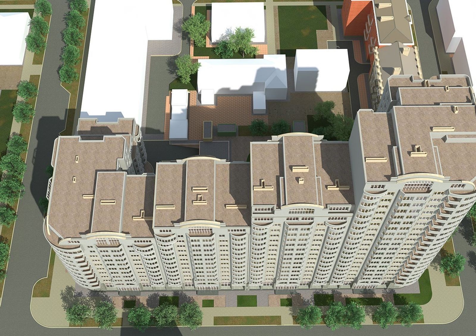 Проект благоустройства придомовой территории предусматривает высадку многолетних зеленых насаждений, монтаж уличного освещения, прокладку пешеходных аллей и автомобильных проездов.