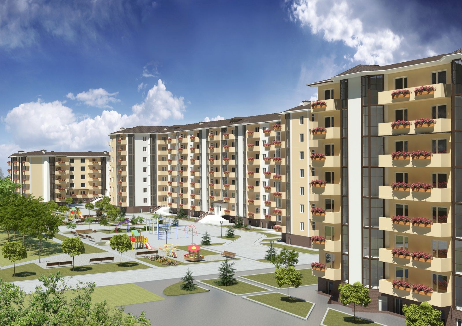 Комплекс будет состоять из десяти домов от 5 до 7 этажей. Цокольный этаж предназначен для размещения торговых точек, салонов красоты, офисов, подсобных помещений.