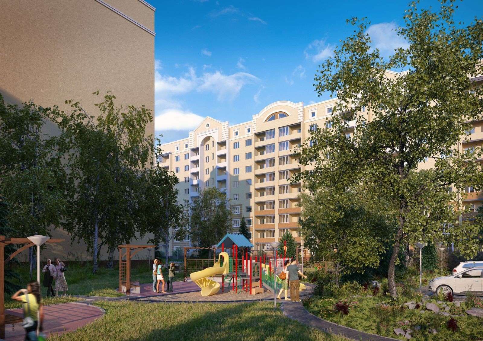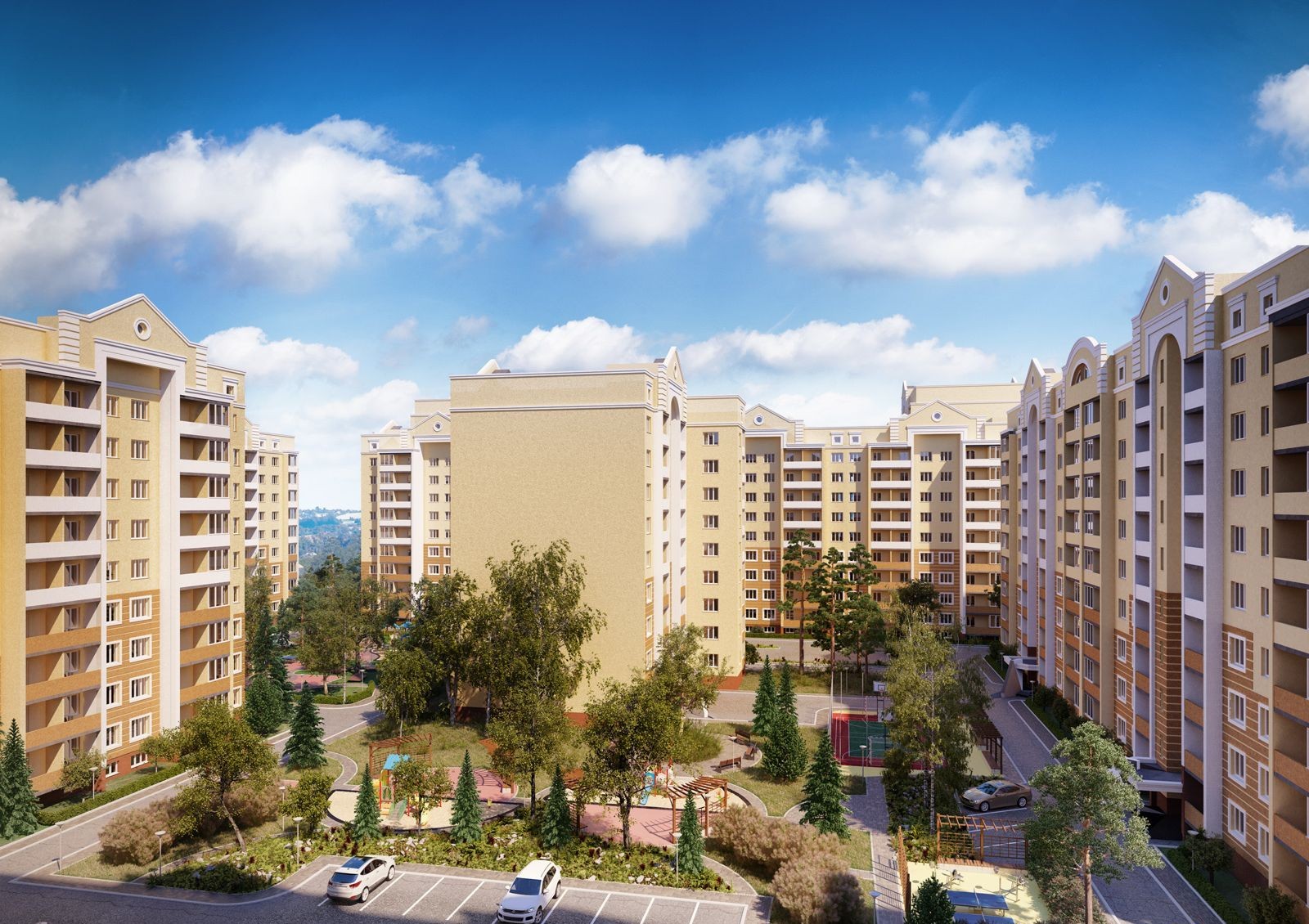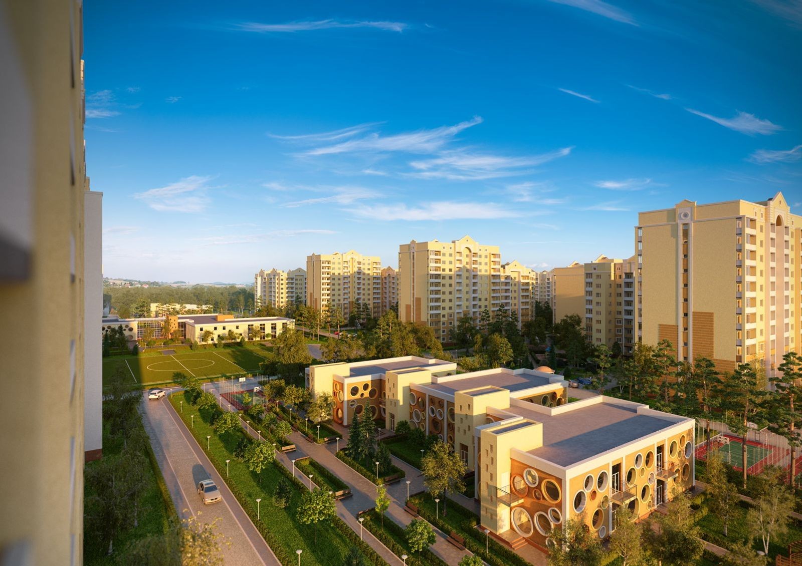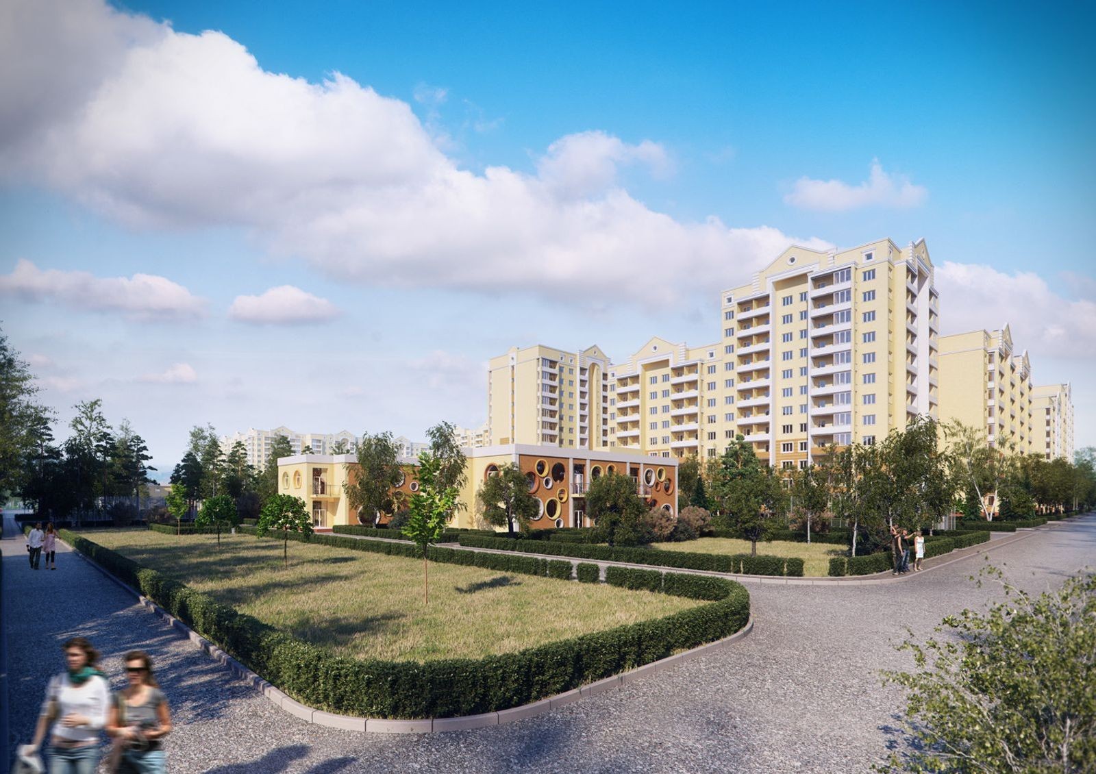 «София Киевская» – жилой комплекс, в котором много внимания уделяется обеспечению достойного качества жизни. Оборудуются современные детские площадки, комфортабельные зоны отдыха, оснащенные беседками, строятся наземные паркинги для автотранспорта. Прокладываются удобные проезды и прогулочные дорожки, высаживаются декоративные кустарники и деревья.