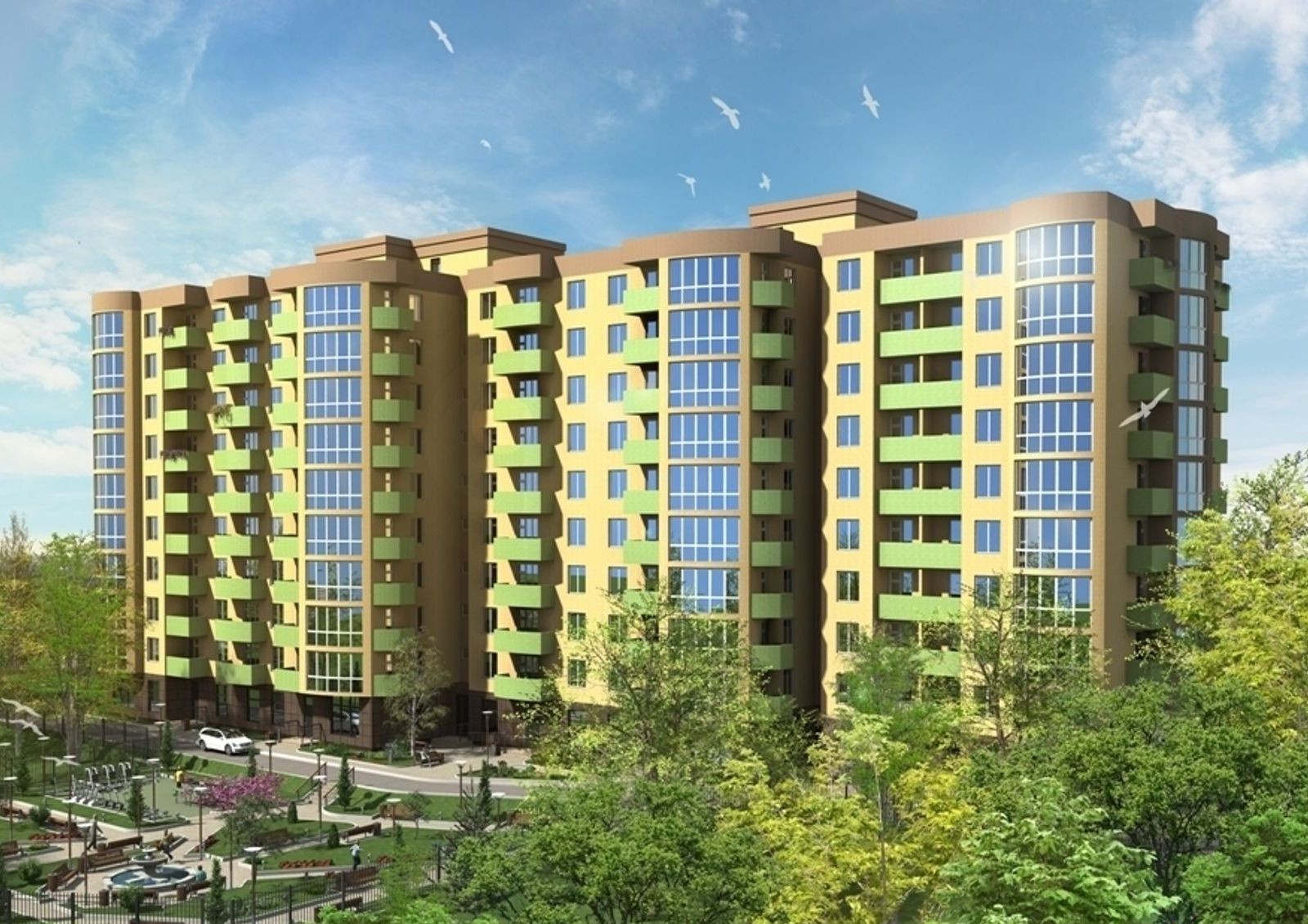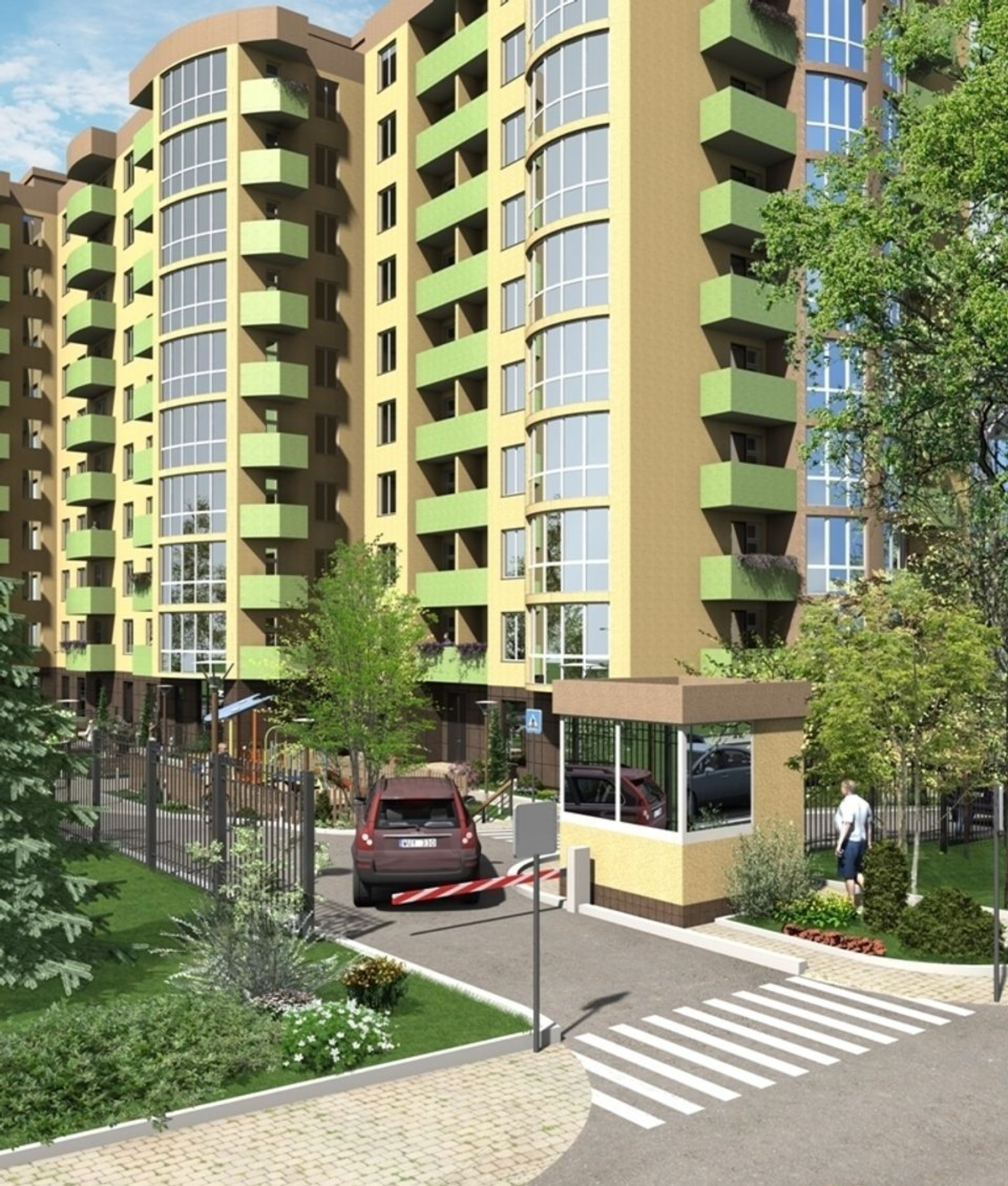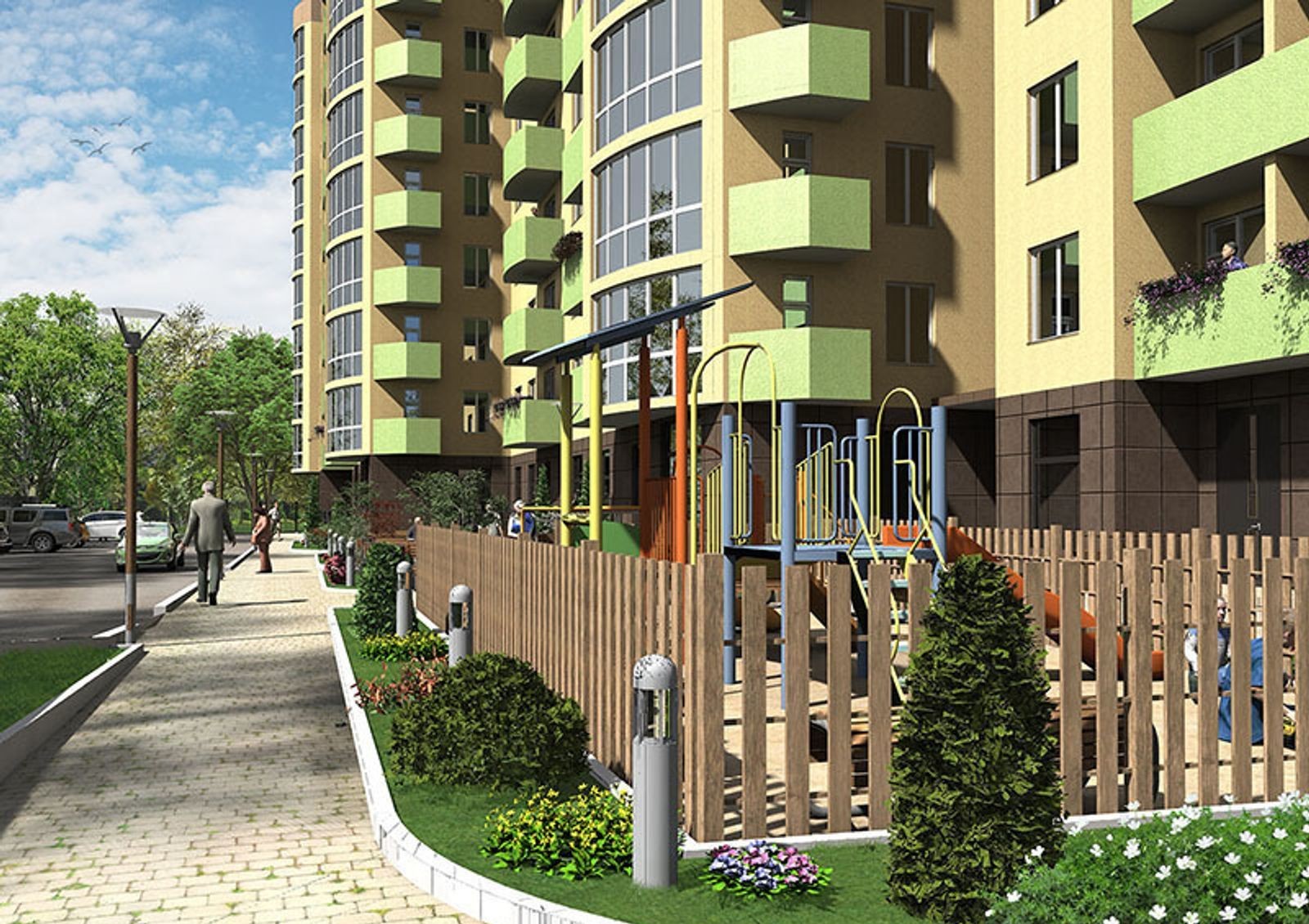 детская и спортивная площадки, закрытая парковая зона площадью 1000 кв. м, остановка общественного транспорта