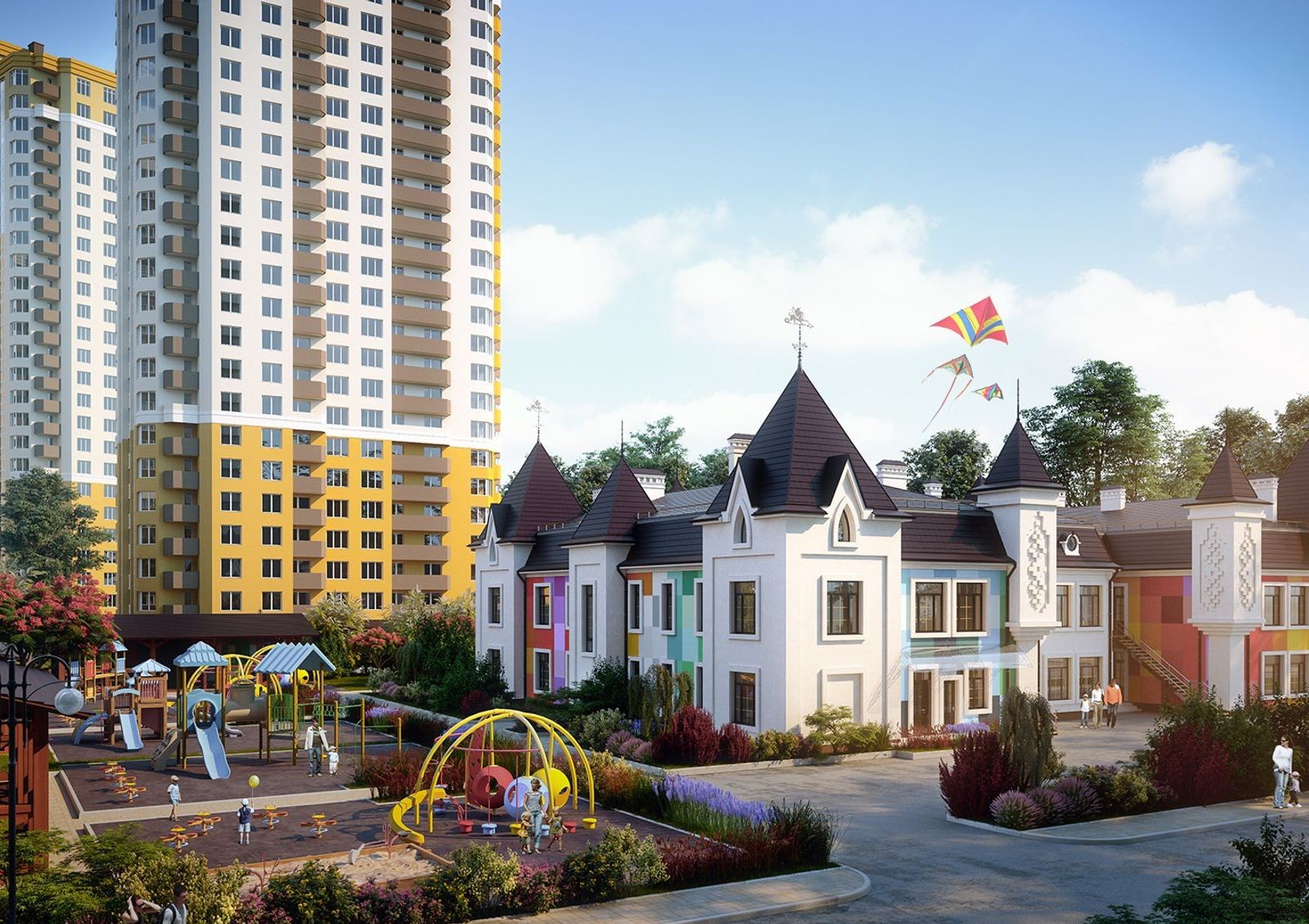 Комплекс находится в престижном районе с развитой социальной и торговой инфраструктурой. Не далее чем в 5-15 минутах ходьбы от новостройки есть несколько супермаркетов, кондитерские и магазины свежей выпечки, строительный гипермаркет, аптеки, автосалон, цветочные киоски, ветеринарная клиника, больница для взрослых и детей, стоматология, СТО, парикмахерская и косметологический центр, кафе. На территории комплекса построен детский сад.