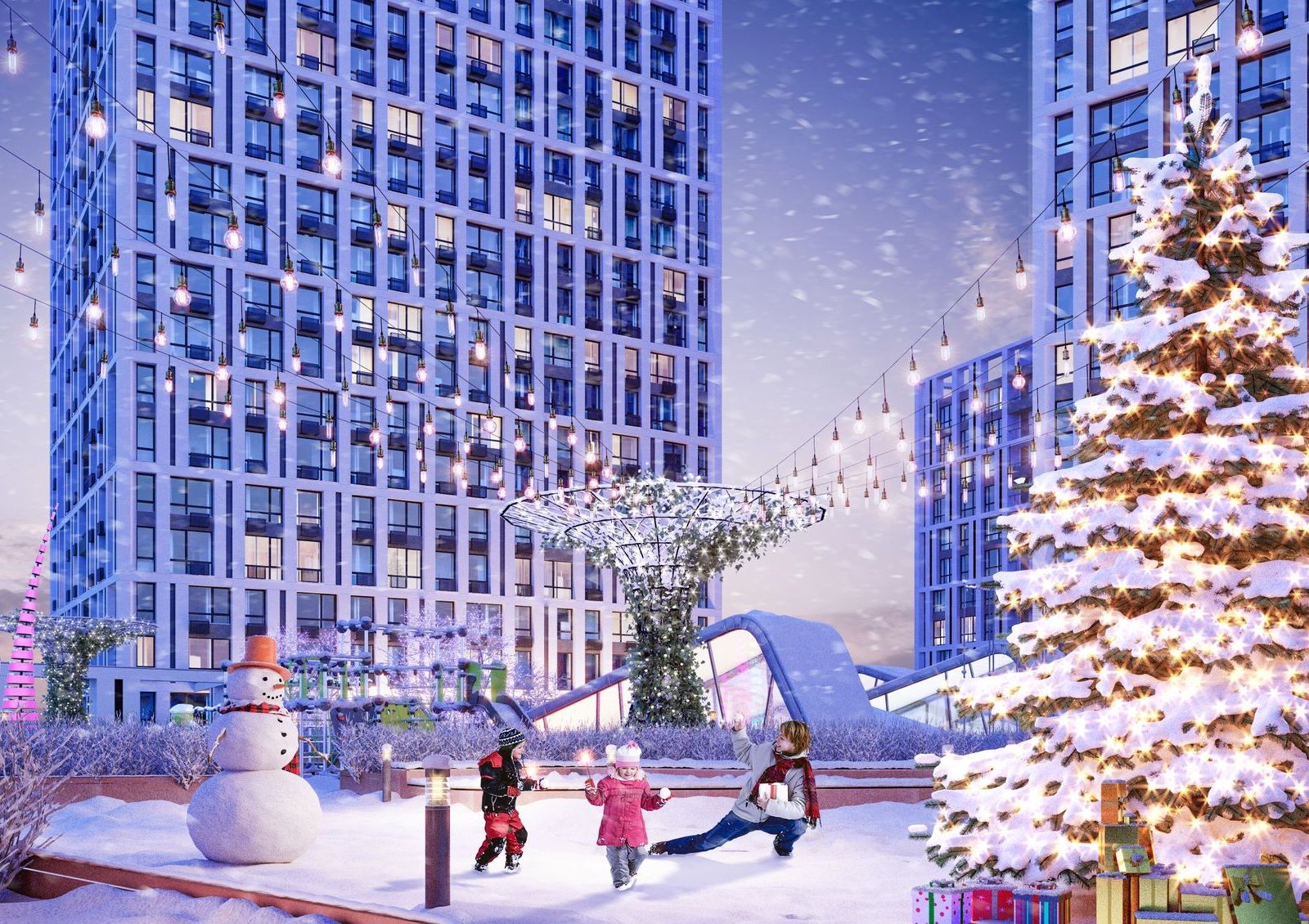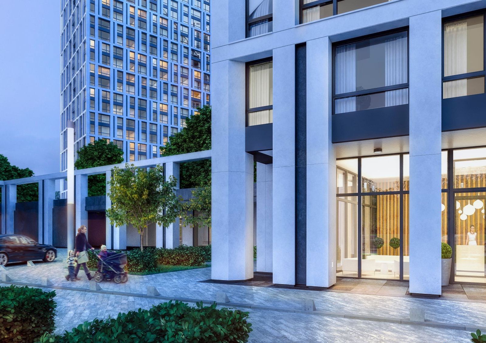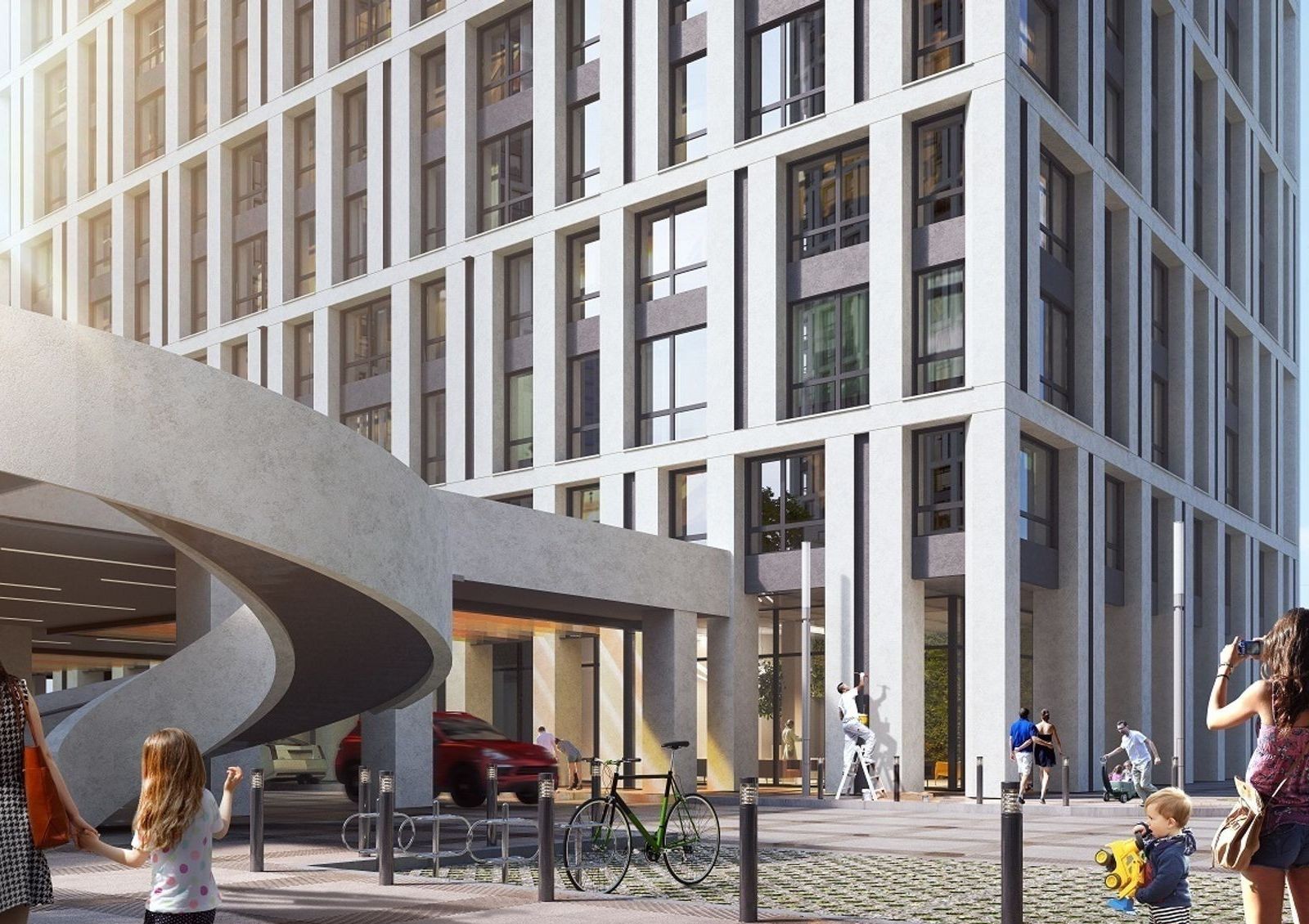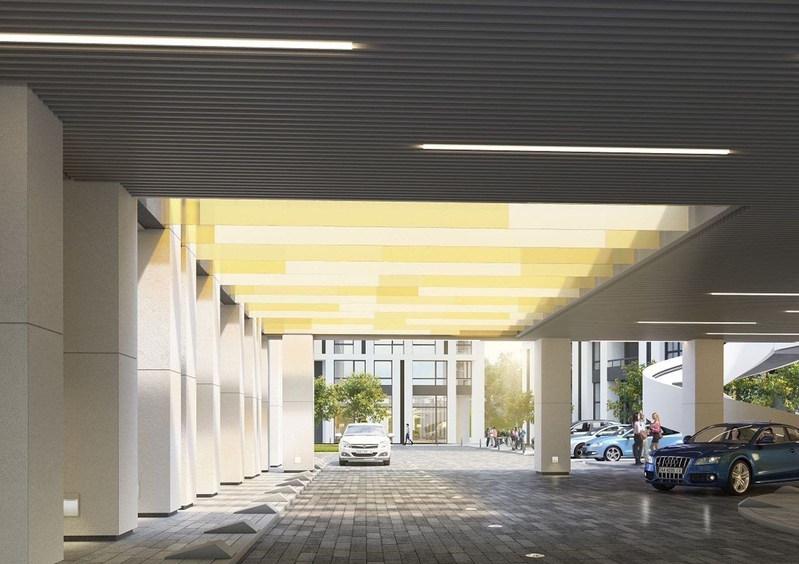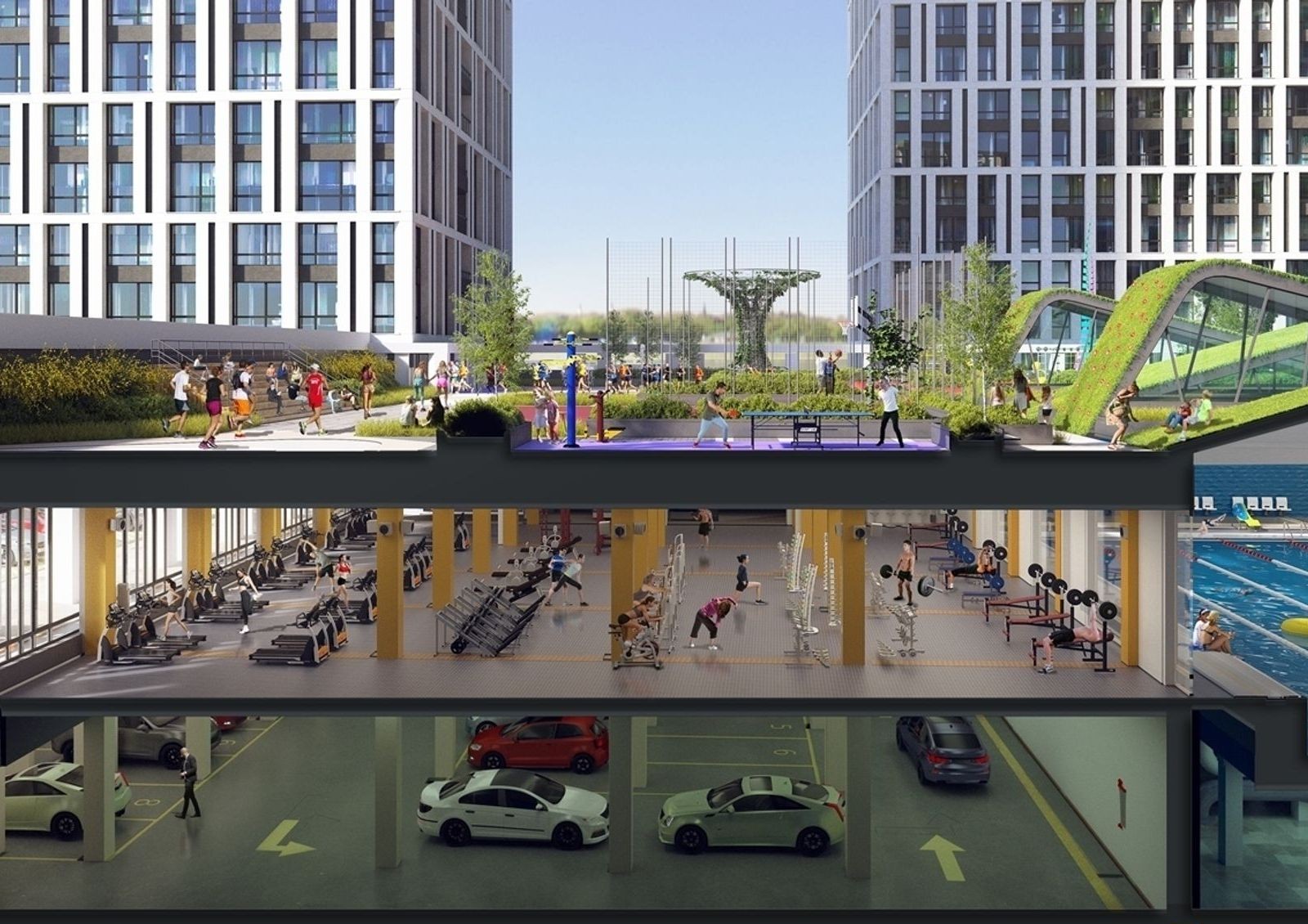 Архитектурная концепция жилого комплекса «Славутич» — 5 домов, объединенных общим стилобатом. В стилобатной части будет расположен подземный паркинг. Крыша стилобата будет свободной от автомобилей придомовой территорией, разделенной на функциональные зоны: спортивную, детскую и зону отдыха.