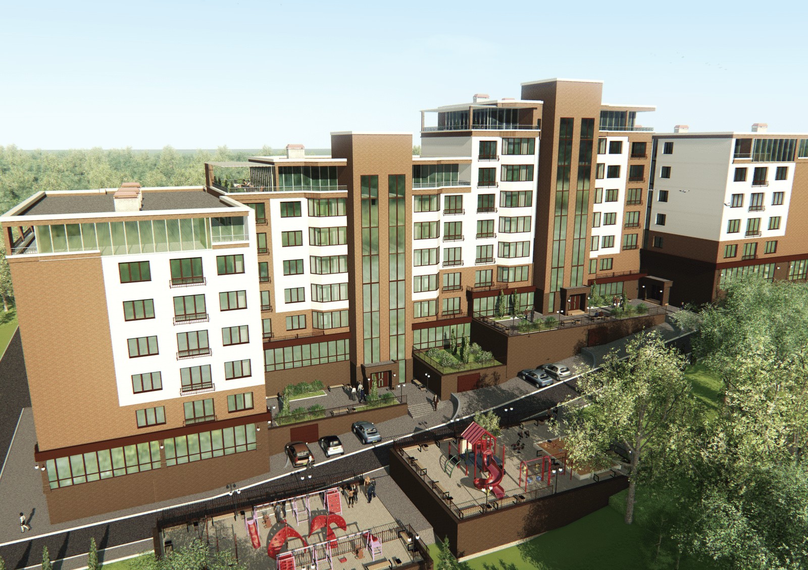 Комплекс закрыт для посторонних и находится под постоянным видеонаблюдением. Придомовая территория будет иметь площадку с песочницами, горками, качелями и детскими тренажерами. Также застройщик позаботился и о владельцах автомобилей, обустроив гостевой и подземный паркинги.