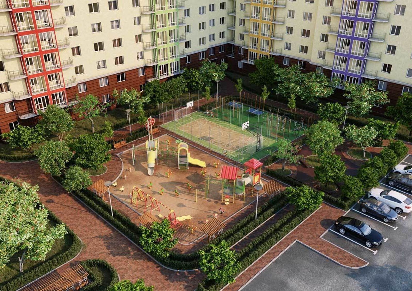 благоустроенная территория — закрытые от проезжей части детские площадки и зоны отдыха