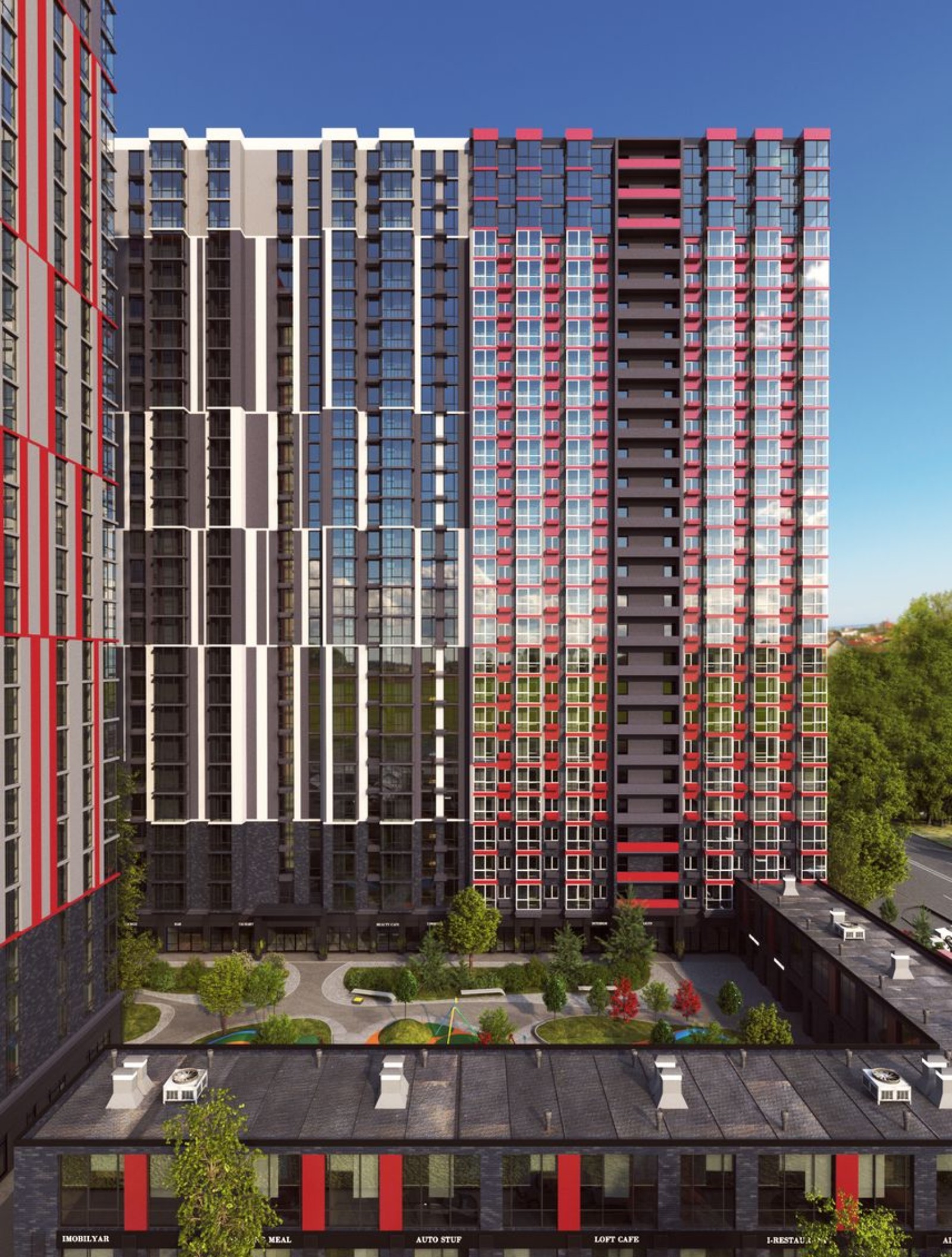 Проект жилого комплекса 4U предусматривает строительство двух 27-этажных жилых зданий, по две секции в каждом. Первое, что бросается в глаза, — это современный внешний вид: дизайнерская архитектура, комбинированные цвета и материалы фасада, панорамное остекление и многоуровневые формы. В рамках комплекса также планируют построить двухэтажное здание с коммерческими и офисными помещениями, что придаст комфорт и удобство будущим жильцам, ведь здесь откроют кафе, магазины, аптеку, салон красоты или другие полезные заведения.