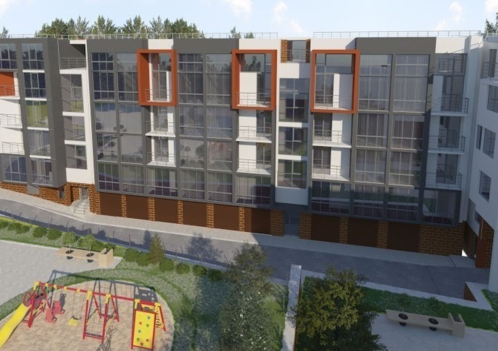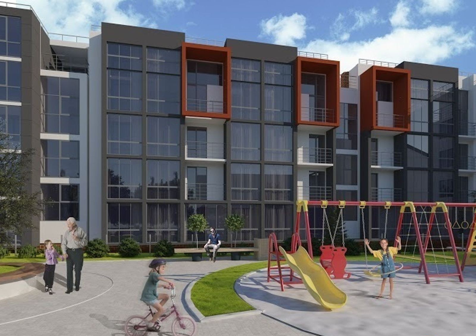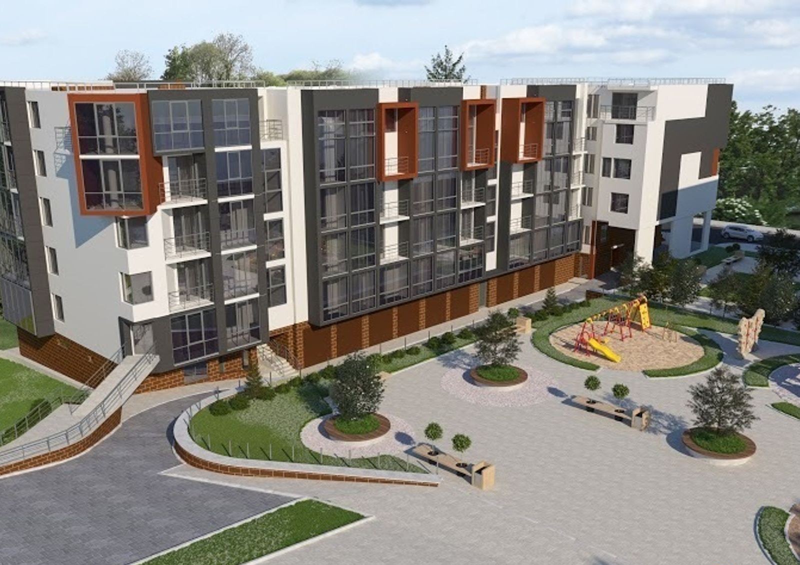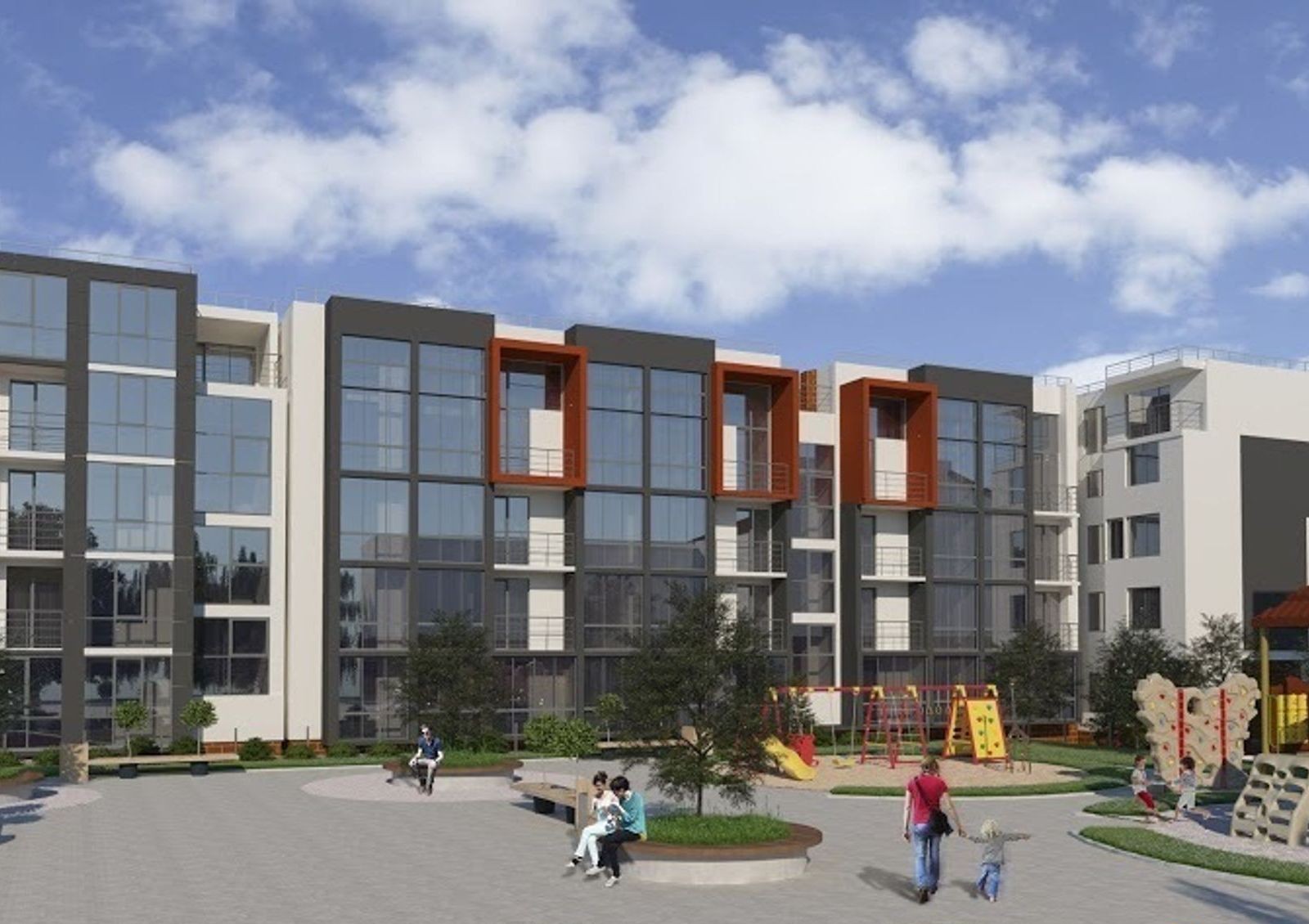 Во дворе обустроена красочная и безопасная площадка для детских игр, предусмотрена просторная рекреационная зона для отдыха жильцов.