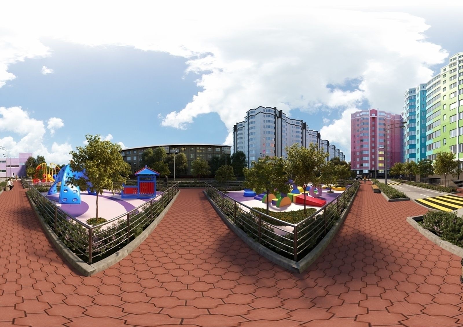 Возле дома устроены широкие проезды и тротуары, организованы гостевые стояночные места для автомашин. Проложены пешеходные дорожки, высажены деревья и кустарники, оборудованы детские площадки и уютные зоны отдыха с лавочками. Установлены фонари уличного освещения.