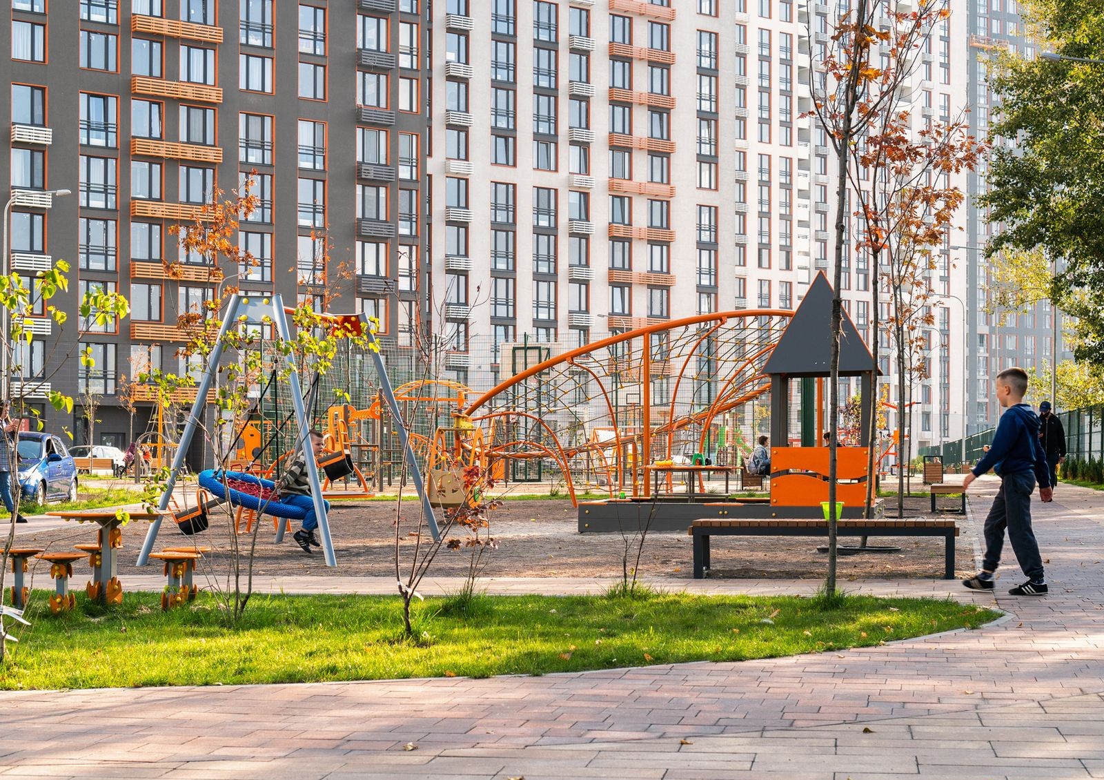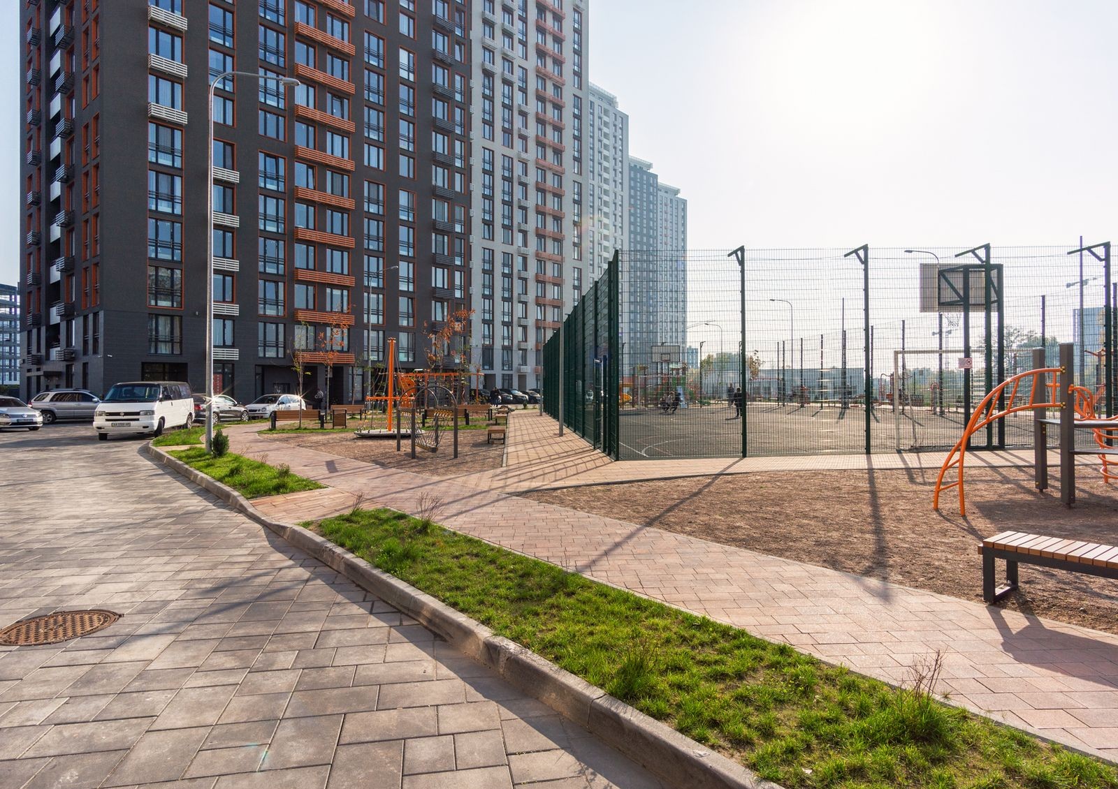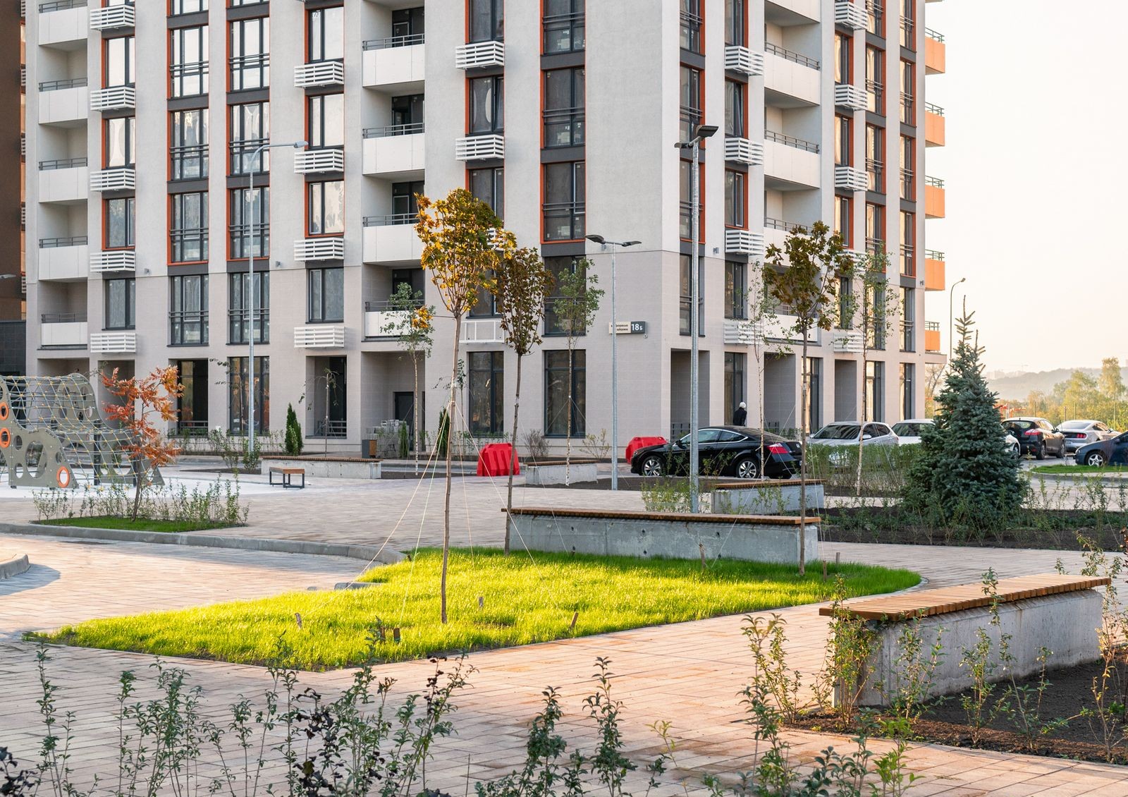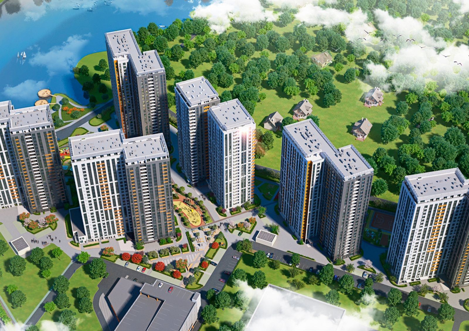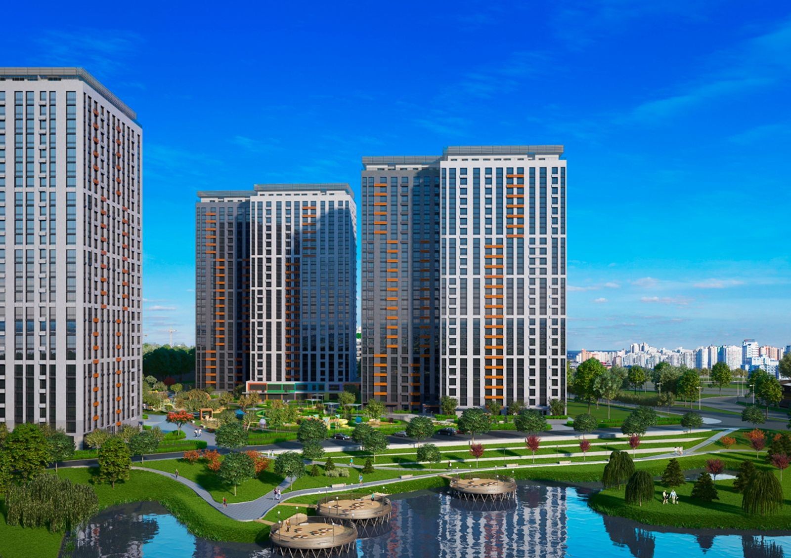 Пространство возле домов превратят в парковую зону: посадят деревья и газоны, обустроят детские игровые и спортивные площадки, проложат прогулочные аллеи с выходом к воде.