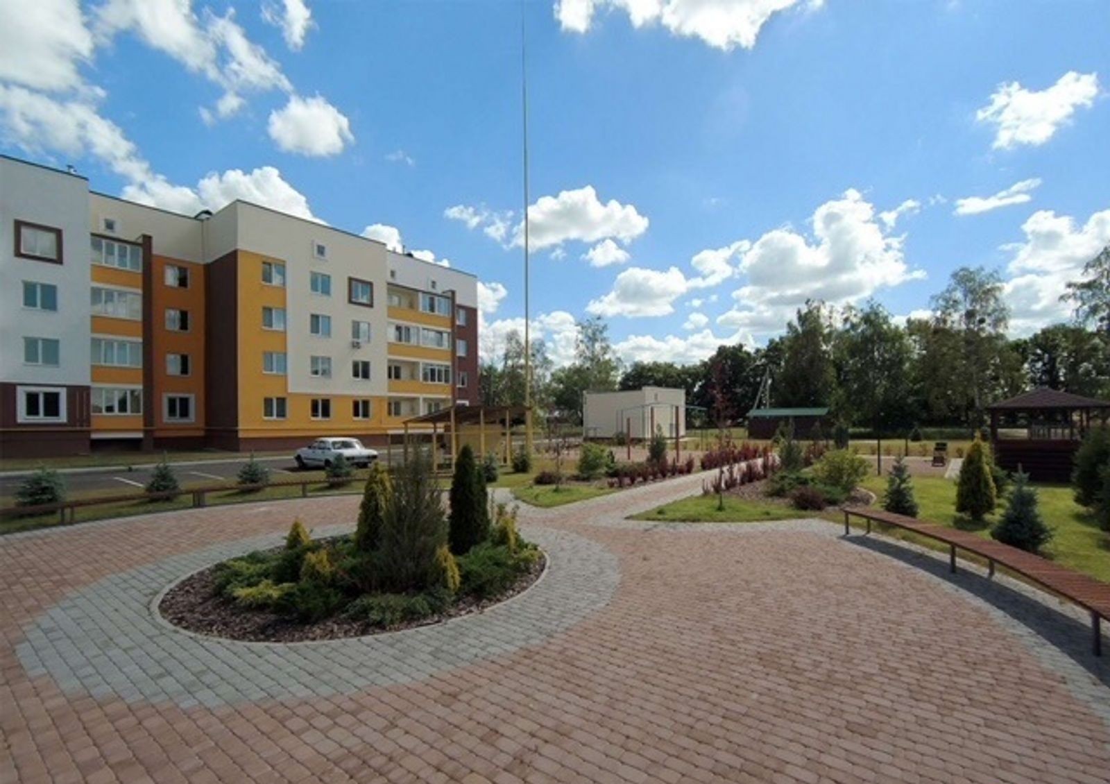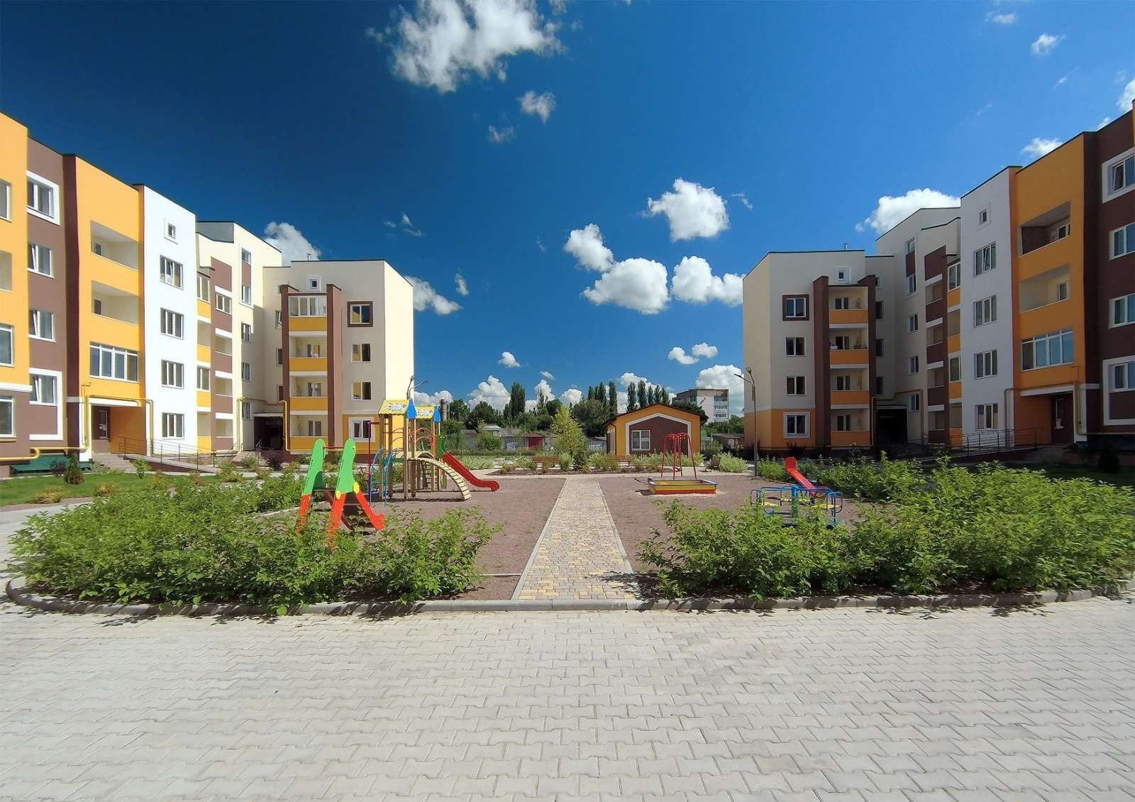 Территория объекта занимает 4 га – закрыта и оборудована площадками для детских игр и занятий спортом, зонами отдыха. Есть наземный паркинг и гаражные блоки. Предусмотрены нежилые строения для сферы торговли и услуг, спорткомплекс с бассейном.
