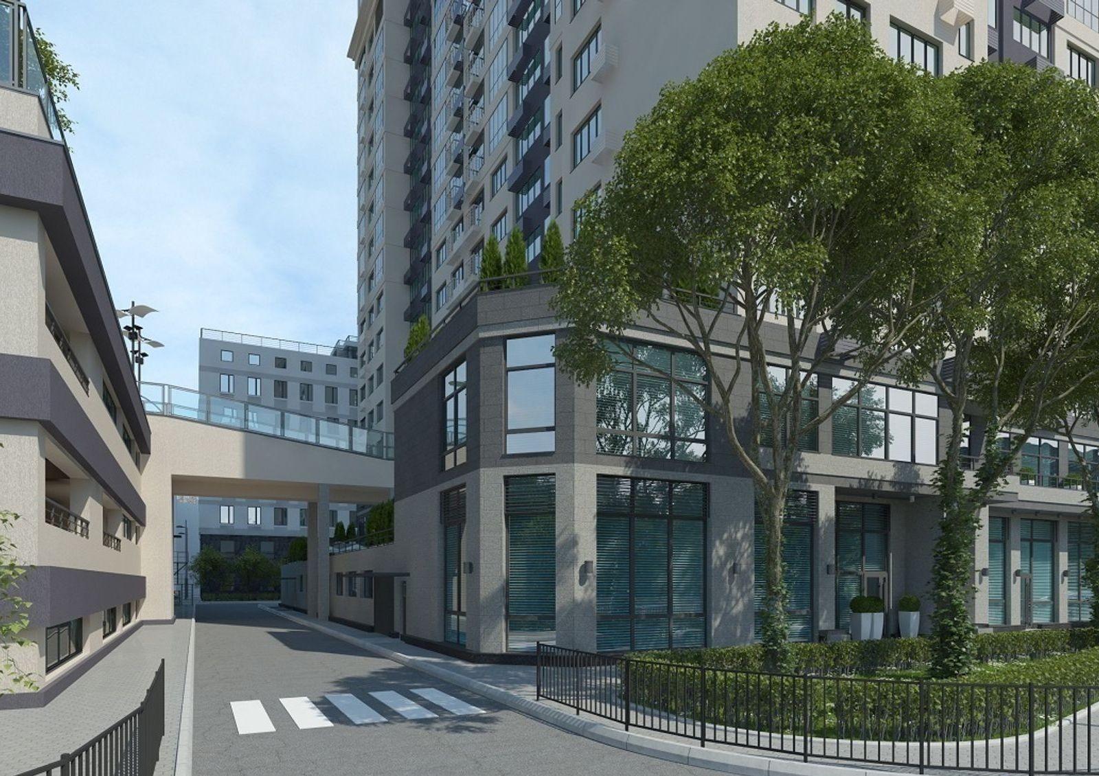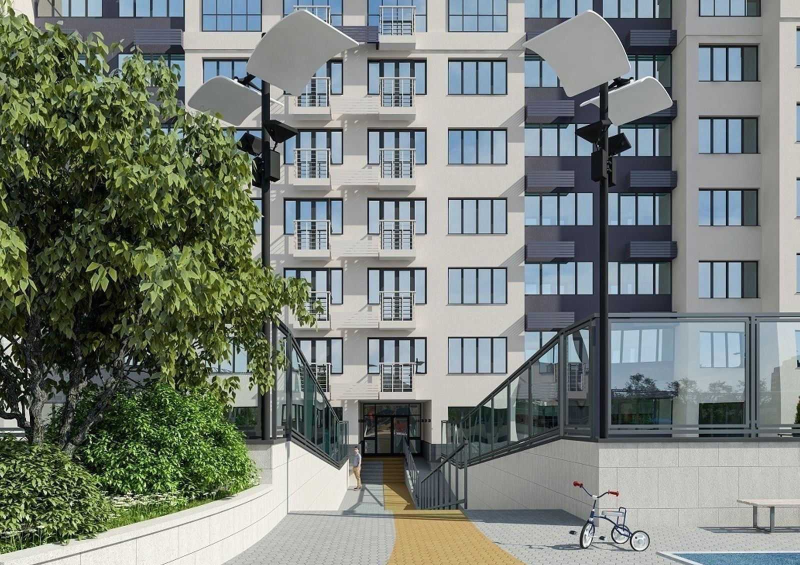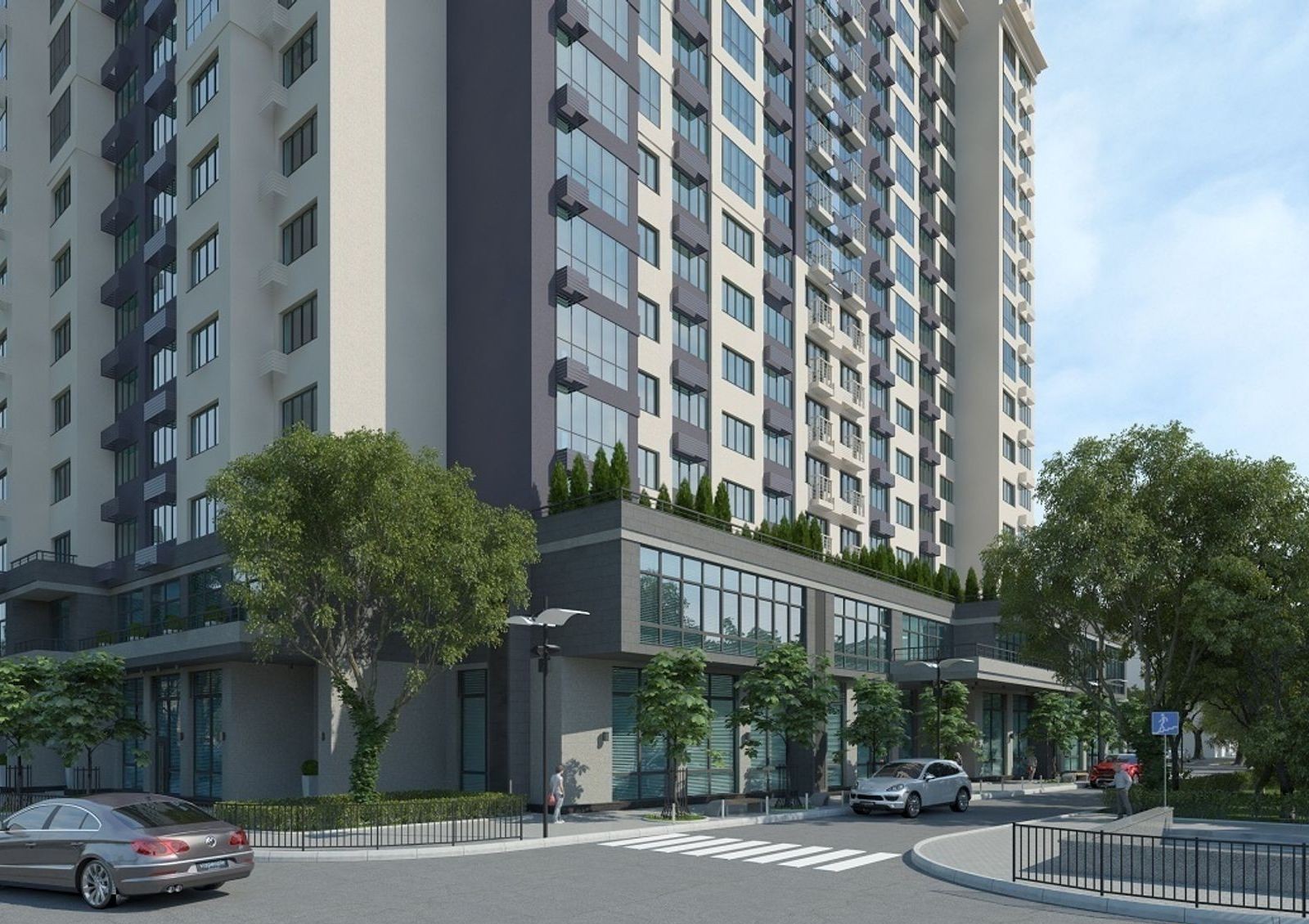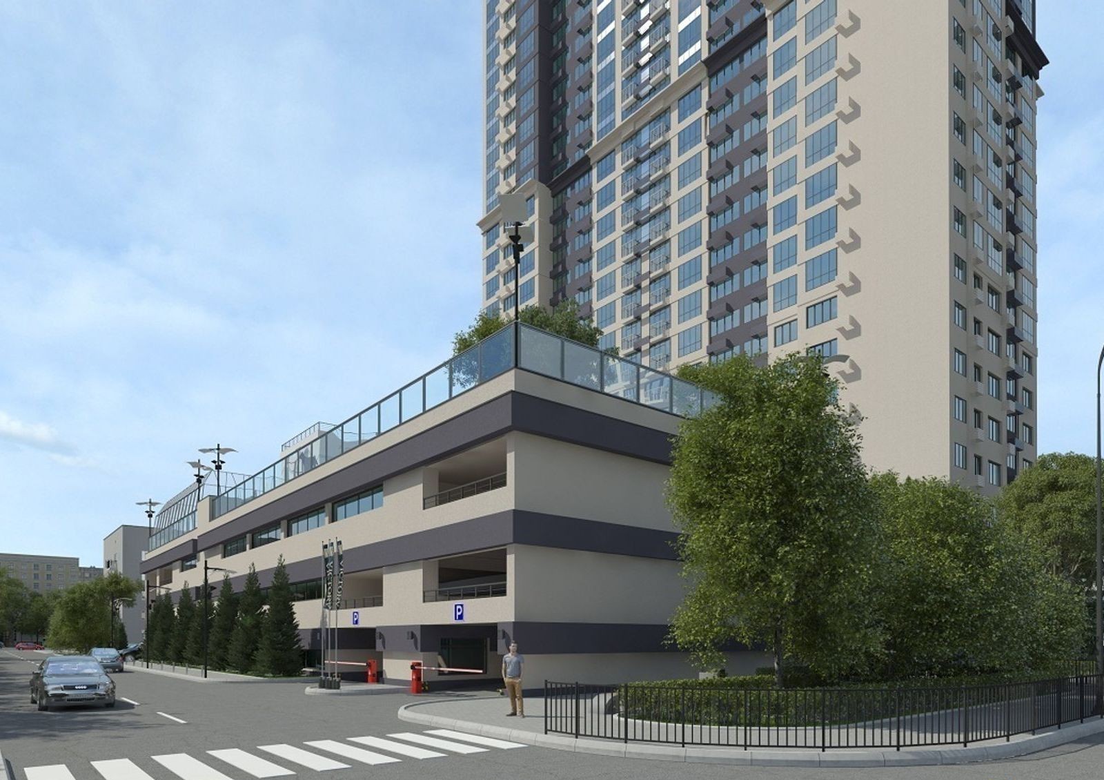 Жилой комплекс имеет уютный двор с разделением на зоны для отдыха, детских игр и занятий спортом. Для машин на придомовой территории предусмотрена гостевая стоянка, также в новостройке оборудован трехуровневый паркинг. Первые этажи дома отведены под коммерческие объекты.