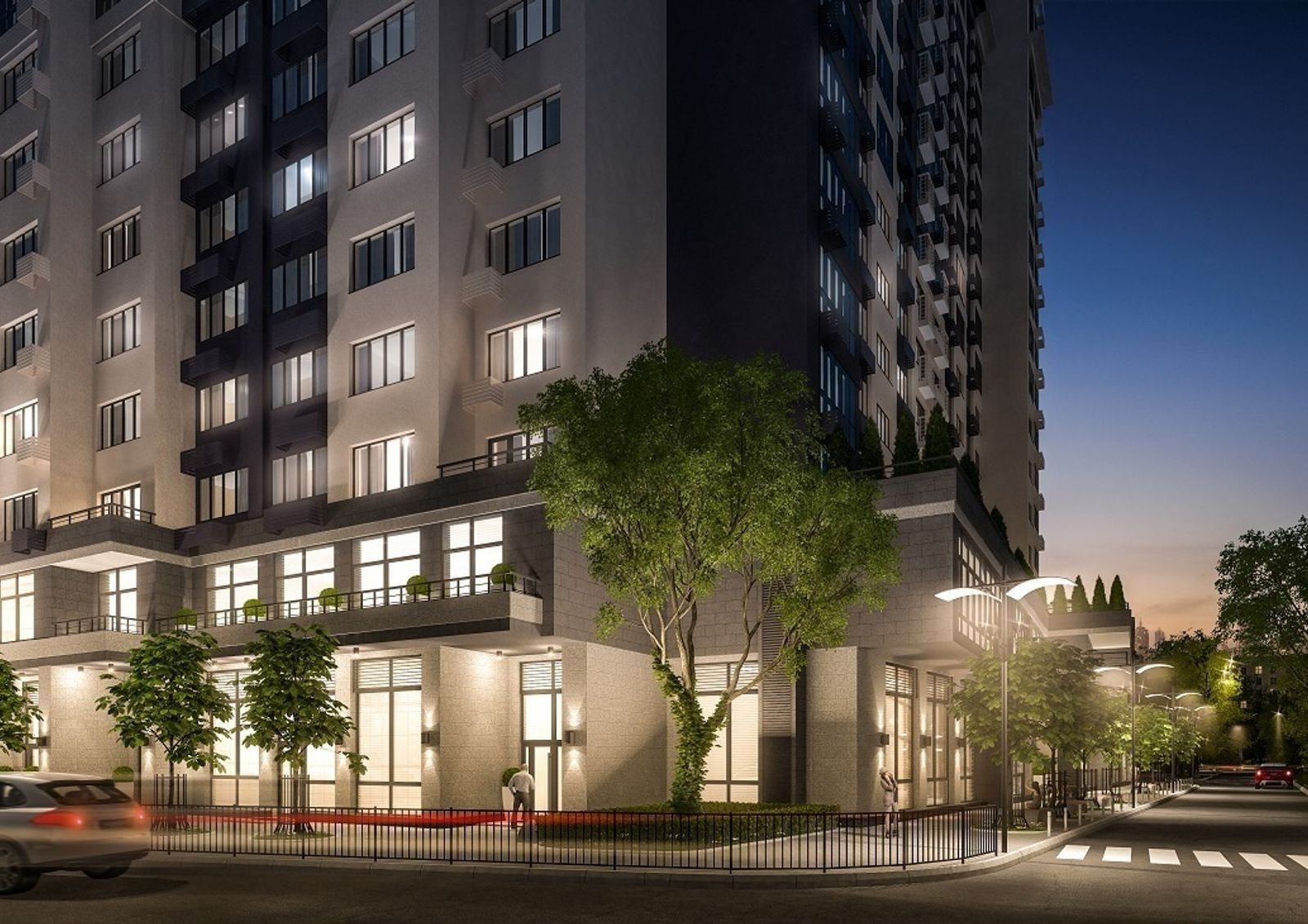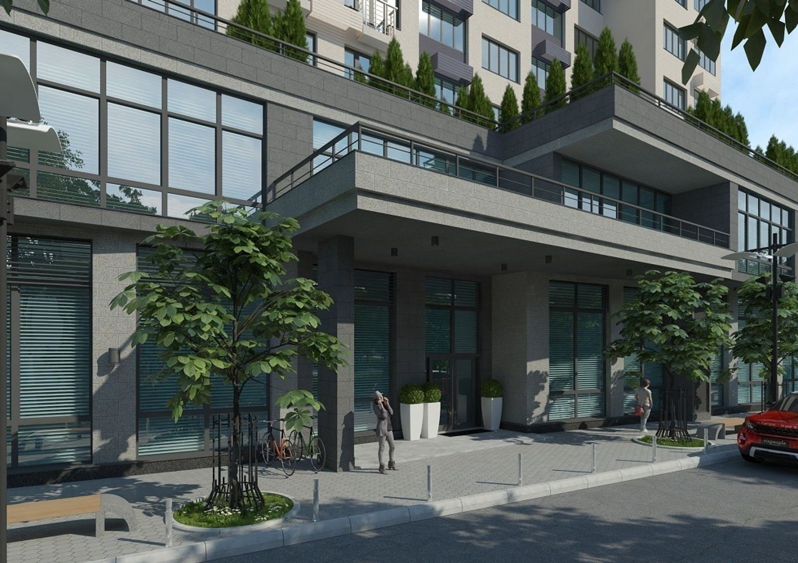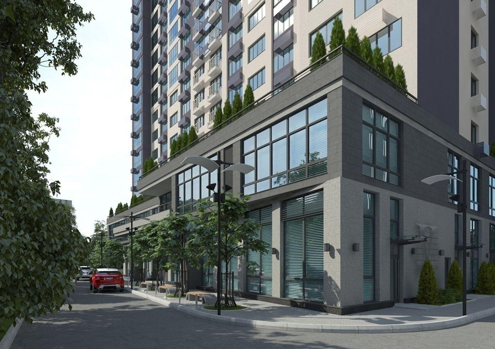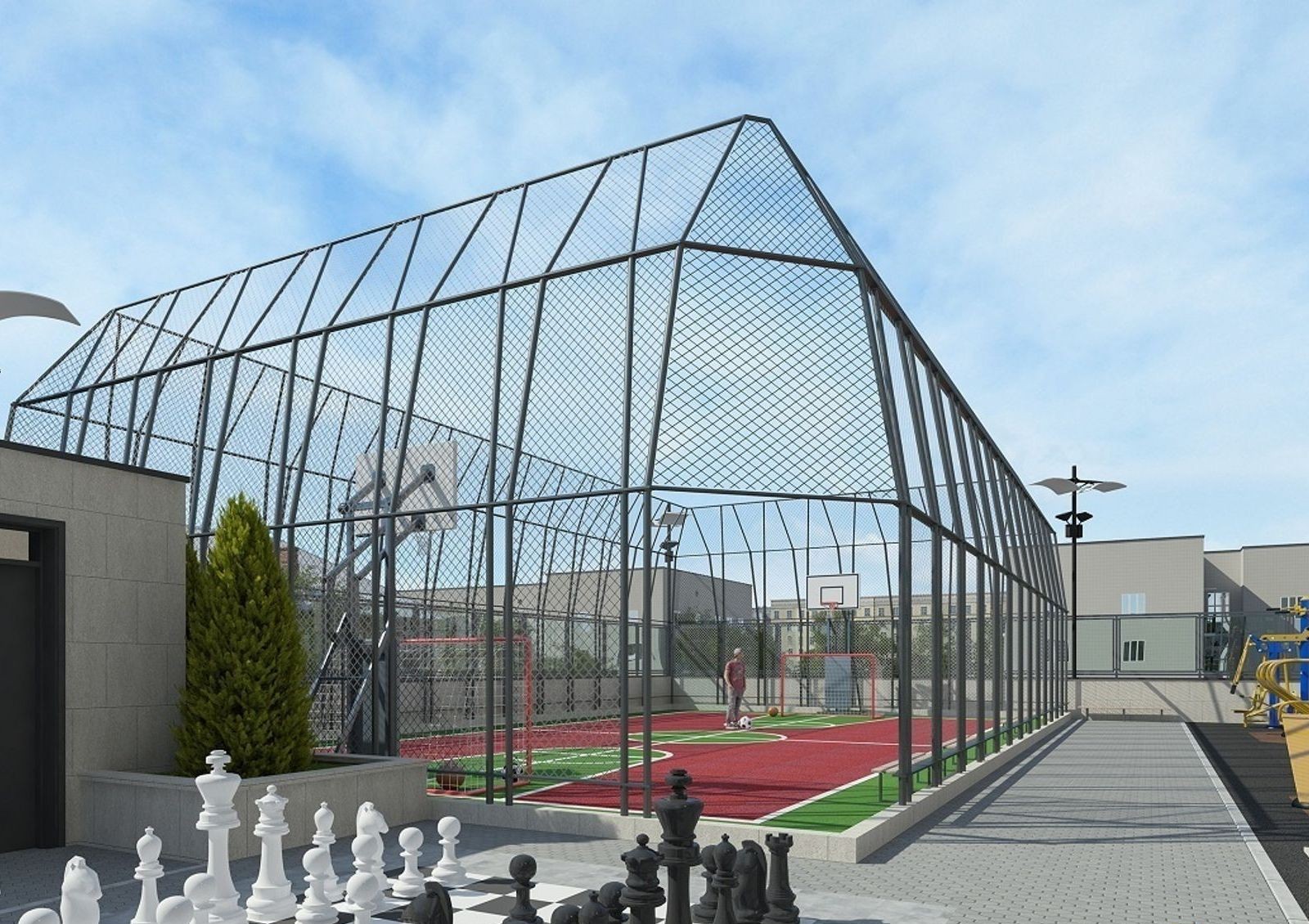 Жилой комплекс имеет уютный двор с разделением на зоны для отдыха, детских игр и занятий спортом. Для машин на придомовой территории предусмотрена гостевая стоянка, также в новостройке оборудован трехуровневый паркинг. Первые этажи дома отведены под коммерческие объекты.