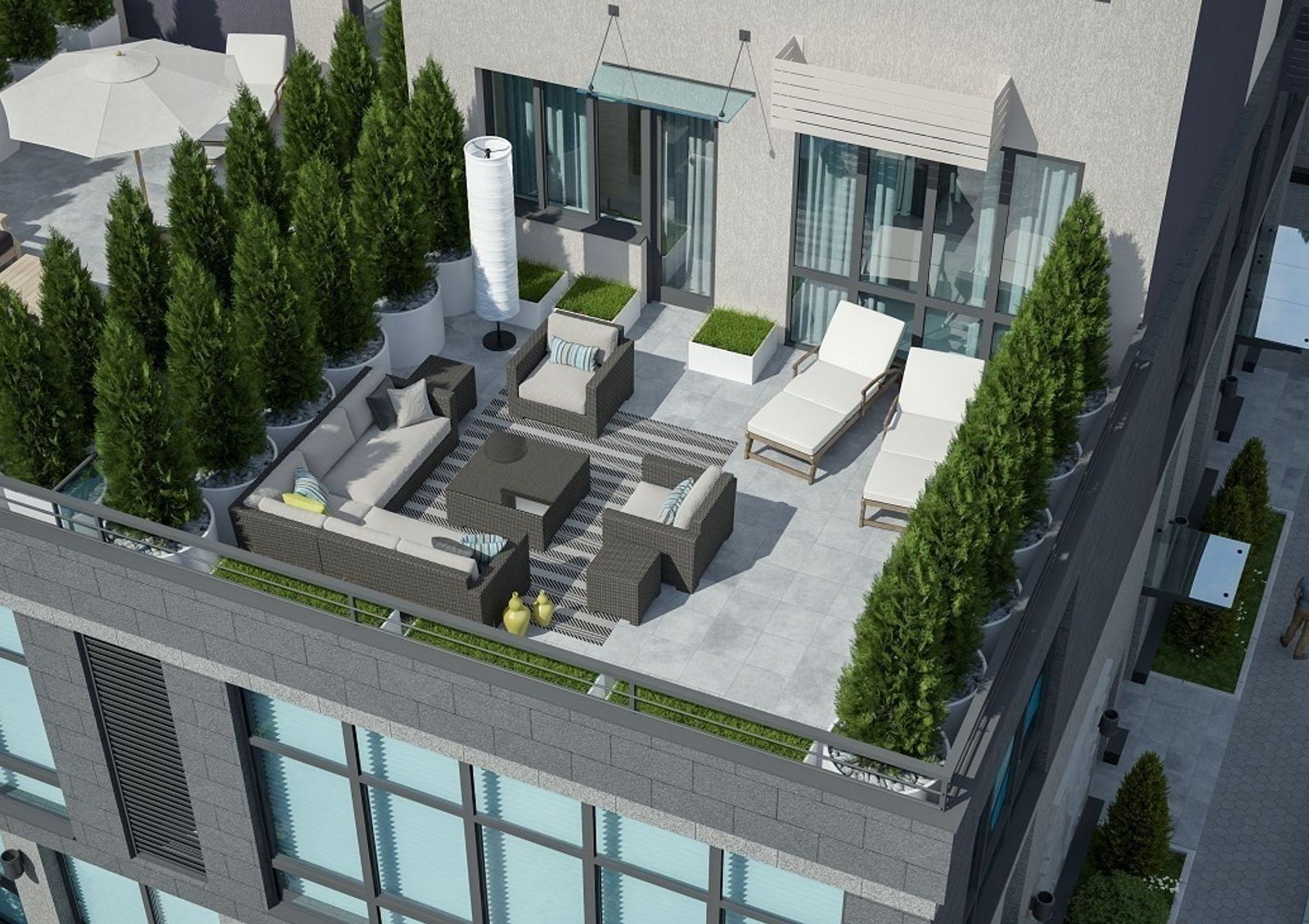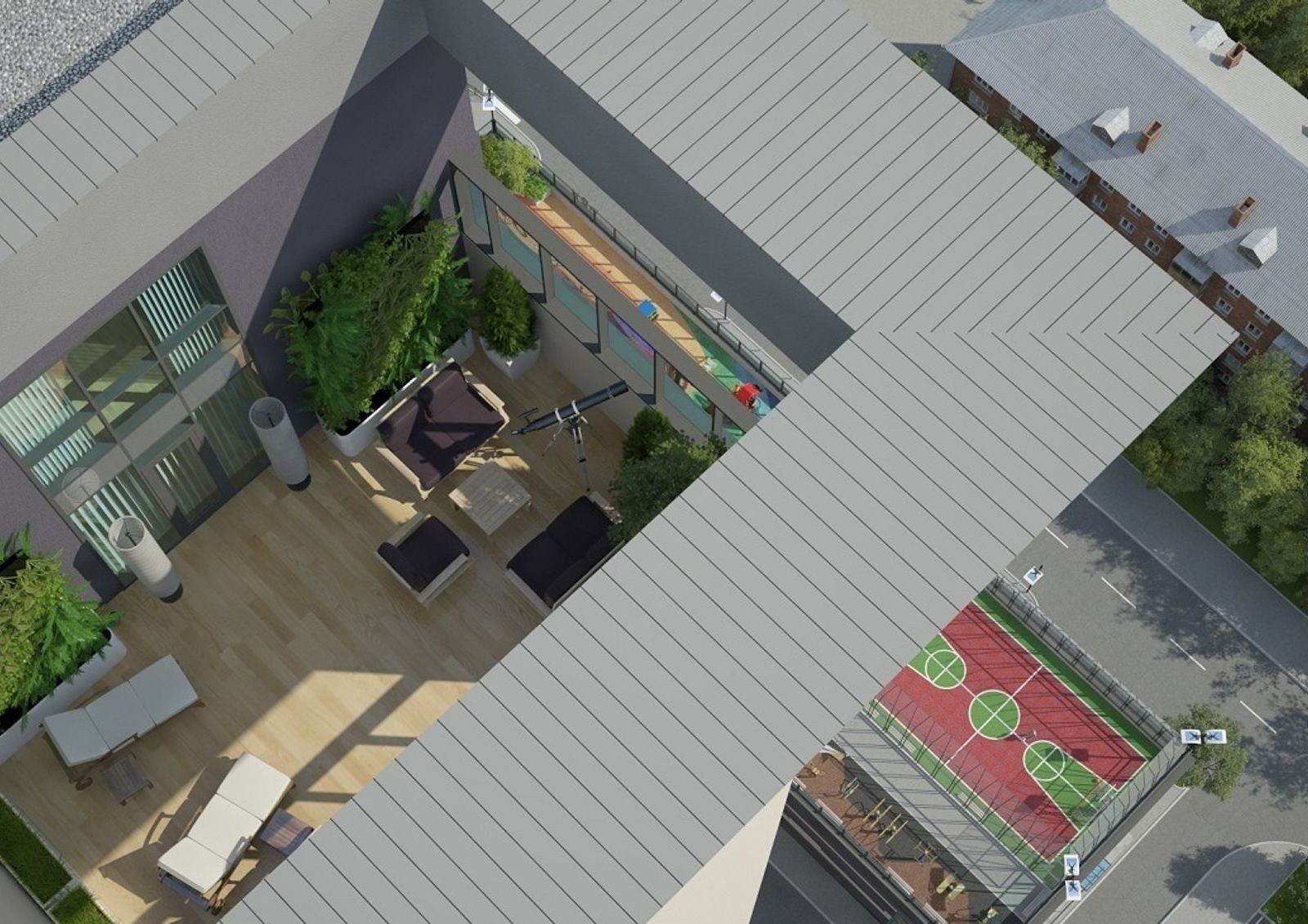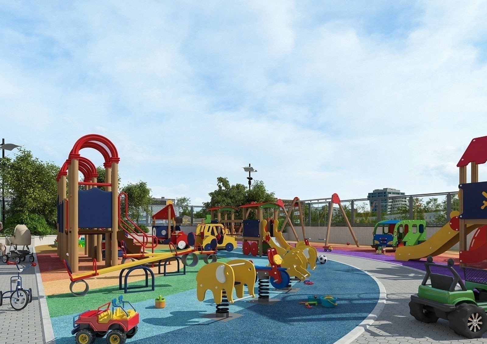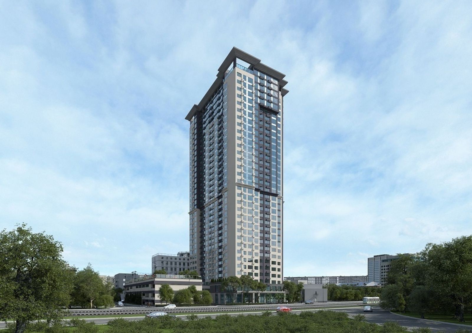 Жилой комплекс имеет уютный двор с разделением на зоны для отдыха, детских игр и занятий спортом. Для машин на придомовой территории предусмотрена гостевая стоянка, также в новостройке оборудован трехуровневый паркинг. Первые этажи дома отведены под коммерческие объекты.