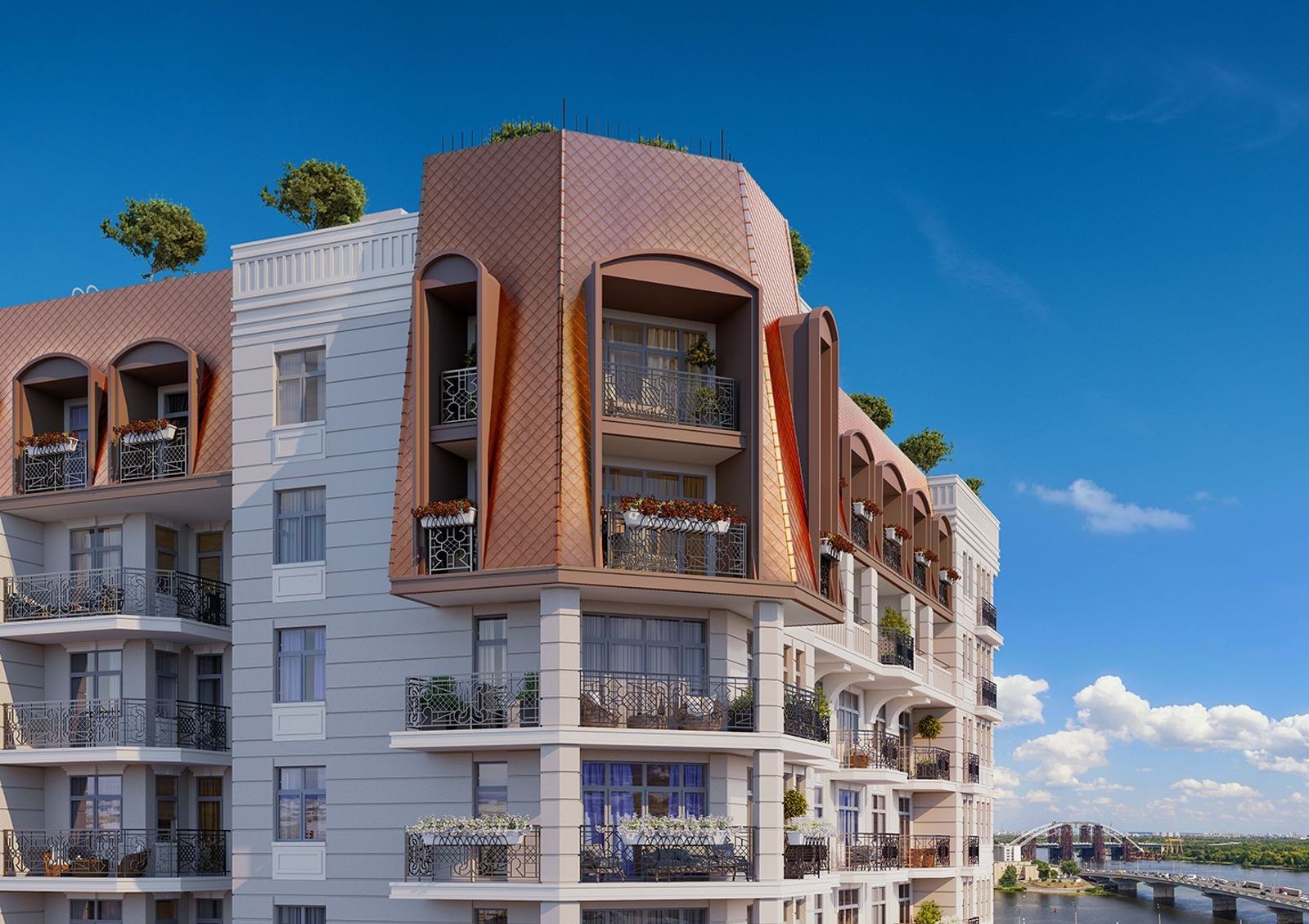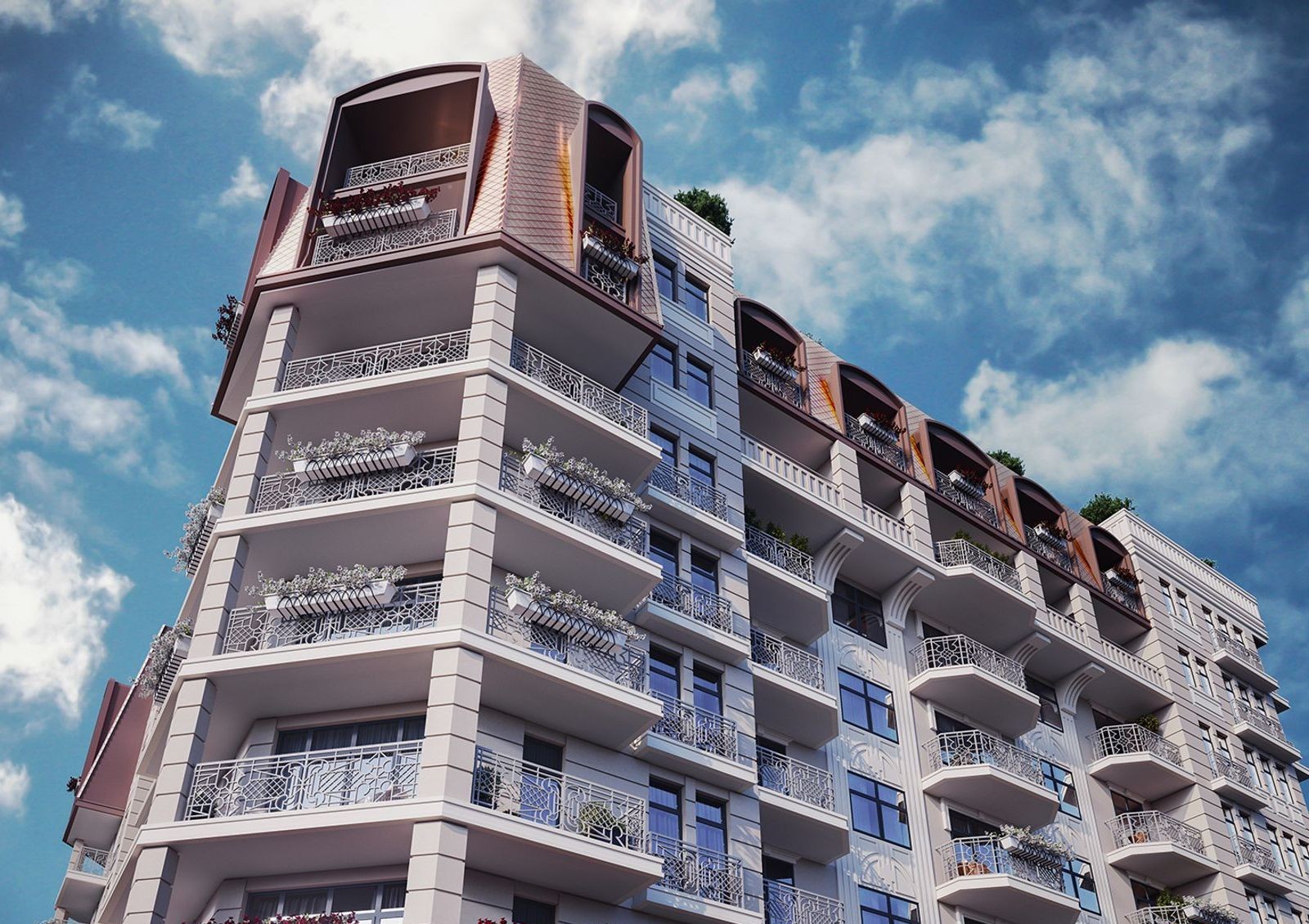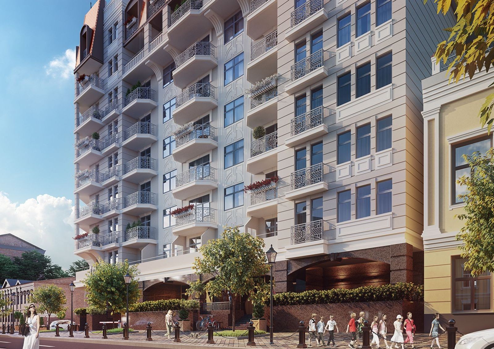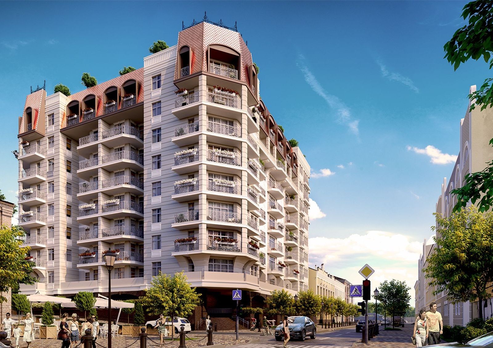Проект клубного дома Spas Sky выполнен в стиле старого Подола: небольшая этажность, применение декоративного камня, пастельные тона отделки, мансардная кровля и открытые балконы с ажурной решеткой.
