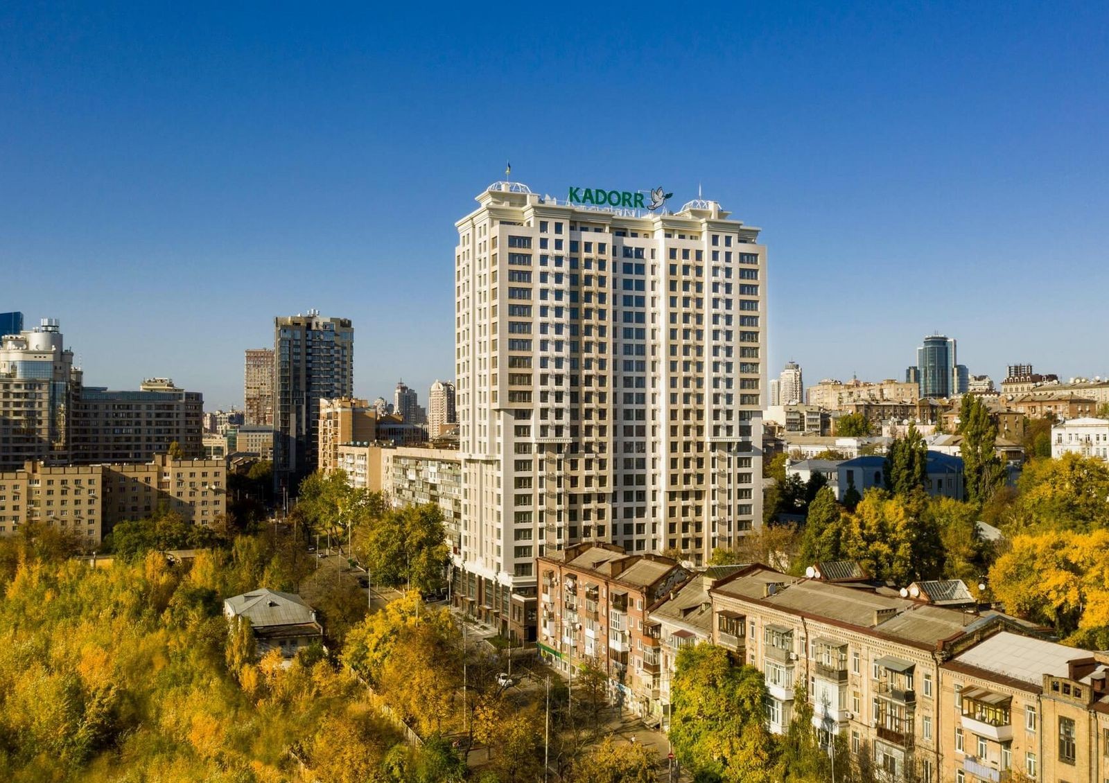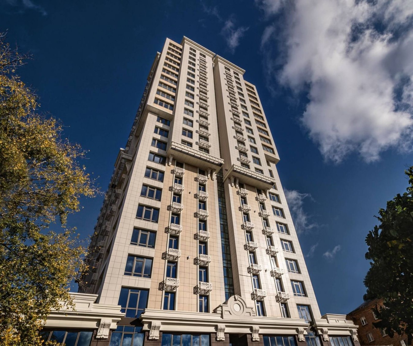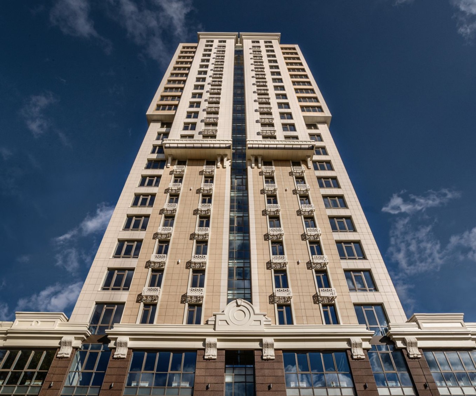 Две секции дома стоят на двухэтажной стилобатной части. Стилобат предназначен для коммерческой недвижимости и лобби зоны для жильцов комплекса. На верхних этажах в квартирах установлены панорамные окна с видами на центр Киева.