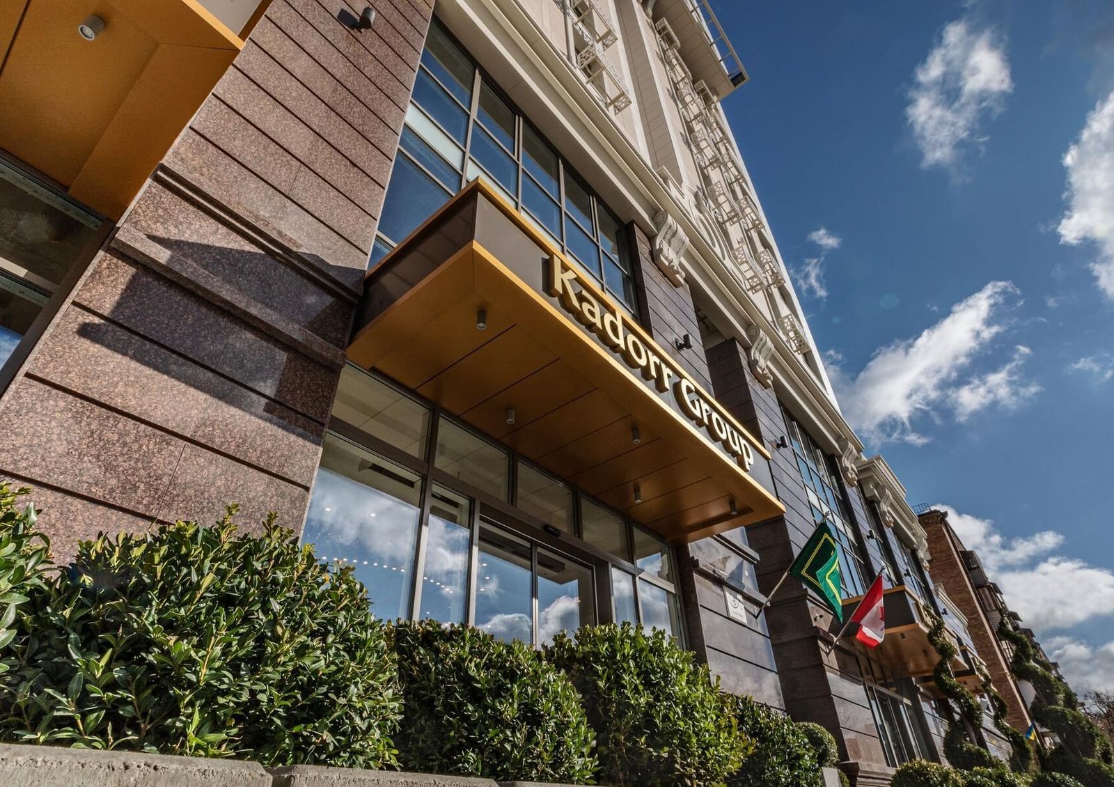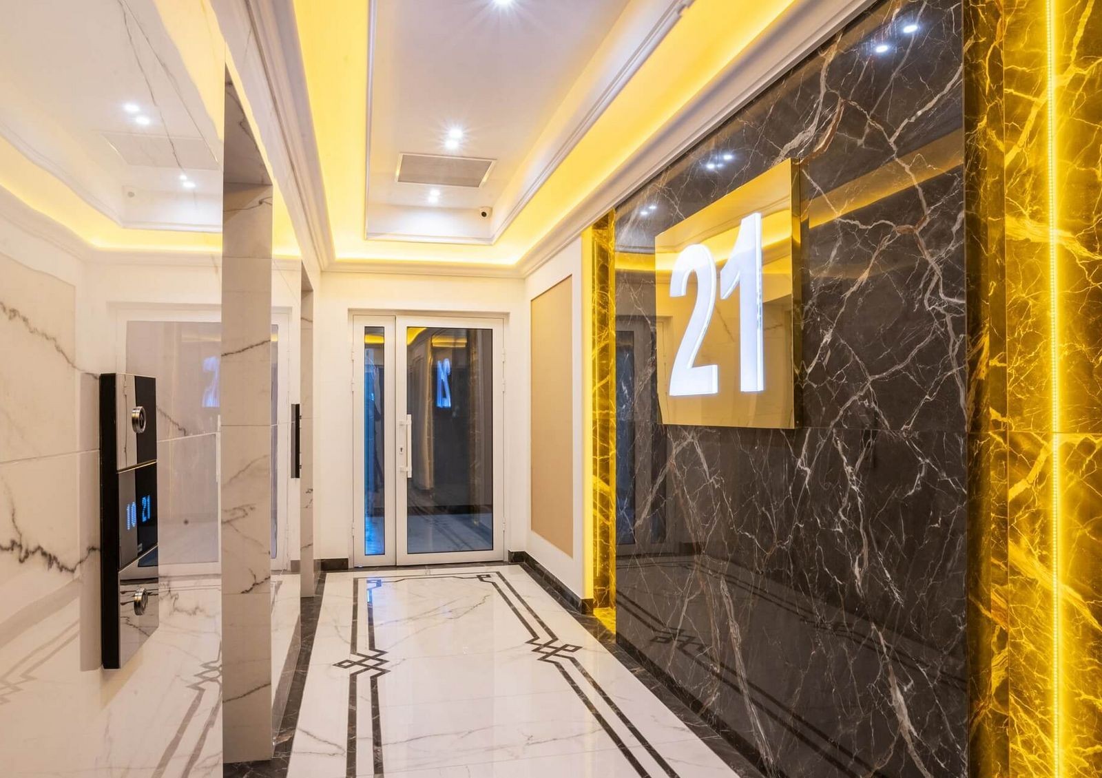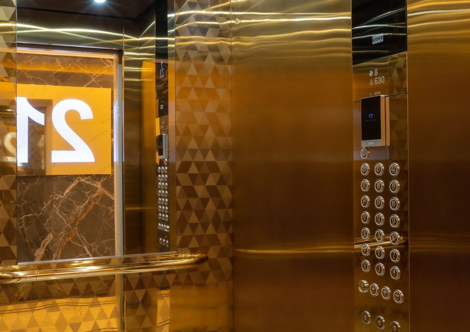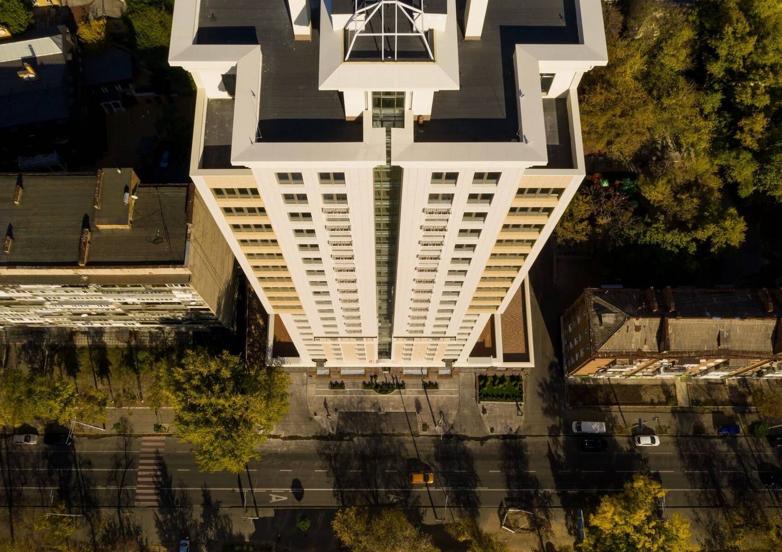 Две секции дома стоят на двухэтажной стилобатной части. Стилобат предназначен для коммерческой недвижимости и лобби зоны для жильцов комплекса. На верхних этажах в квартирах установлены панорамные окна с видами на центр Киева.