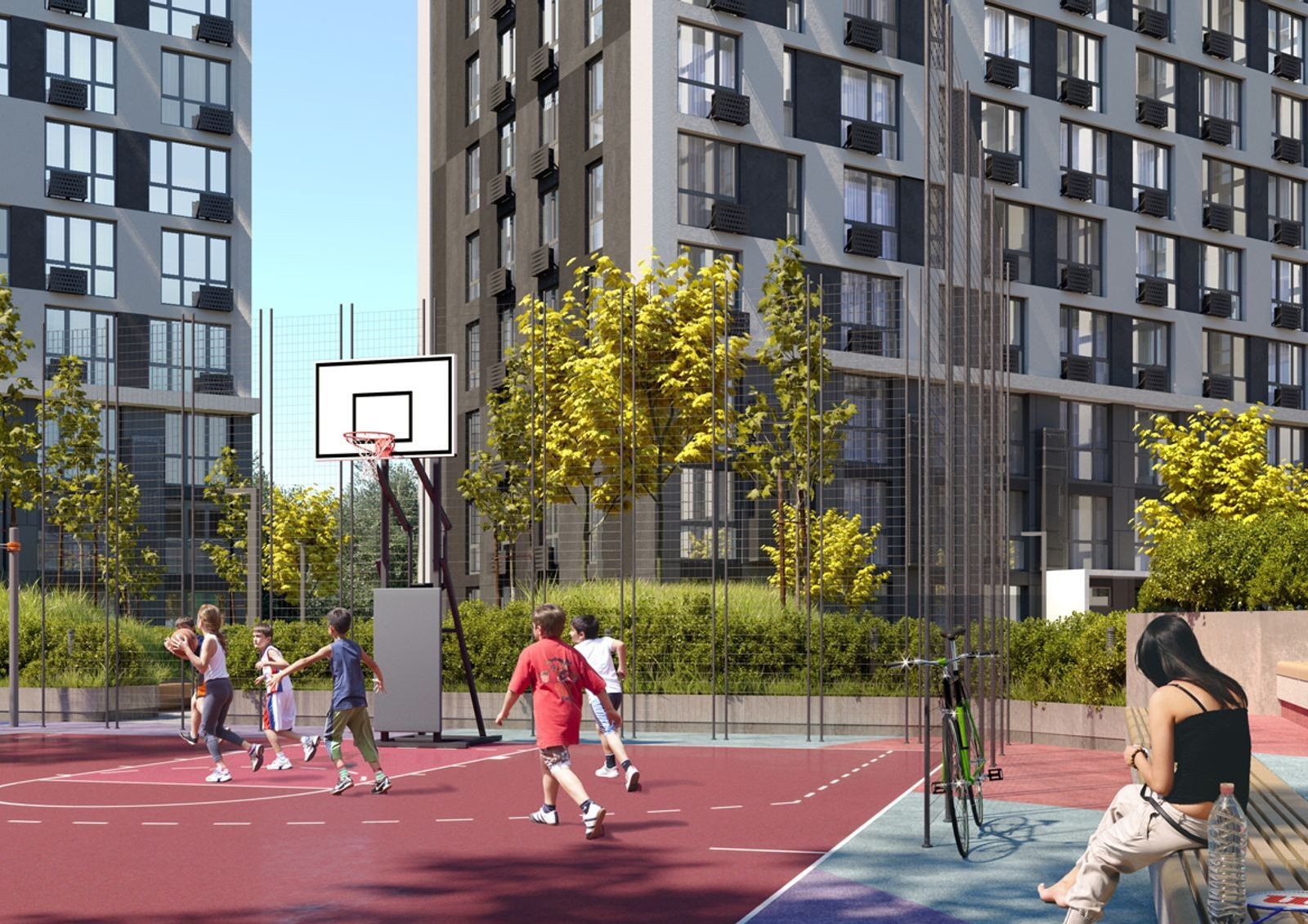 На придомовой территории реализована концепция «двор без машин» — внутренний двор комплекса «Славутич 2.0» разделен на детскую, спортивную и прогулочную зоны, которые между собой соединены пешеходными аллеями.