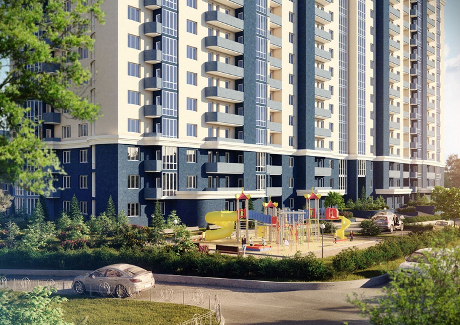 Оформление жилого комплекса «Старокиевский» выполнено так, что в ясную погоду дом сливается с небом, благодаря отделке светлыми оттенками синего и бежевого. Чтобы озеленить внутренний двор, дизайнеры ландшафта высадили более 700 декоративных кустов, включая хвойные породы.