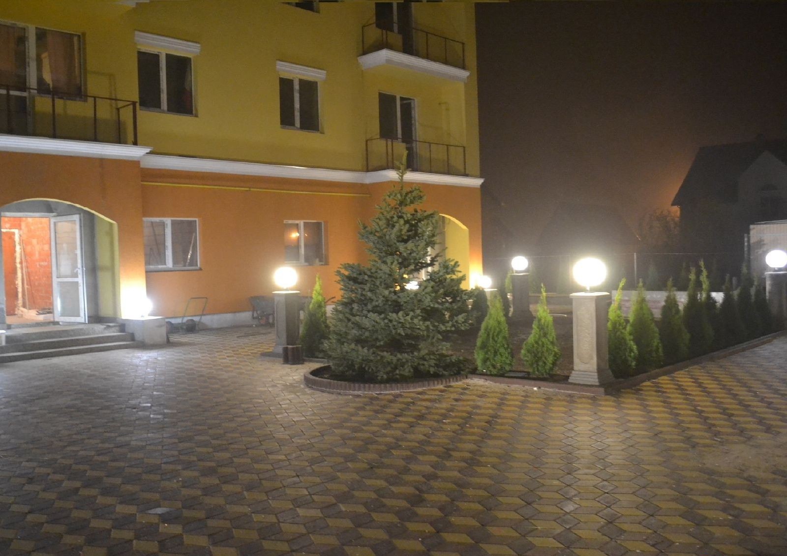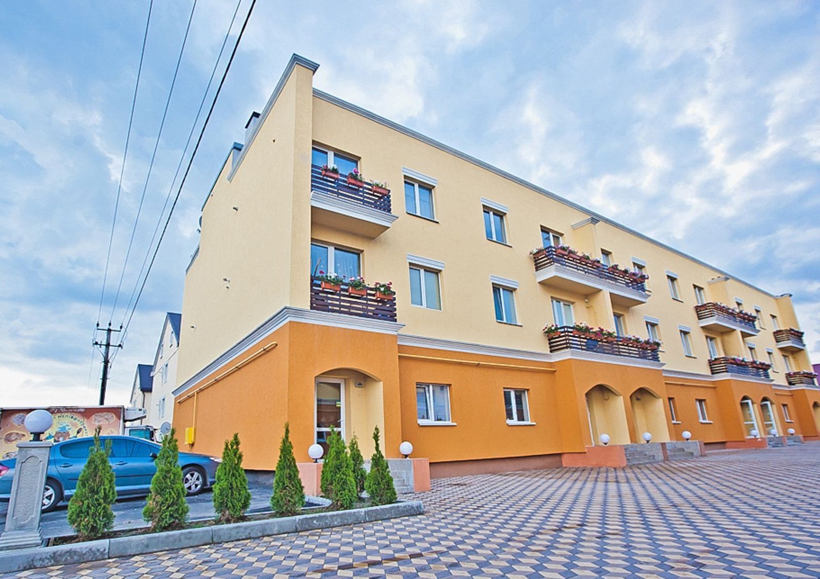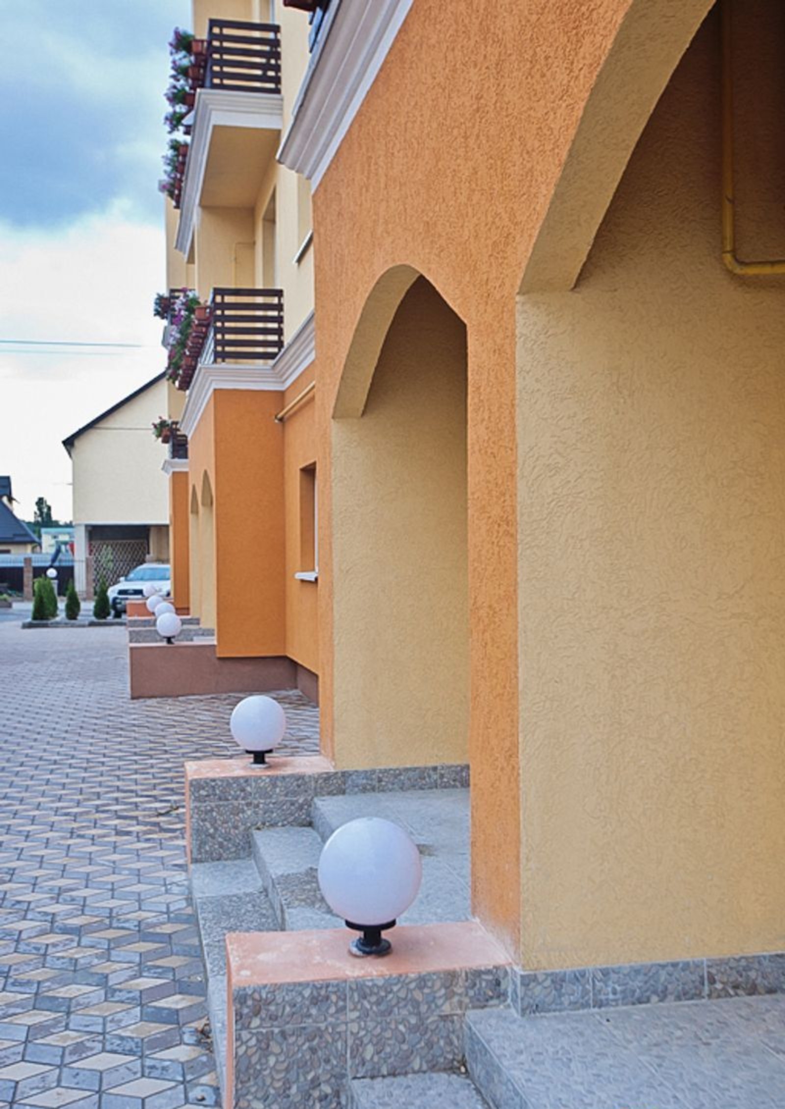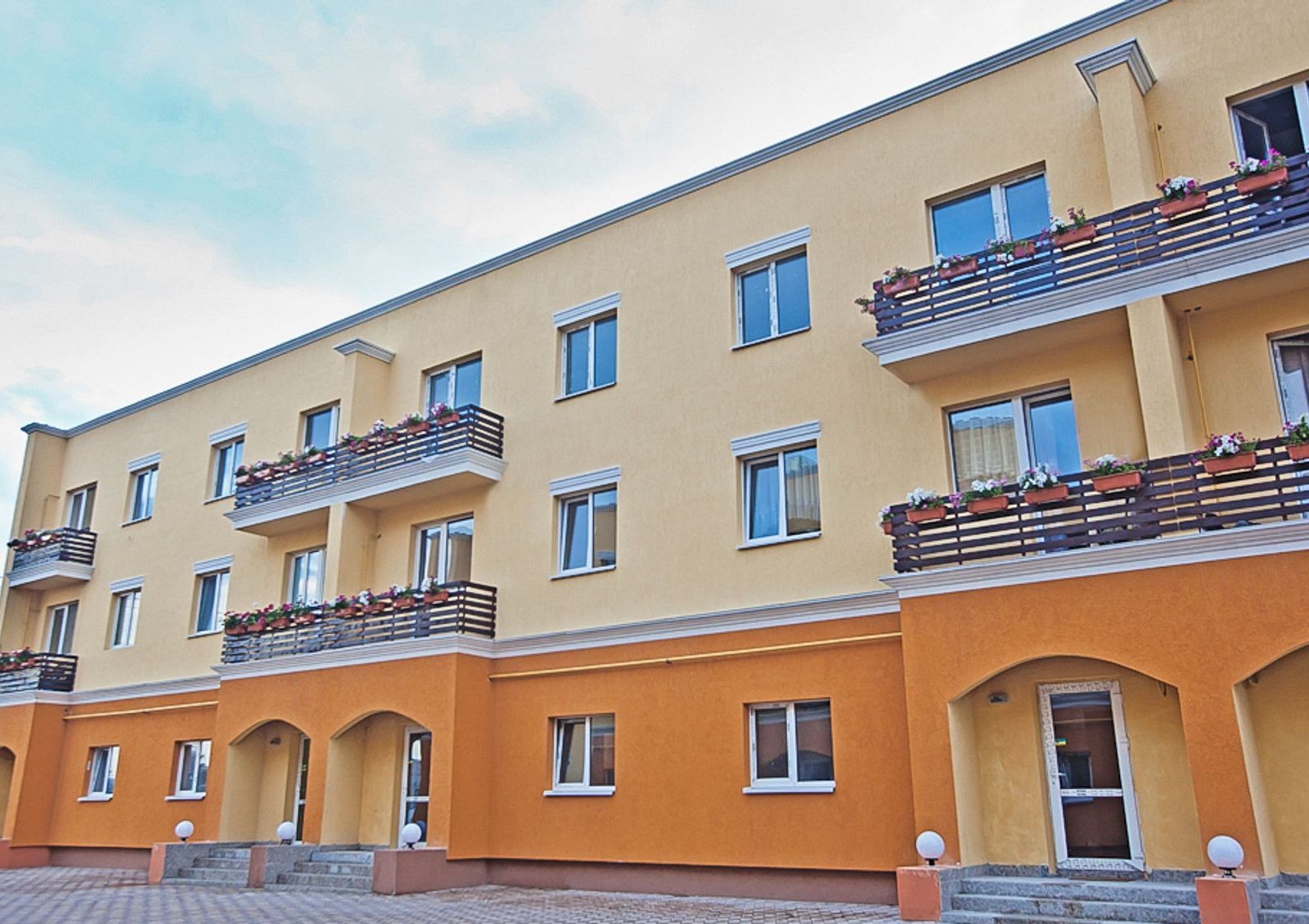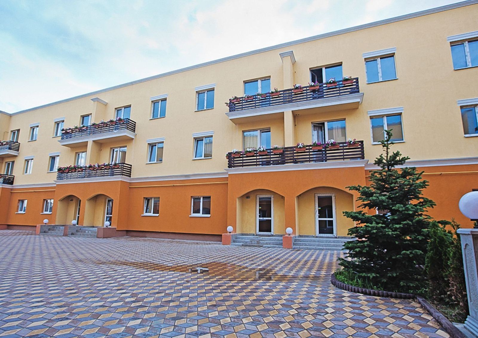 Выполнены работы по комплексному благоустройству территории новостройки. Внутренний дворик выложен тротуарной плиткой, установлены современные уличные осветительные приборы возле каждого подъезда. Организован наземный паркинг, высажены декоративные кустарники и деревья.