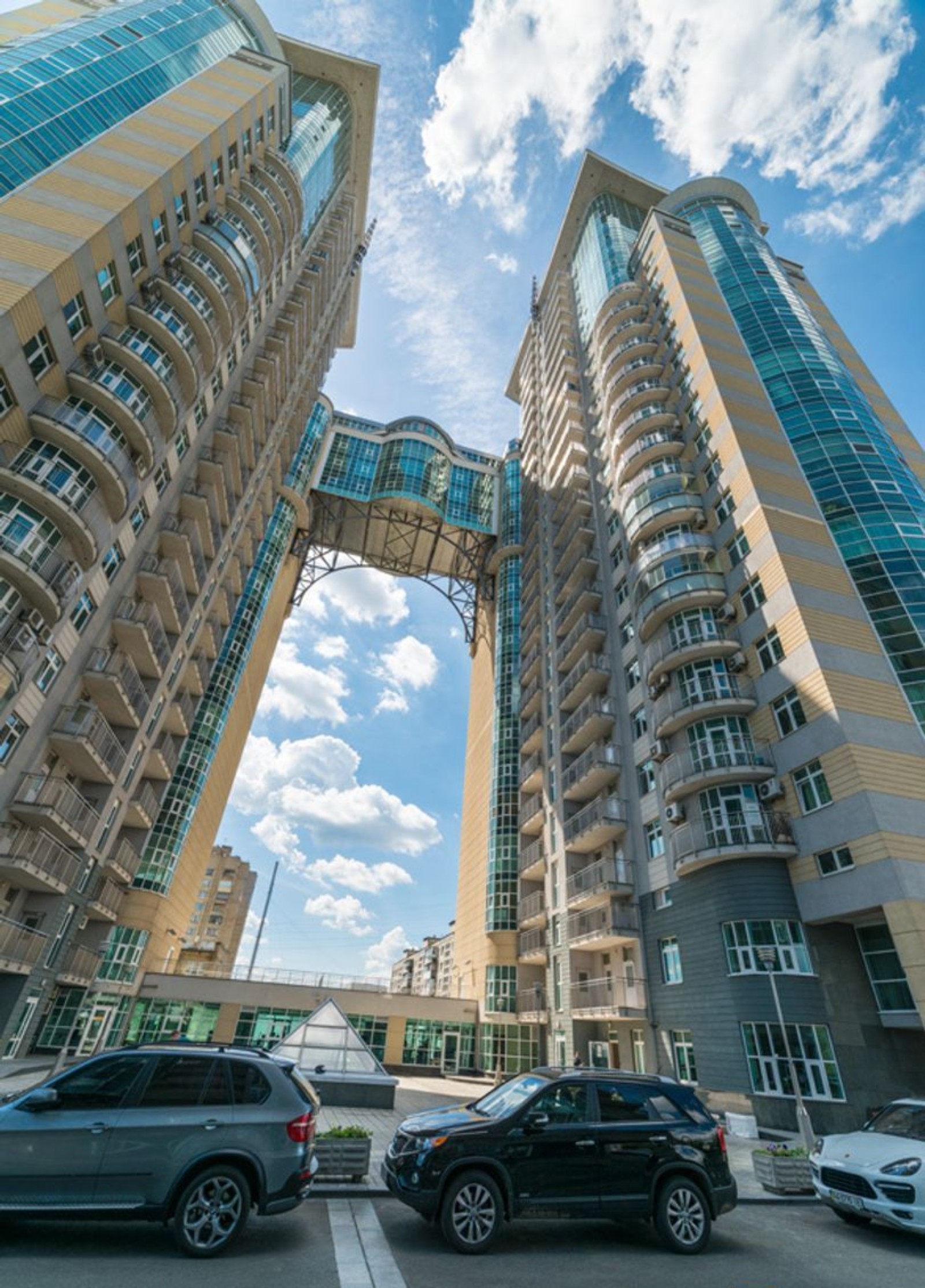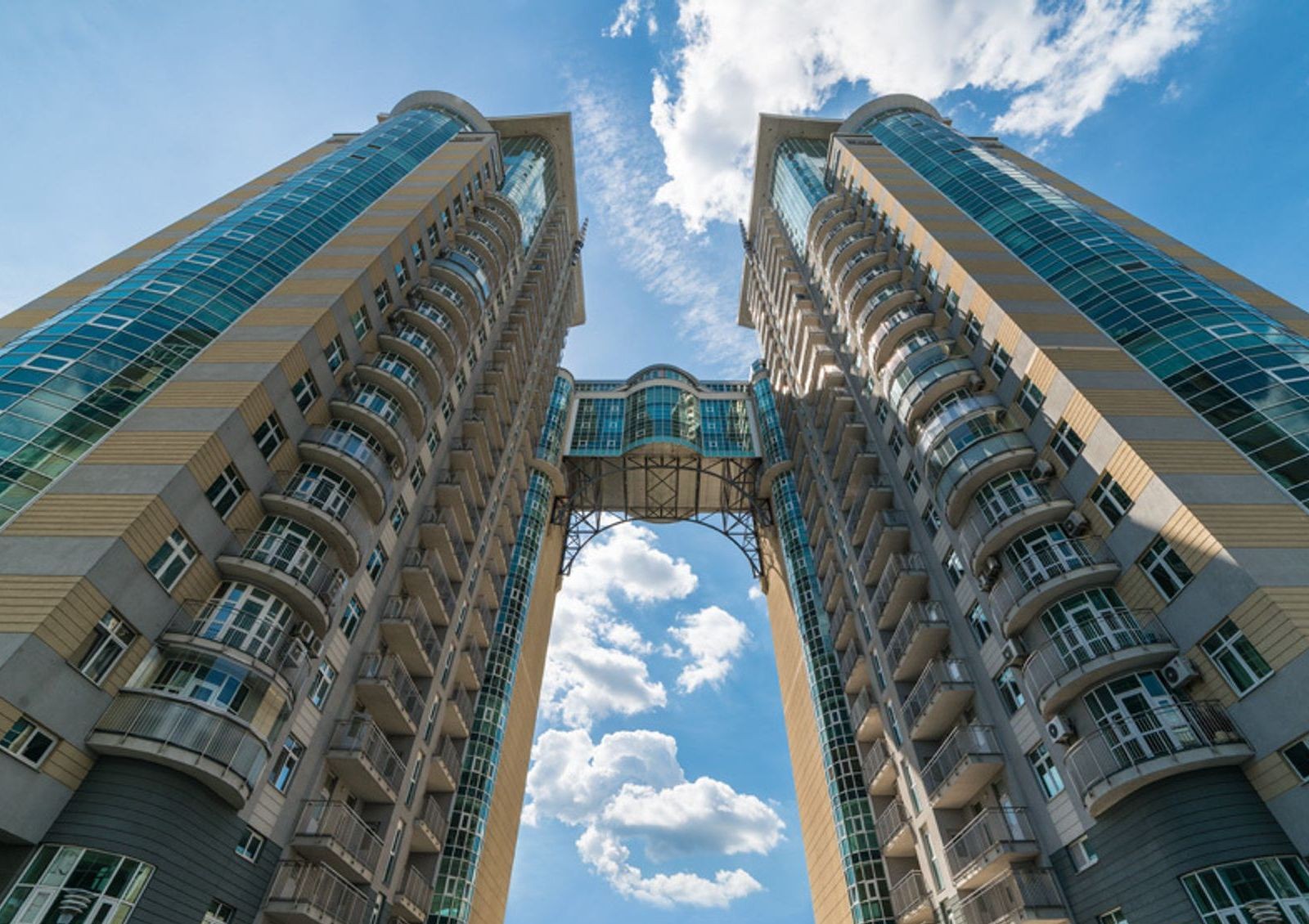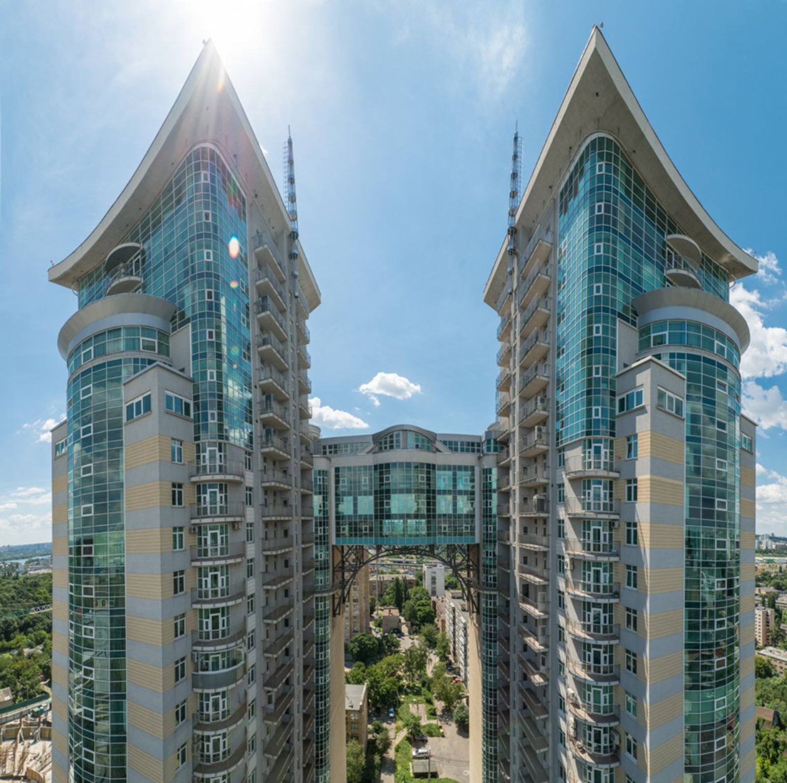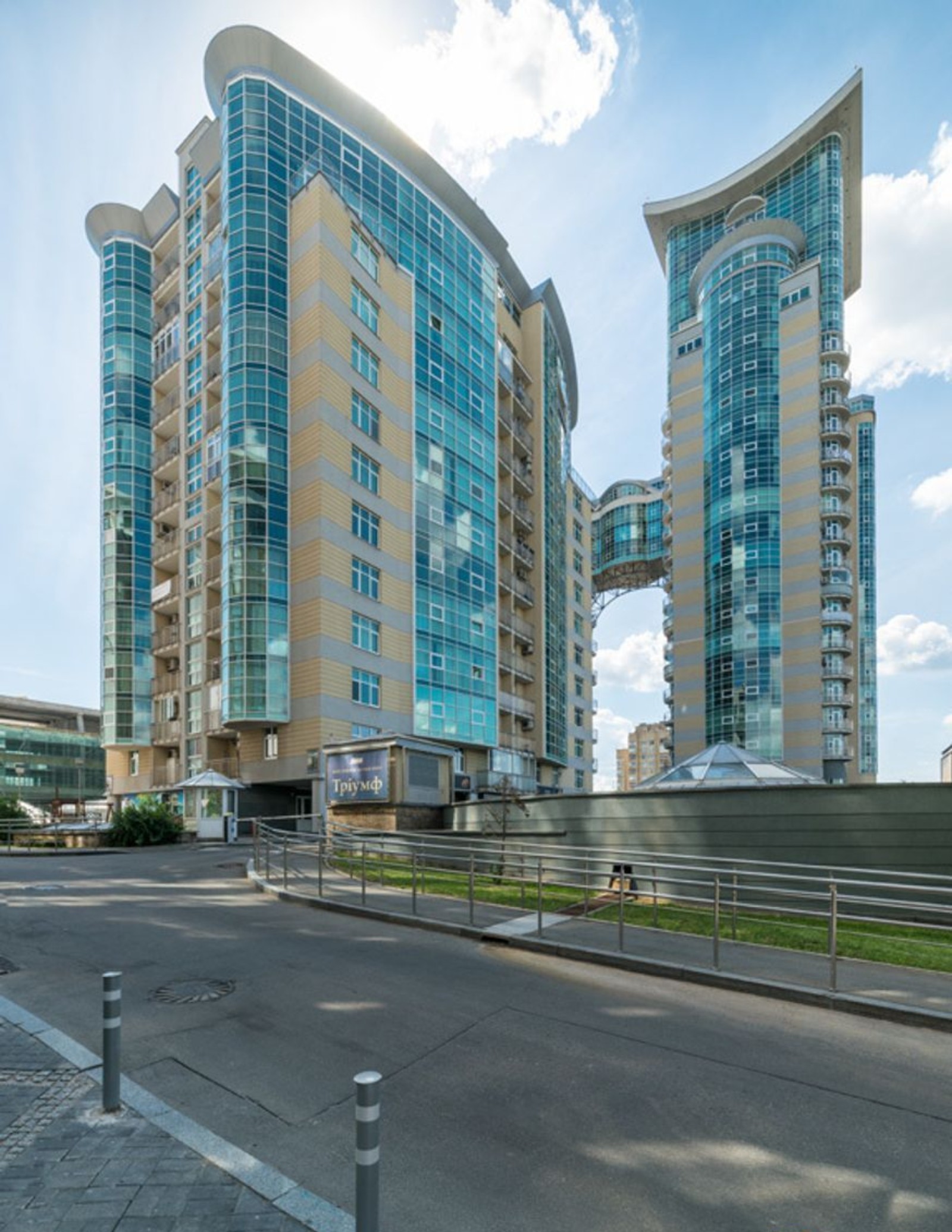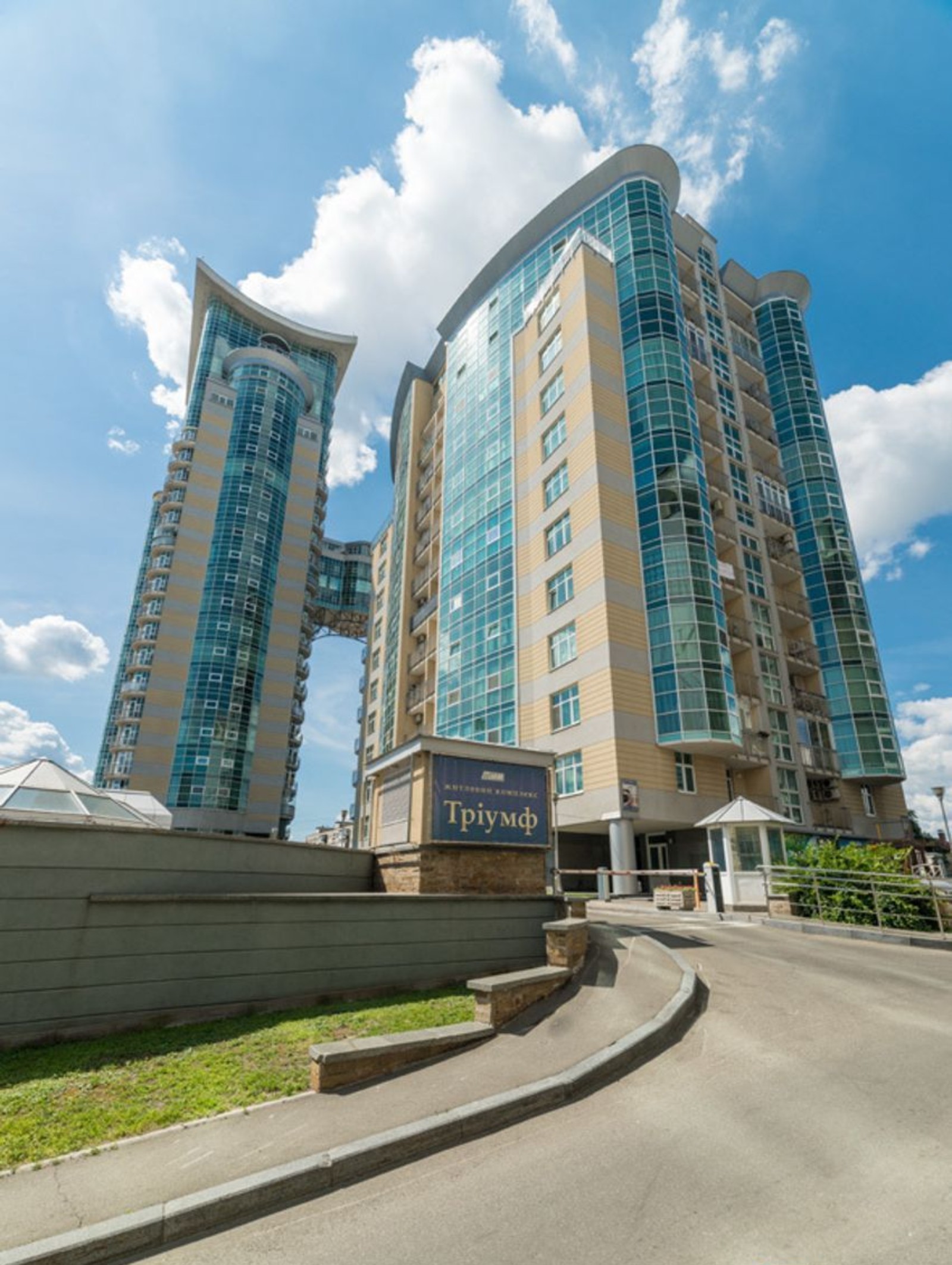 ЖК «Триумф» на ул. Зверинецкая, 59 – это монолитно-каркасный дом из трех секций. Двадцатипятиэтажные башни соединены между собой переходом, расположенным на высоте семнадцатого-девятнадцатого этажей.