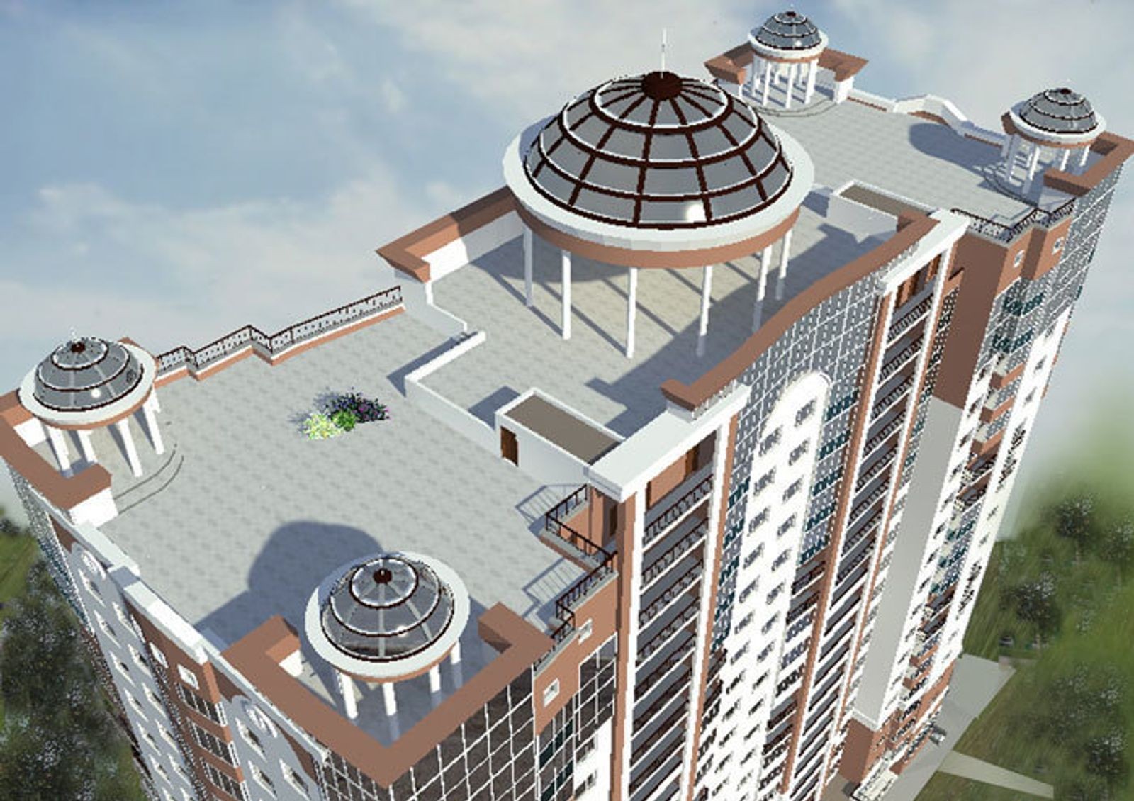 В одном из популярных районов Харькова возводят ЖК "Дом с ротондами". Изюминку этому зданию придает эксплуатируемая кровля. На крыше будет расположено пять ротонд, то есть пять круглых небольших сооружений с куполом. "Дом с ротондами" Так же дом уникален тем, что возводится по собственным технологиям строительства