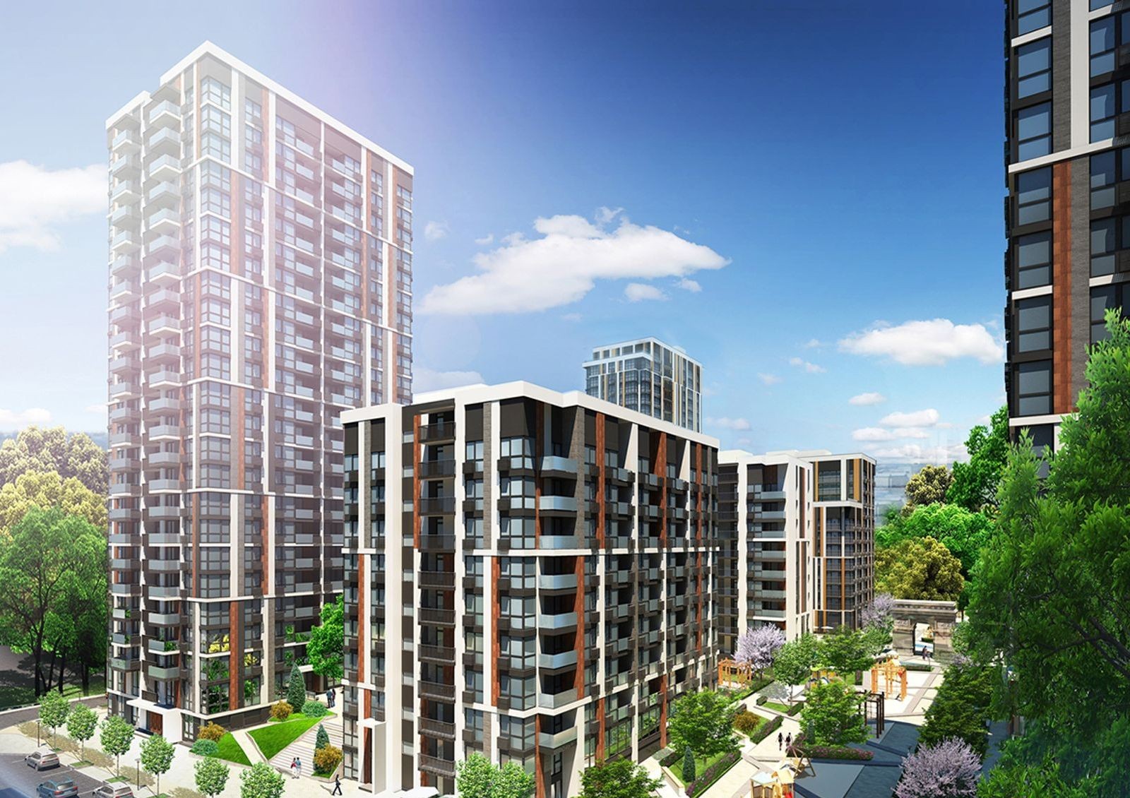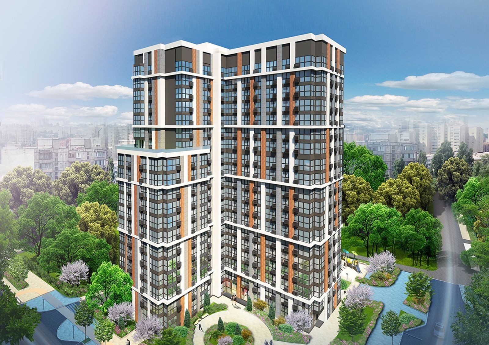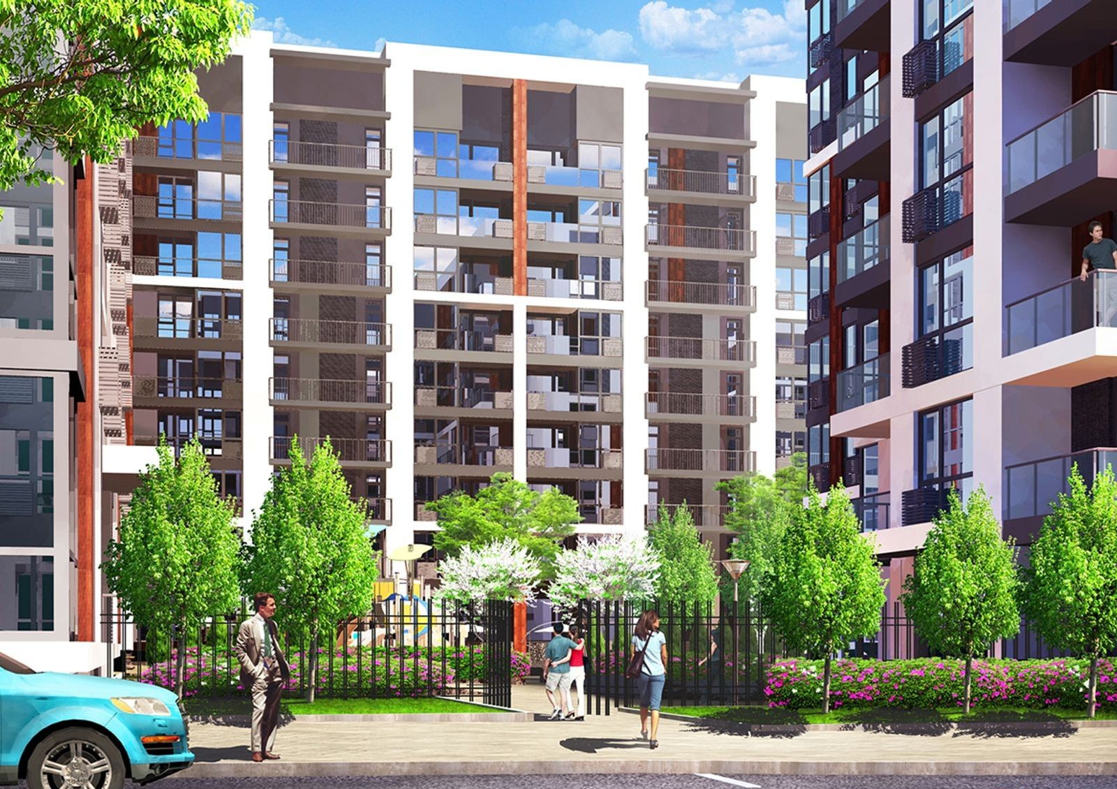 На фоне застройки района, «Французский квартал 2» выделяется единой концепцией, яркими элементами фасадов и панорамными окнами на всю высоту этажа. Чтобы во дворах комплекса было больше солнечного света применена разная этажность домов.