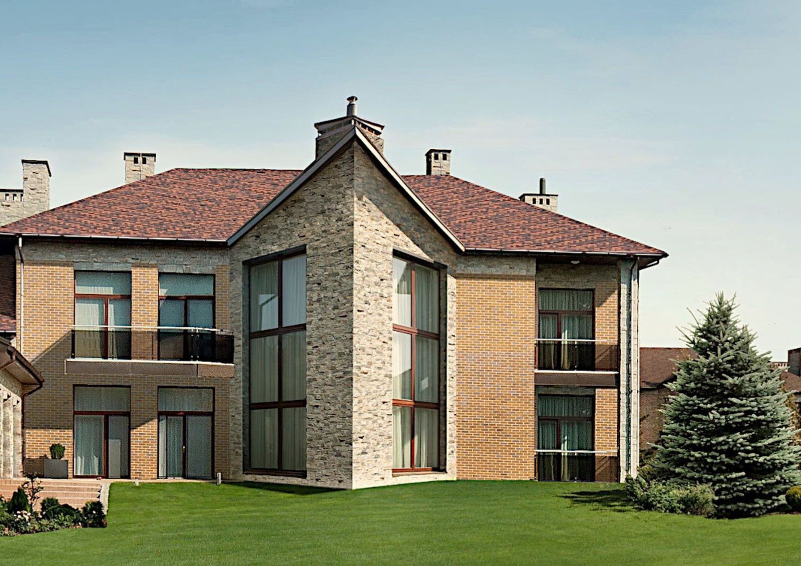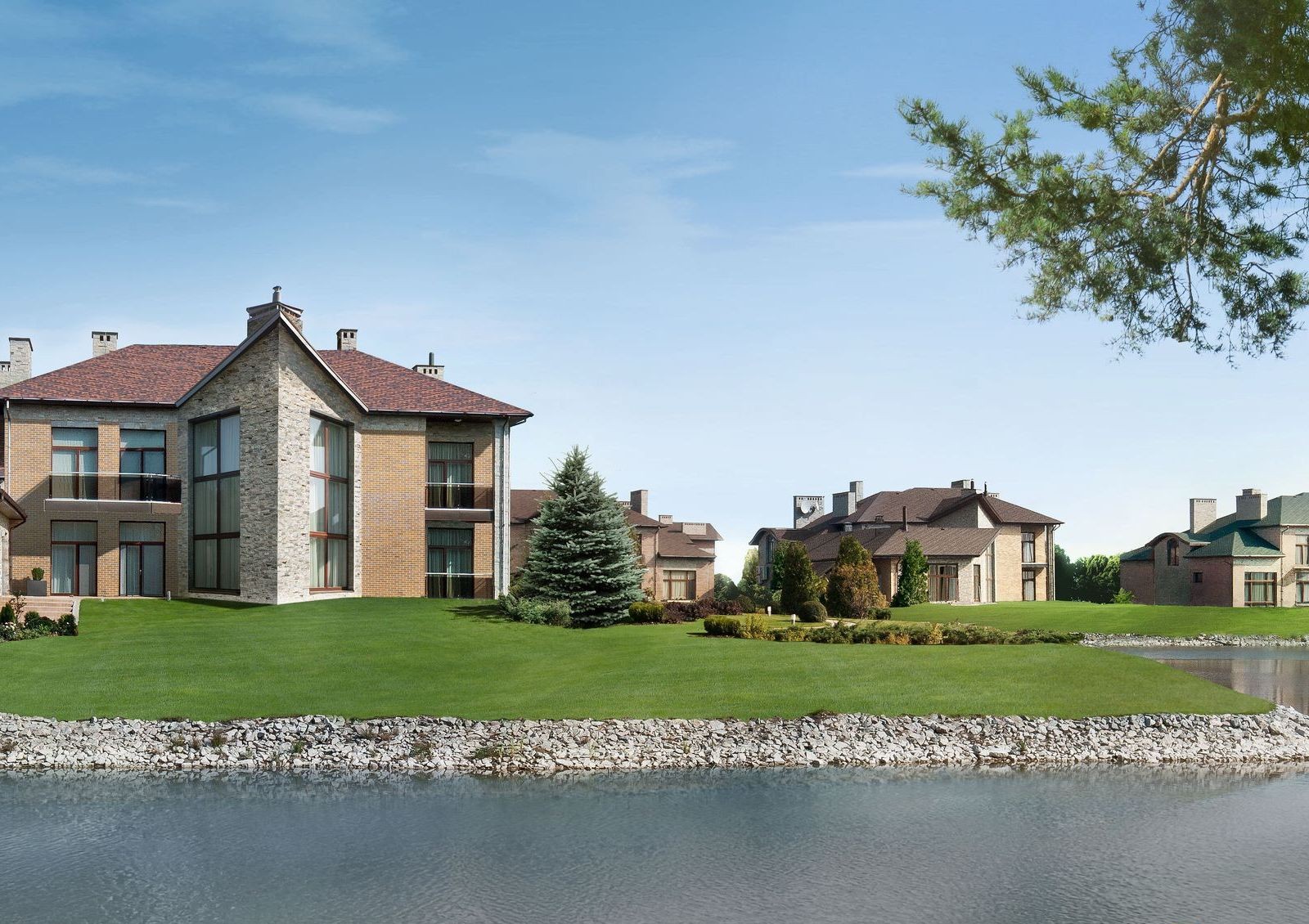 Специально для поселка архитекторы создали несколько типовых проектов коттеджей. Отличительная черта всех новых домов – наличие больших панорамных окон. Жилая площадь включает в себя просторную гостиную, кухню, несколько спален. Планировки функциональные и современные. Коттеджи оснащены гаражами для 2 автомобилей.