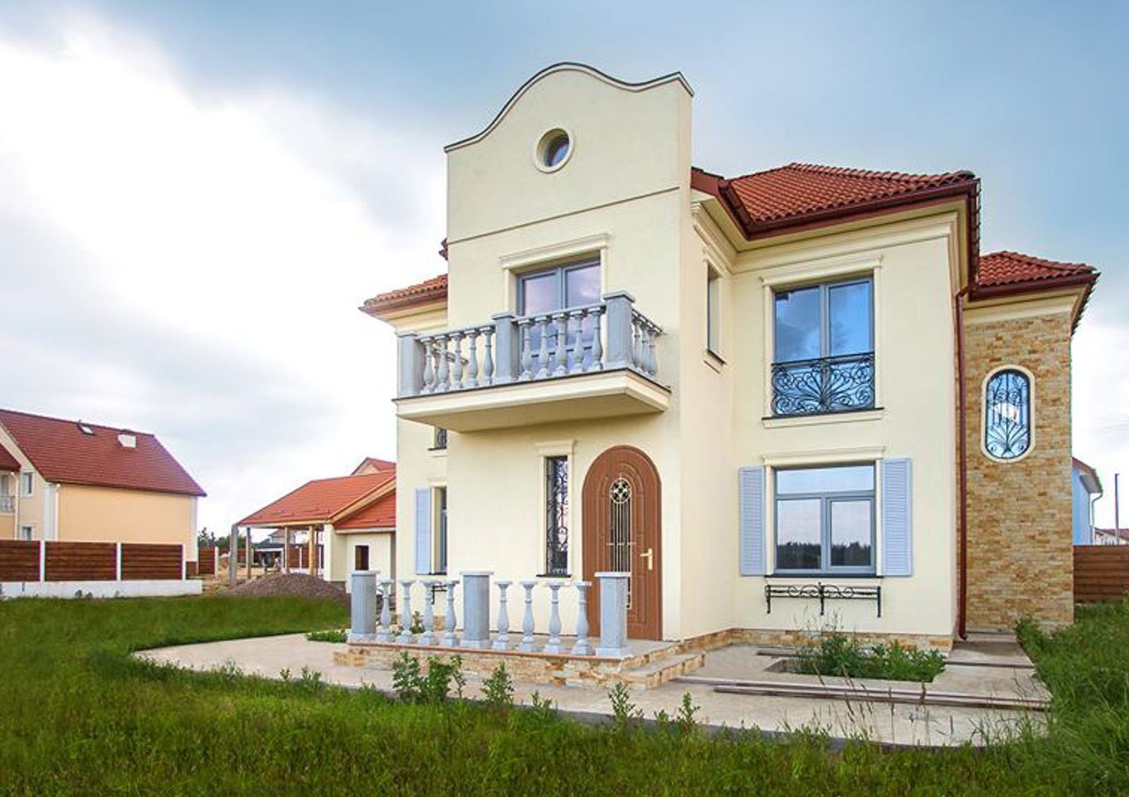 Строительство домов осуществляется по Васту, что подразумевает ведическую архитектуру. В качестве материала для стен выбран красный керамический кирпич, для перекрытий и лестниц – монолитный железобетон, для крыши – полимер-песчаная или металлочерепица с базальтовым утеплением. Застройщик выполняет наружную отделку, утепление и декор фасада.