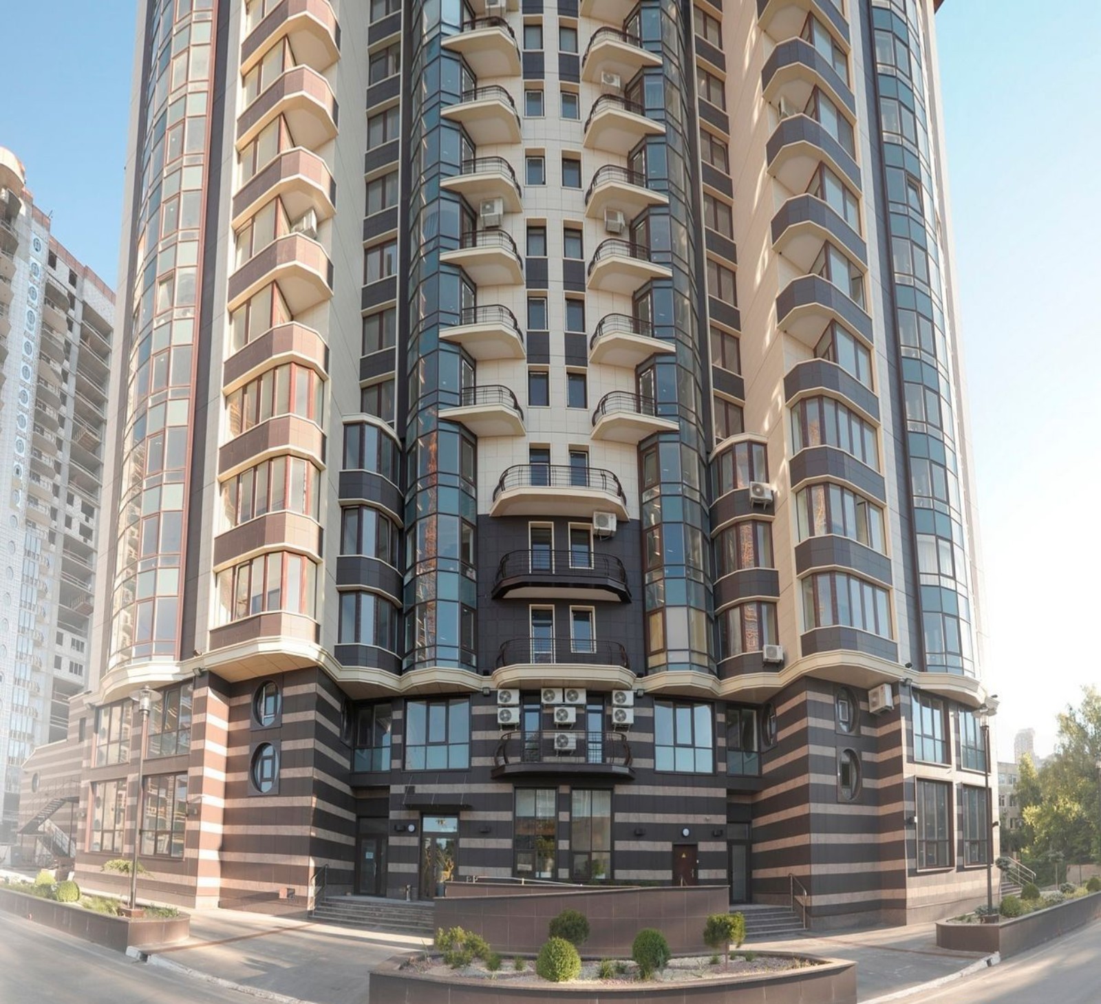 ЖК «Престиж Холл» на ул. Анри Барбюса, 37/1 сооружается в несколько этапов, первая секция разноэтажного здания эксплуатируется с 2011 года.