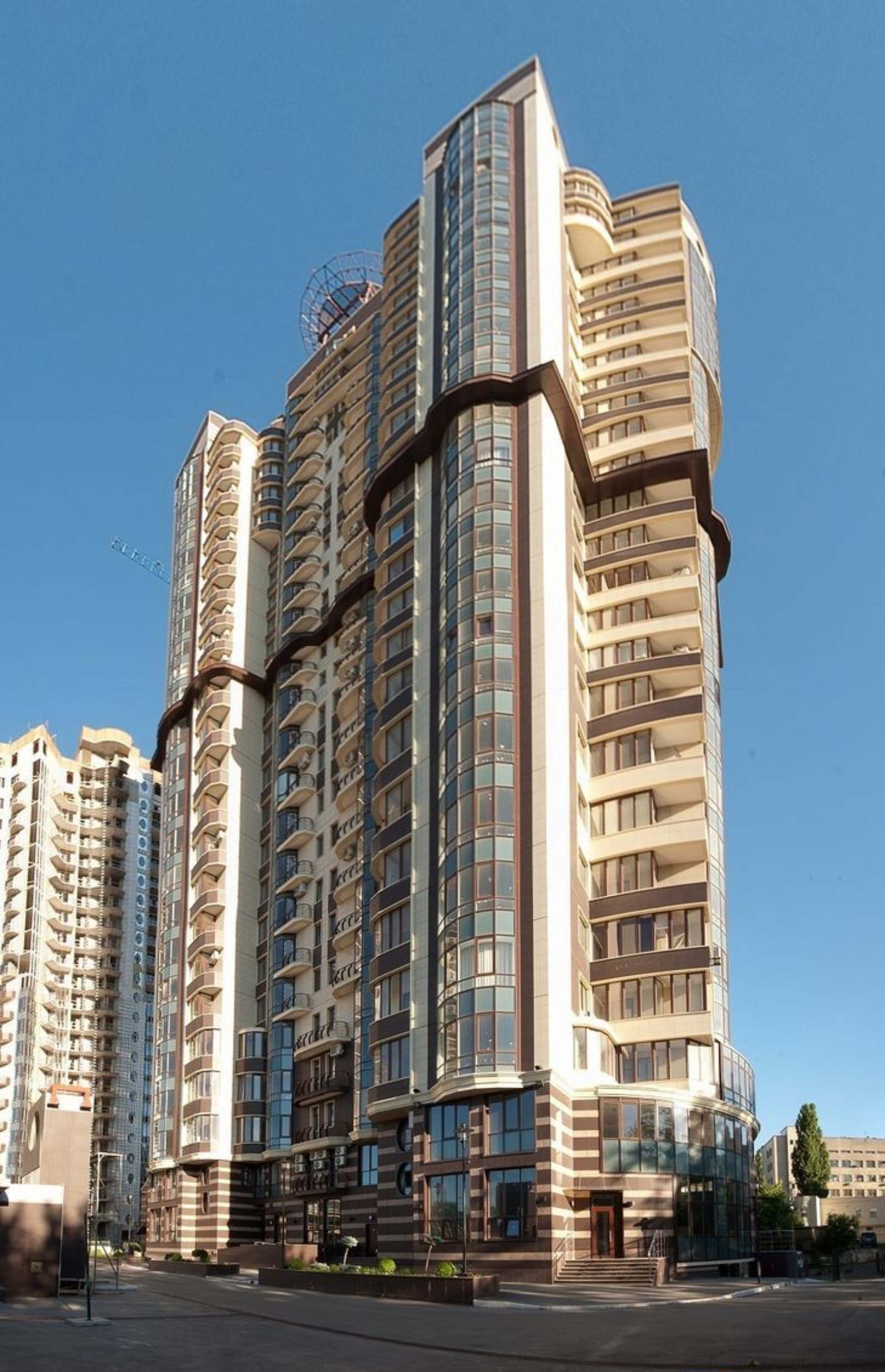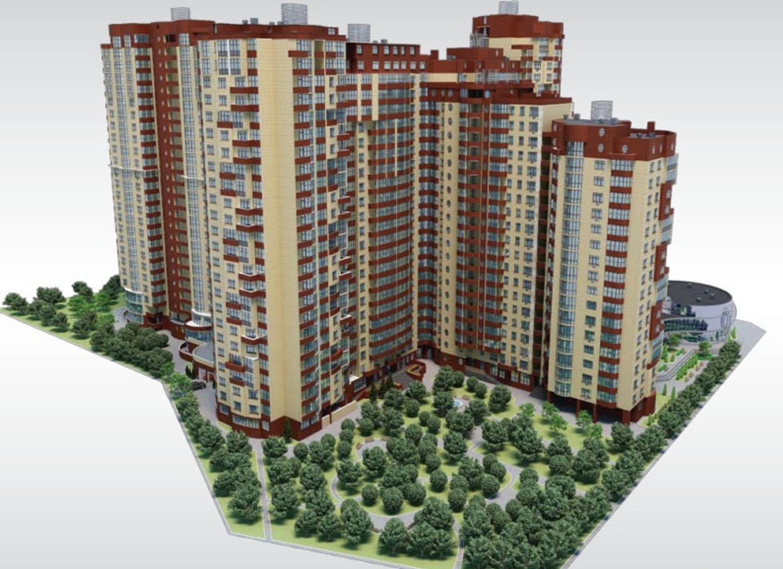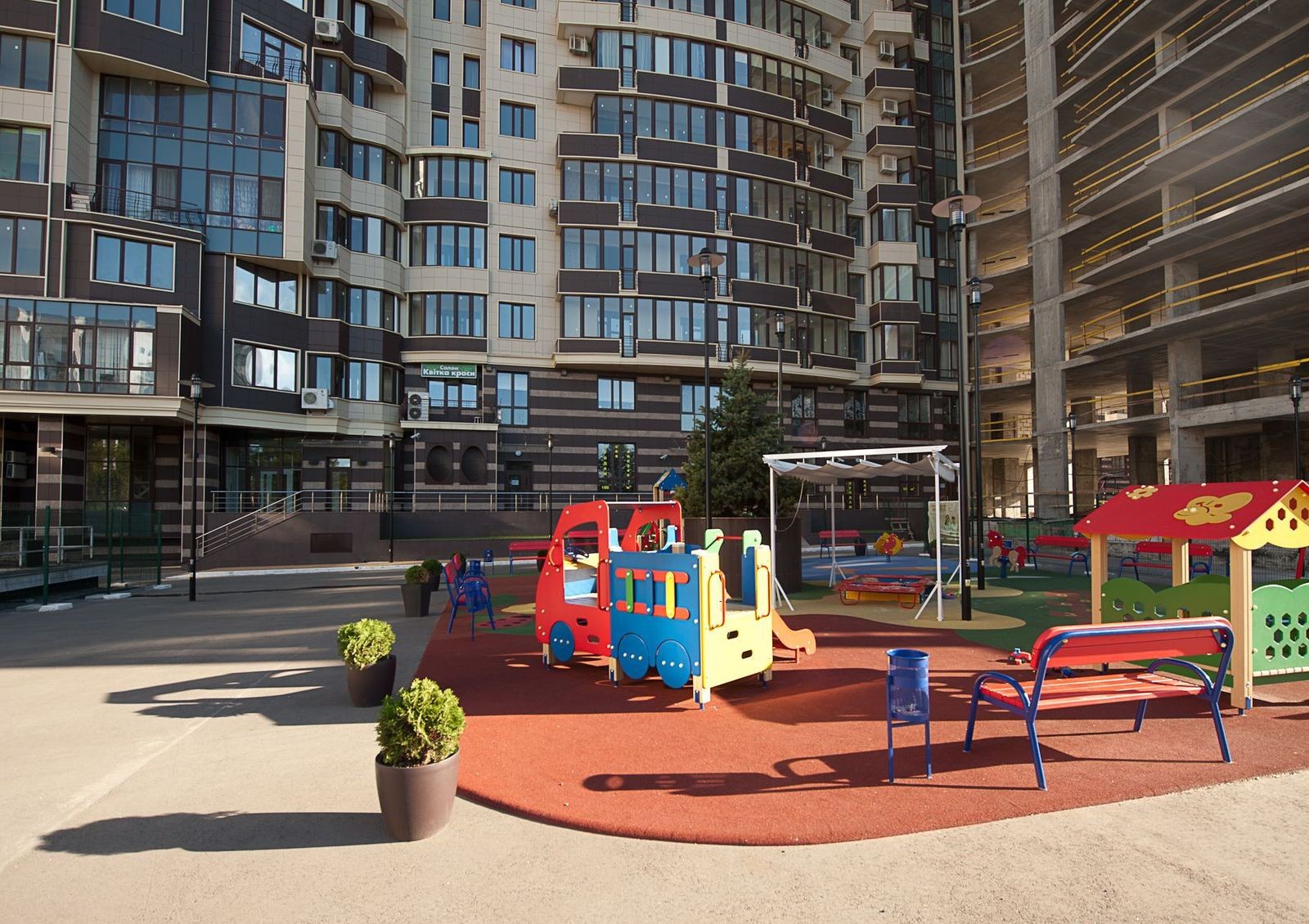На нижнем этаже комплекса располагаются объекты собственной инфраструктуры. Оборудуется двухуровневый подземный паркинг. Территория закрыта для автомашин и посторонних, сооружается хорошо оснащенная современная детская площадка.