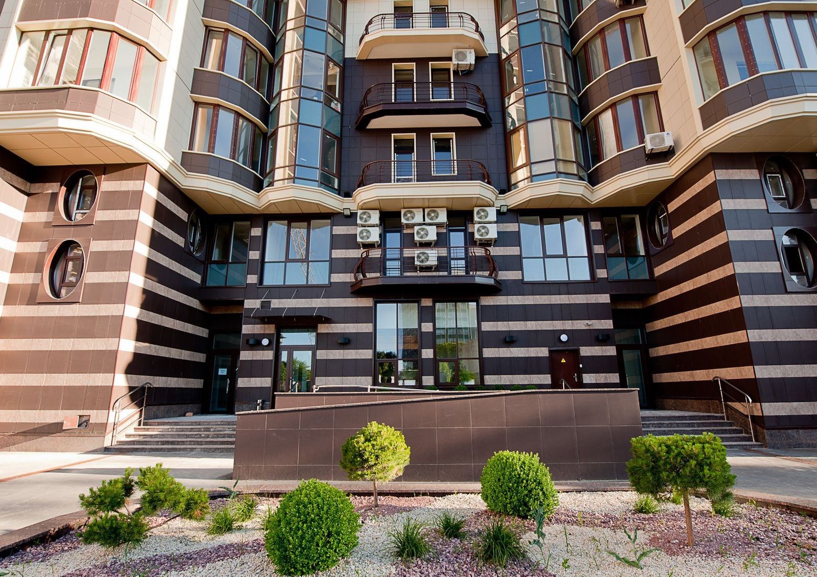 Фасад облицовывается вентилируемыми панелями с облицовкой керамогранитом. Здание оснащается двухуровневой системой очистки питьевой воды.