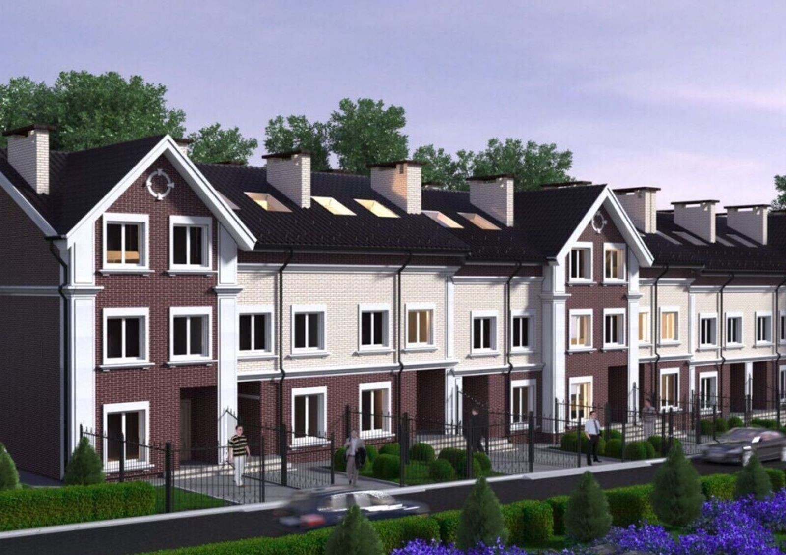 Двор выложен тротуарной плиткой, использовать его можно для парковки авто или в качестве зоны отдыха. Таунхаусы оснащены двумя выходами, один из которых ведет на задний дворик. Территория ограждена забором, есть ворота для въезда на участок и калитка.