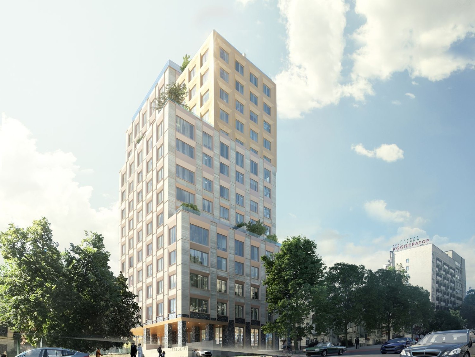 Новостройка спроектирована в современном стиле. Жилой комплекс «Резидент Концепт Хаус» относится к недвижимости бизнес-класса. Он соединяет в себе высокую функциональность жилого и общественного здания.