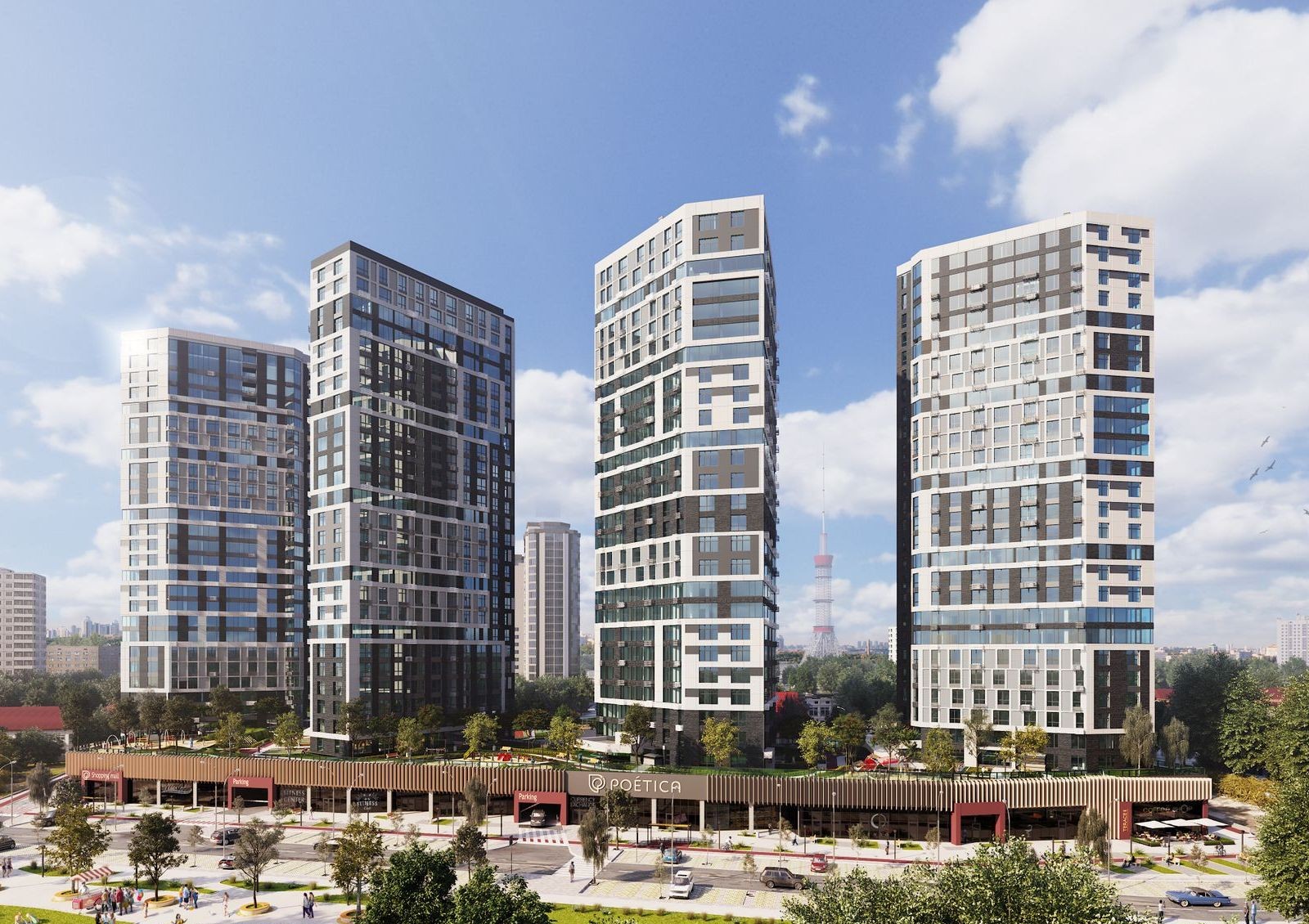 Poetica — жилой комплекс с узнаваемой архитектурой и концепцией автономной инфраструктуры в центре города. Дома комплекса расположены таким образом, чтобы как можно в большем количестве квартир были виды на парк и город. Помогают улучшить обзорность панорамные окна на всю высоту этажа, которые также позволяют естественному освещению лучше попадать в комнаты.