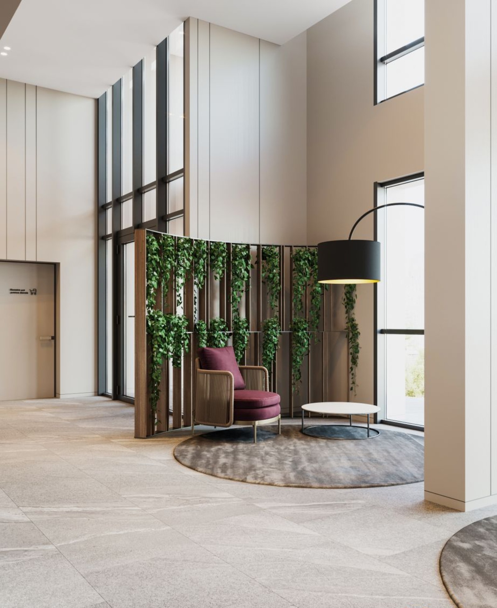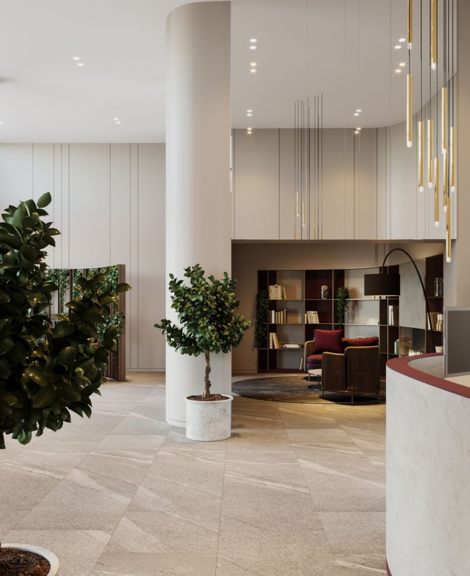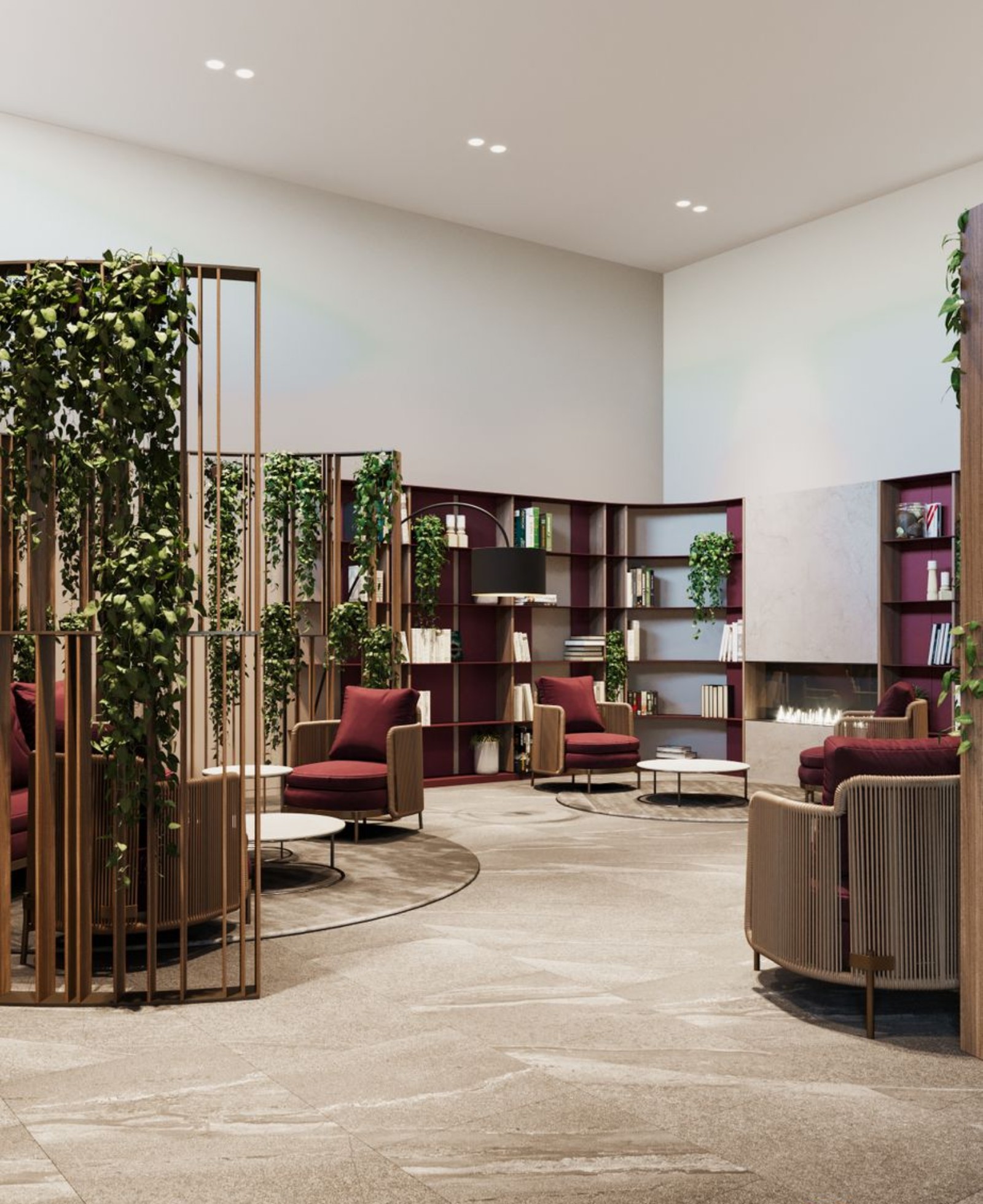 в центральном холле предусмотрены лаунж-зоны с библиотекой и камином