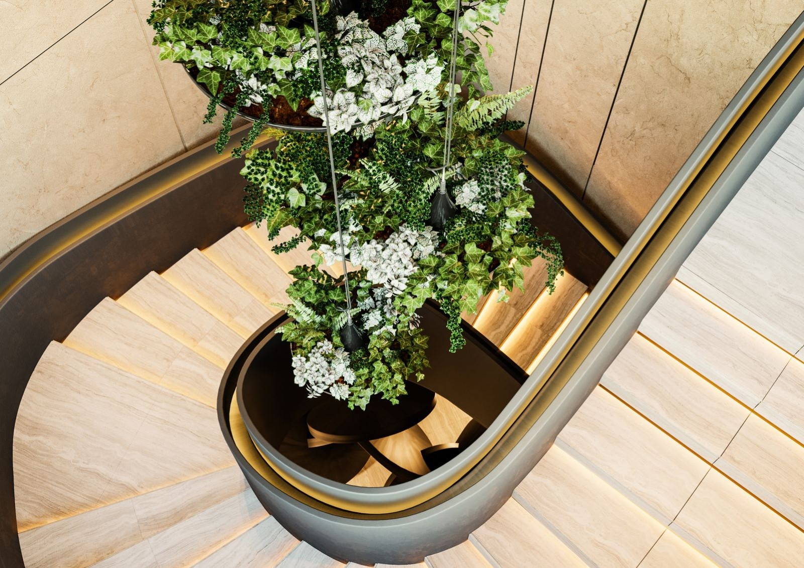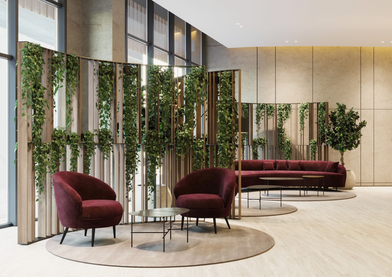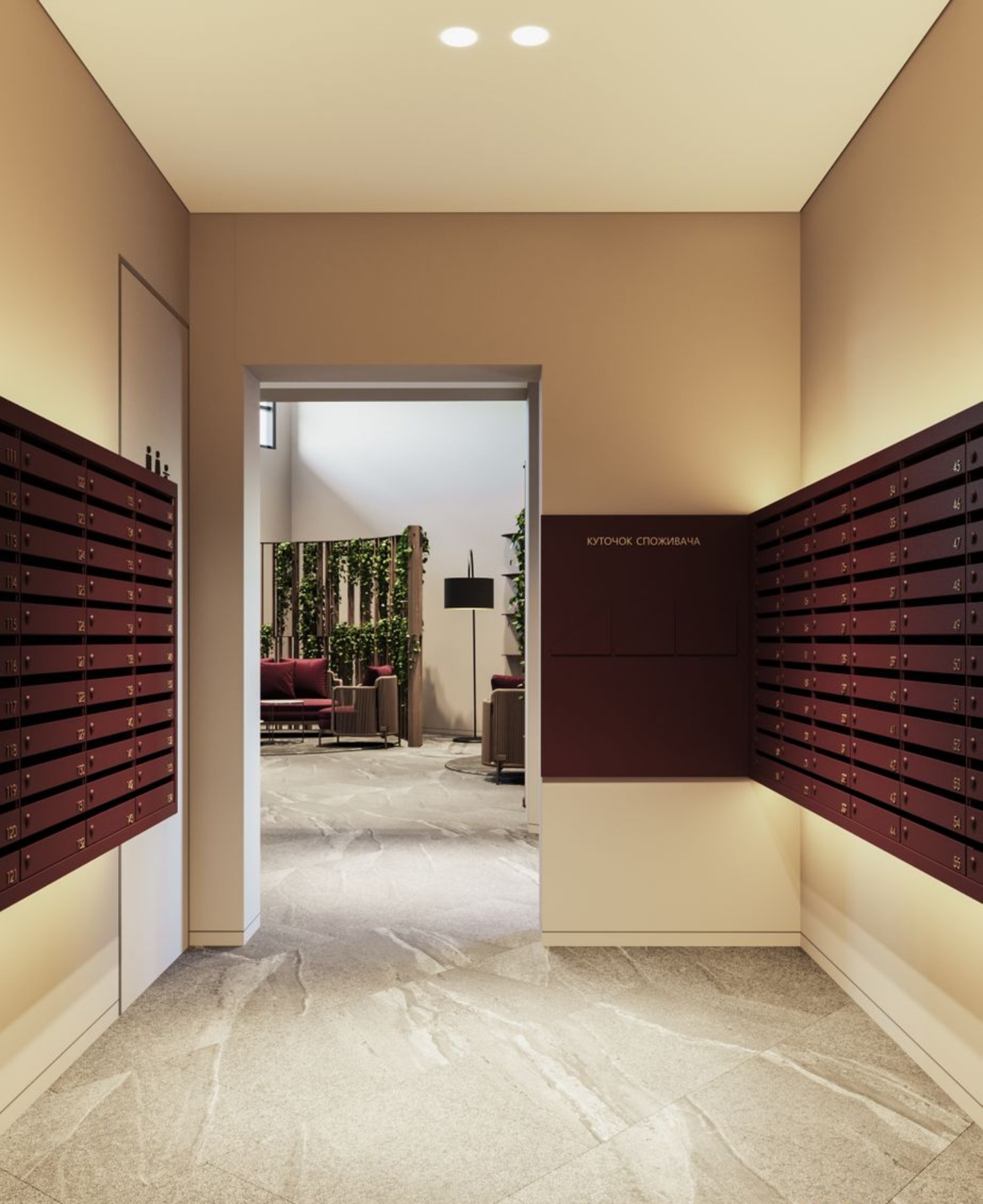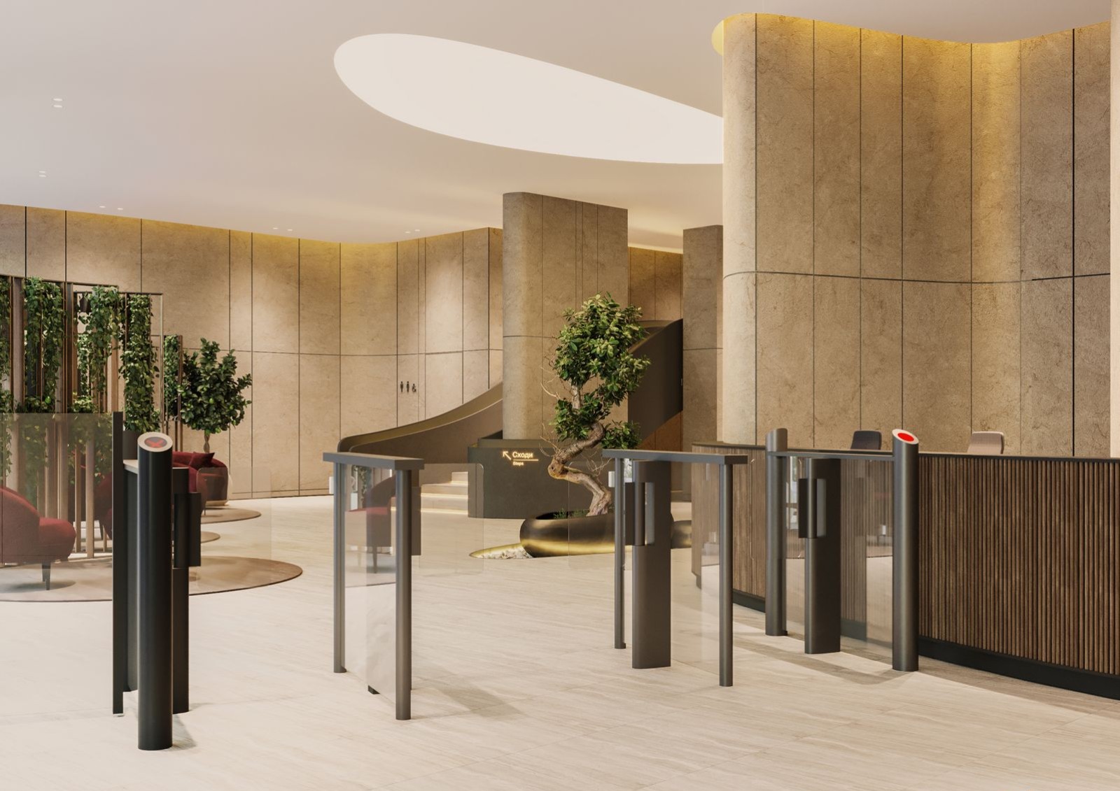 в центральном холле предусмотрены лаунж-зоны с библиотекой и камином