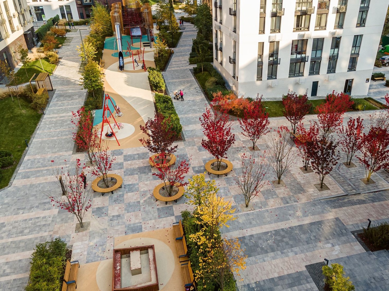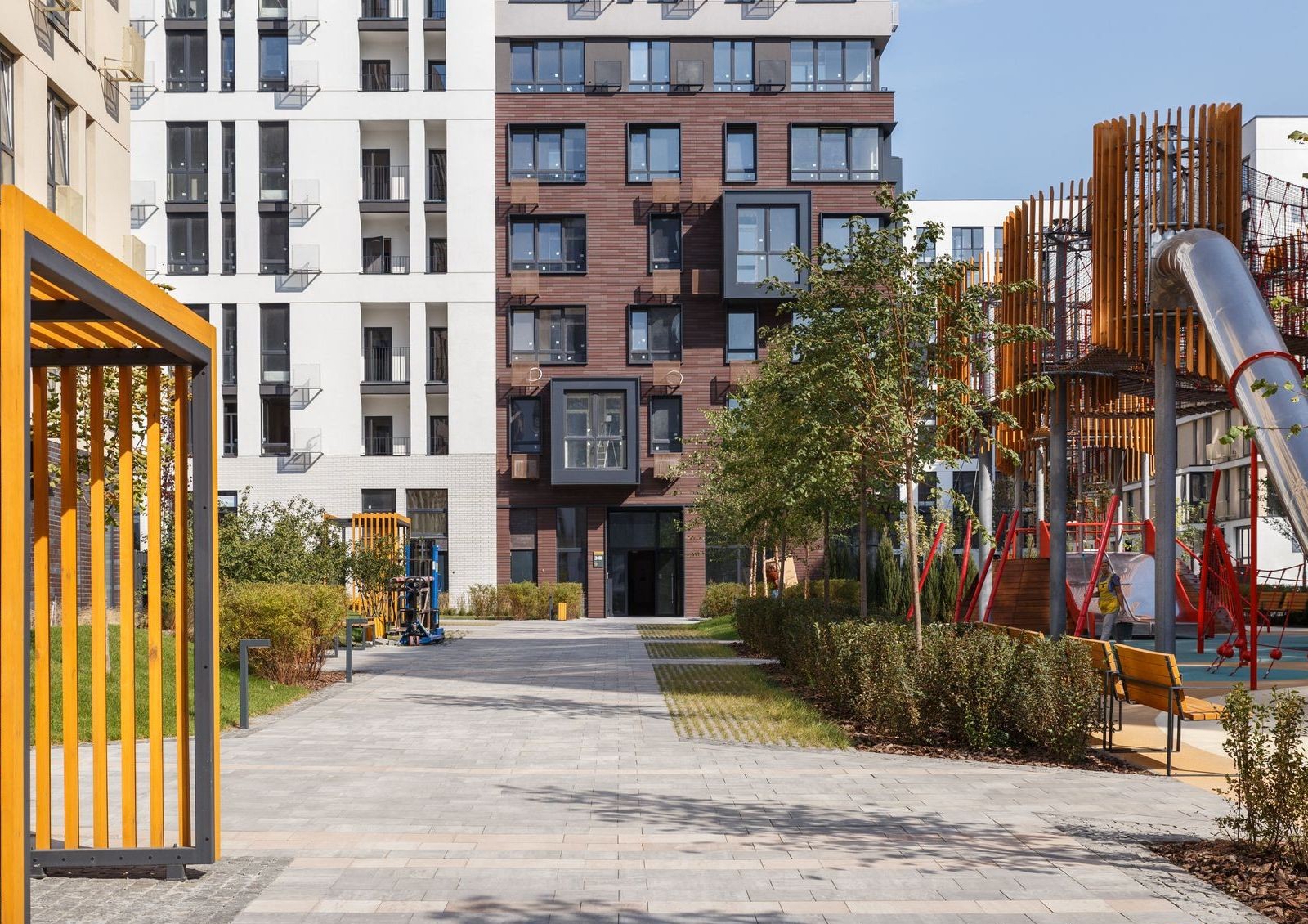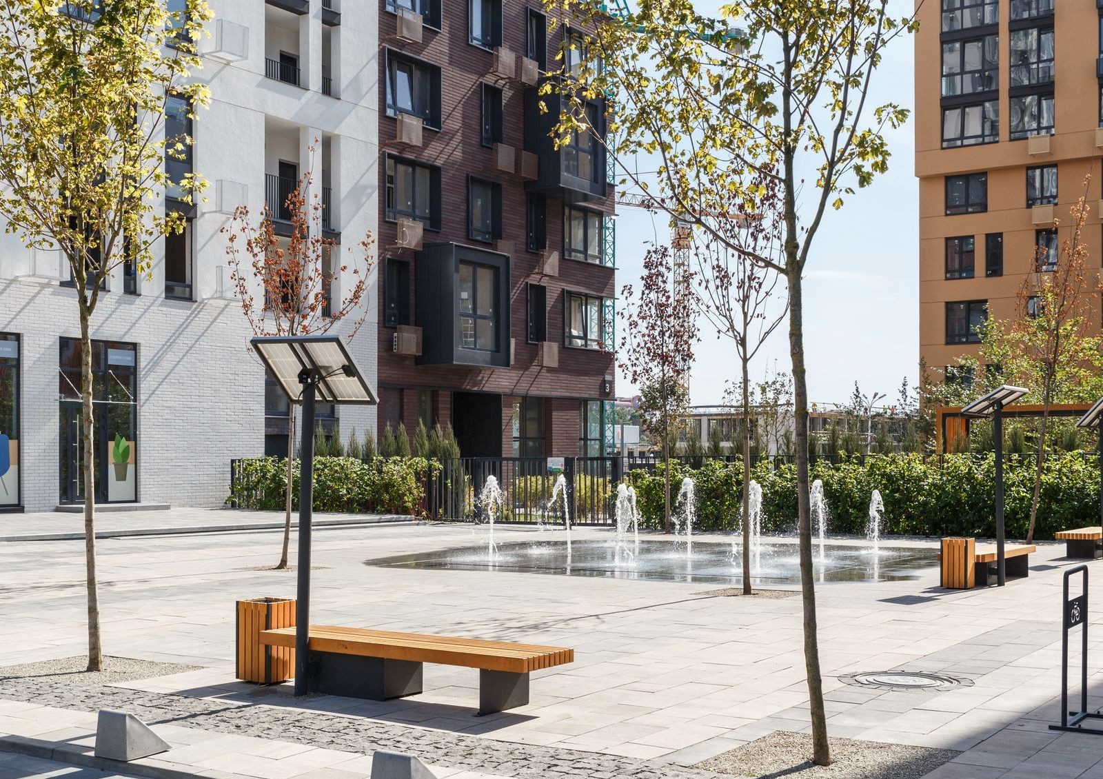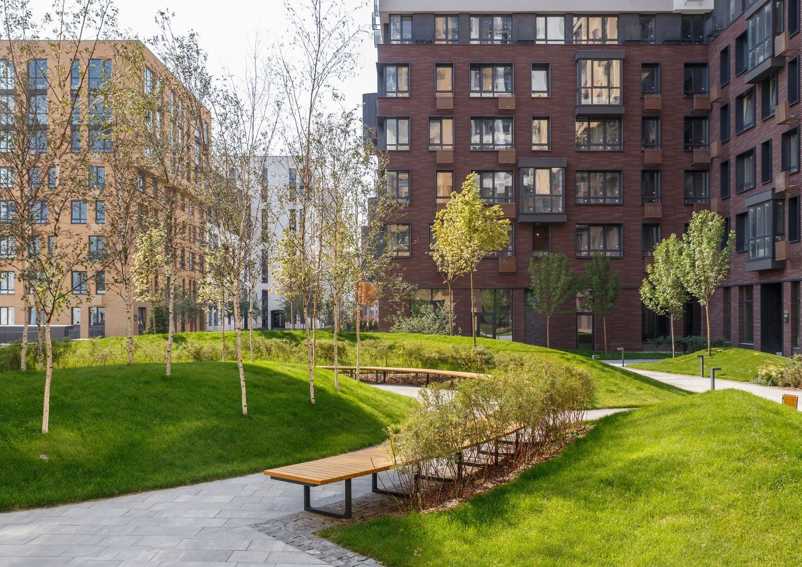 Переменная этажность домов и тщательно просчитанные расстояния между зданиями позволяют осветить дворы солнечным светом, а также дают возможность наслаждаться живописными пейзажами жителям максимального количества квартир.