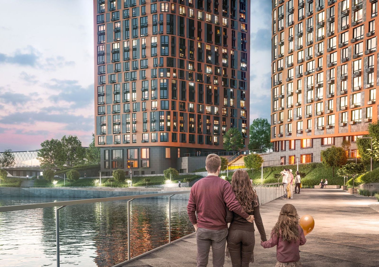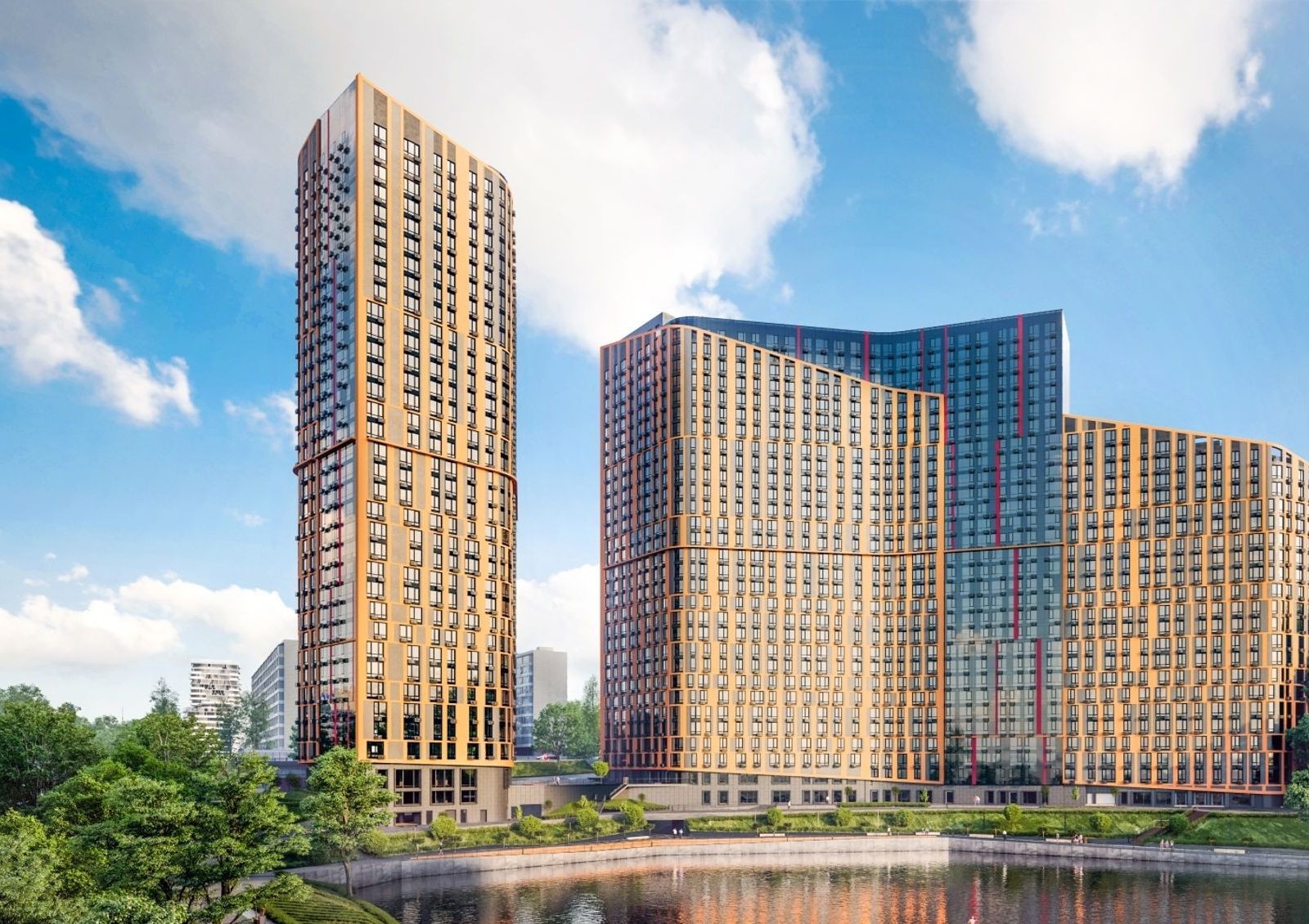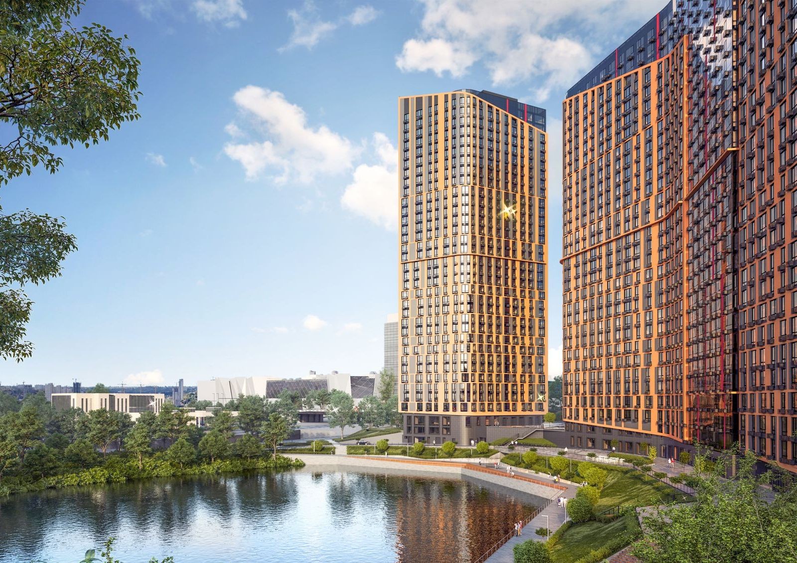 Внутренний двор комплекса будет недоступен для проезда автомобилей, поэтому жильцы смогут спокойно гулять по обустроенным площадкам и зеленым зонам отдыха. Также в проект входит обустройство набережной вдоль озера Глинка, ведь небольшое озеро во дворе — уже редкость.