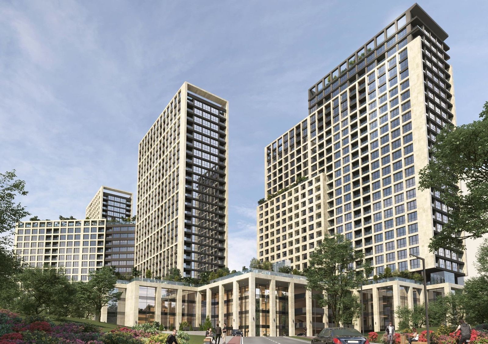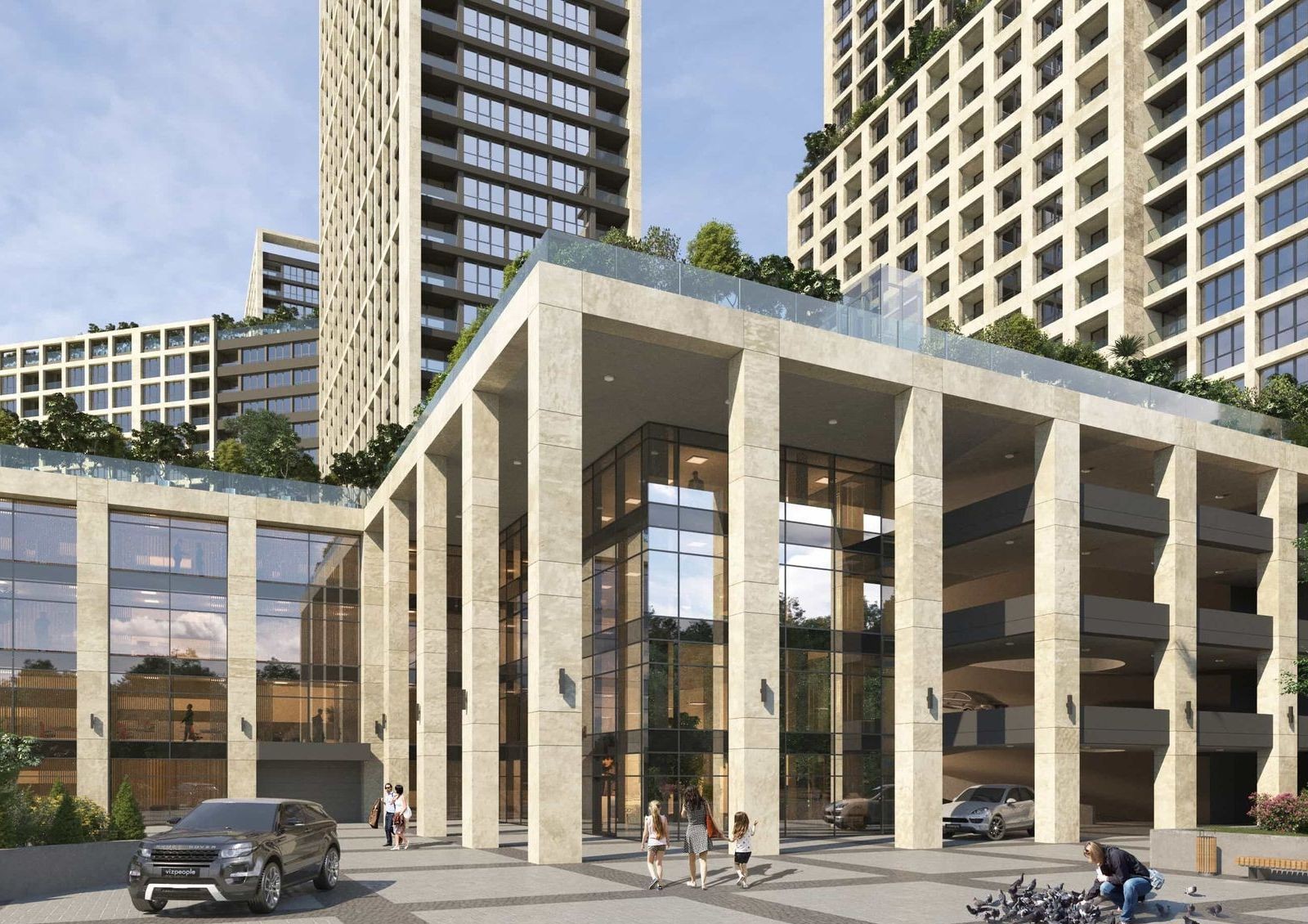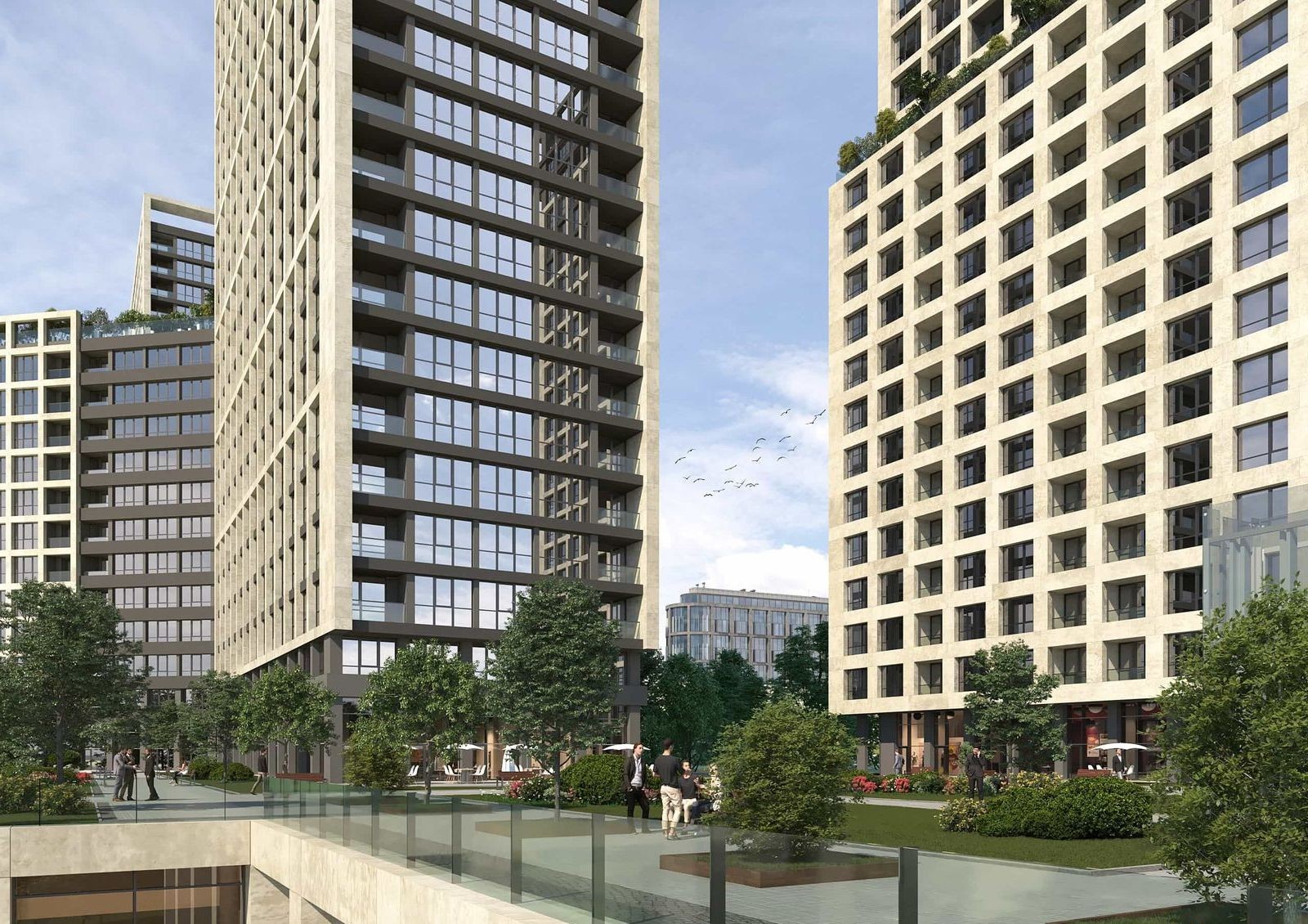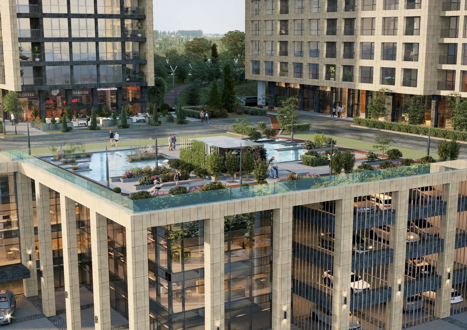 Общая стилобатная часть будет коммерческой зоной, где откроют магазины, супермаркет, салоны красоты, отделение банка и полезные сервисы для комфорта жильцов. Крыша стилобата будет местом для прогулок по аллеям с ландшафтным дизайном.