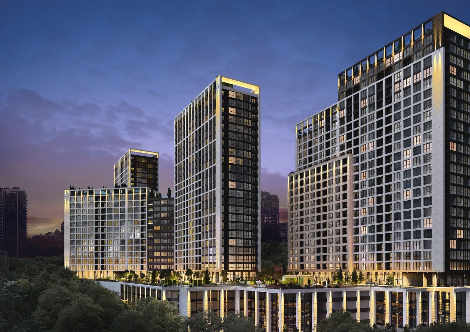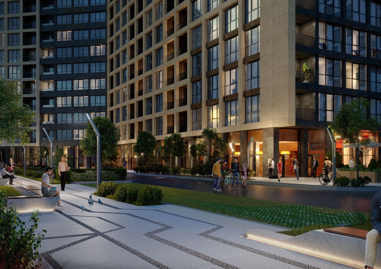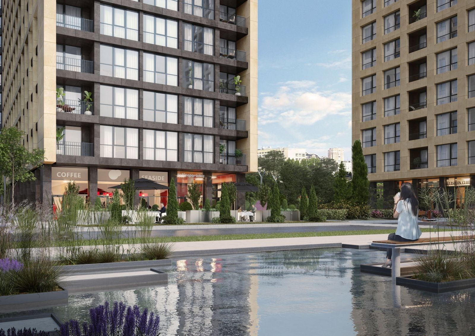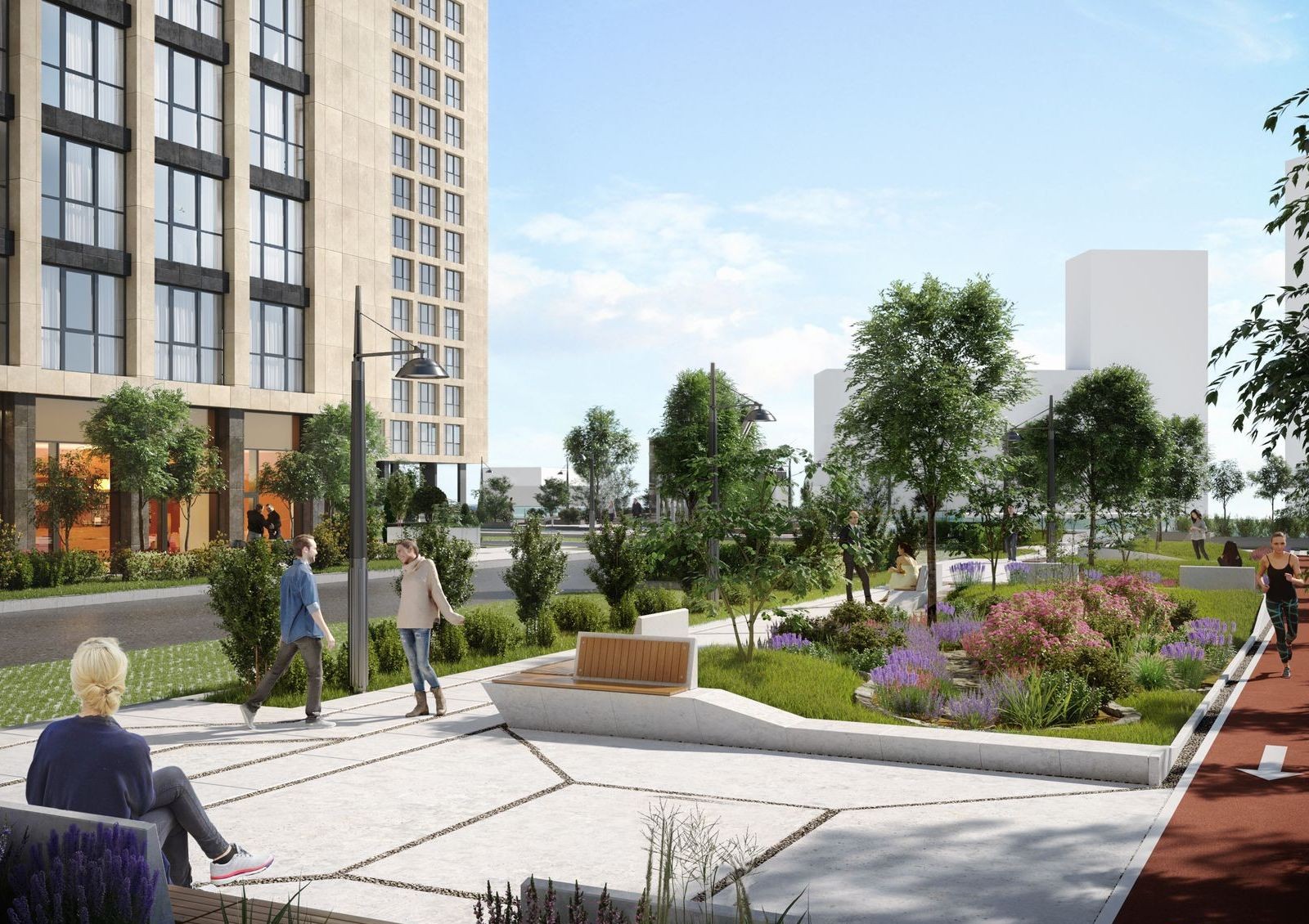 Общая стилобатная часть будет коммерческой зоной, где откроют магазины, супермаркет, салоны красоты, отделение банка и полезные сервисы для комфорта жильцов. Крыша стилобата будет местом для прогулок по аллеям с ландшафтным дизайном.