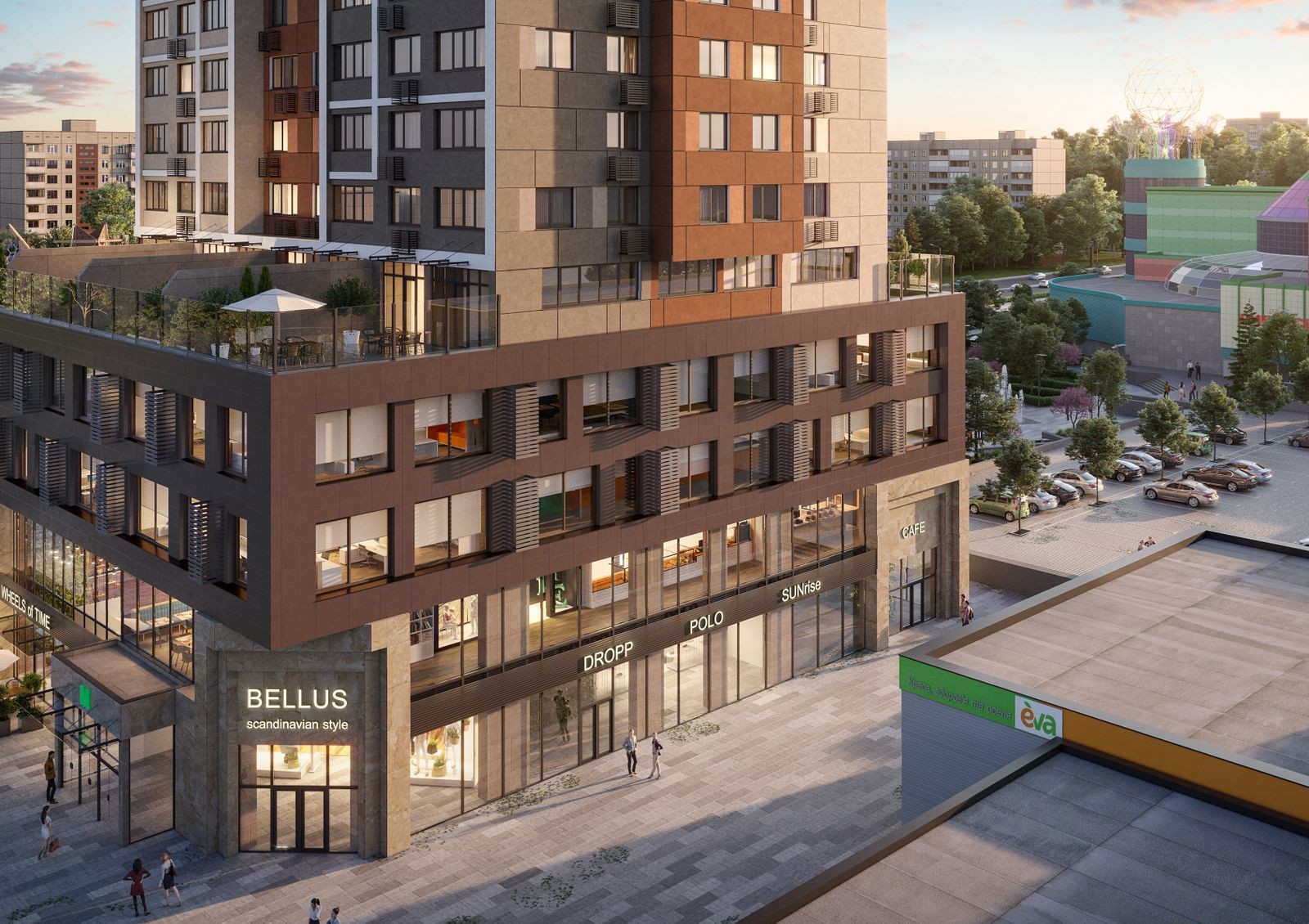 Коммерческая часть Obolon Plaza — это первые 4 этажа комплекса. На коммерческих площадках откроют магазины, кафе, рестораны, салоны красоты, офисы и другие полезные сервисы для жильцов.