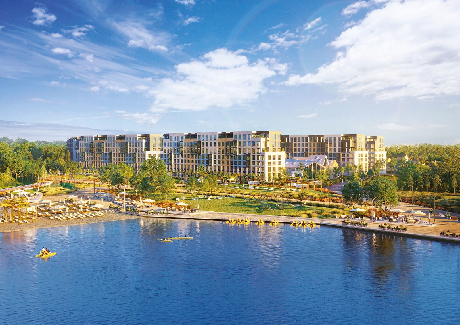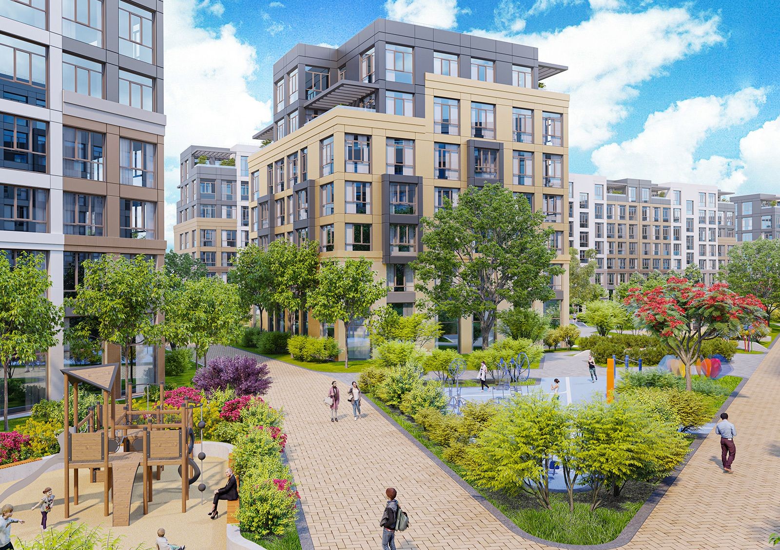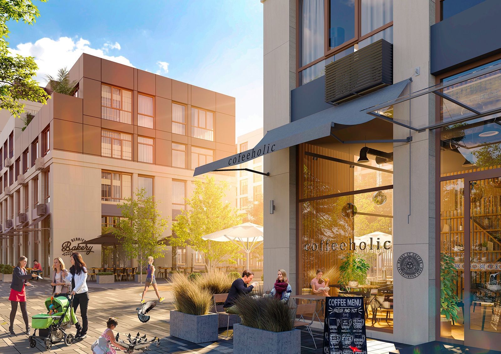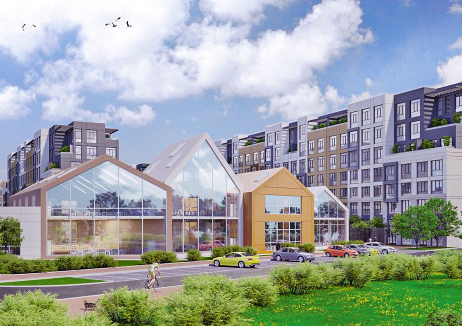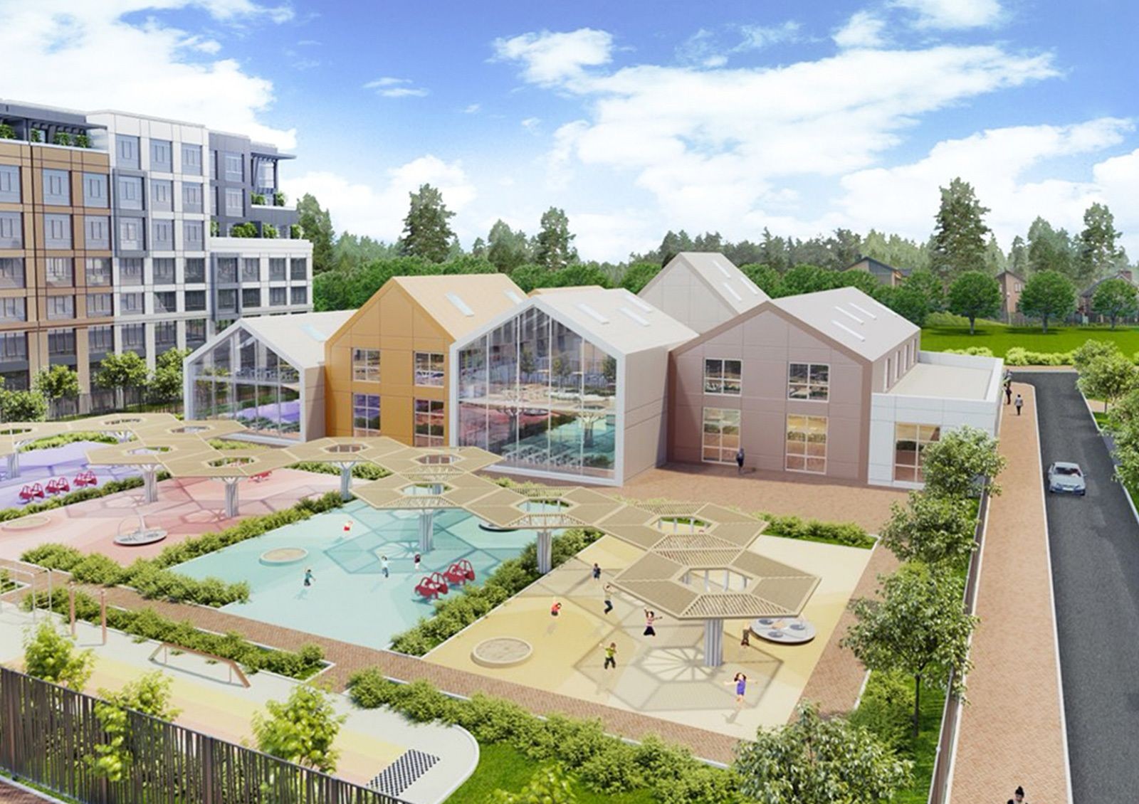 Чтобы жителям не приходилось покидать комплекс, проектом предусмотрено развитие собственной инфраструктуры: построят торговый центр, спортивный комплекс, общественный центр и детский садик на 120 мест.