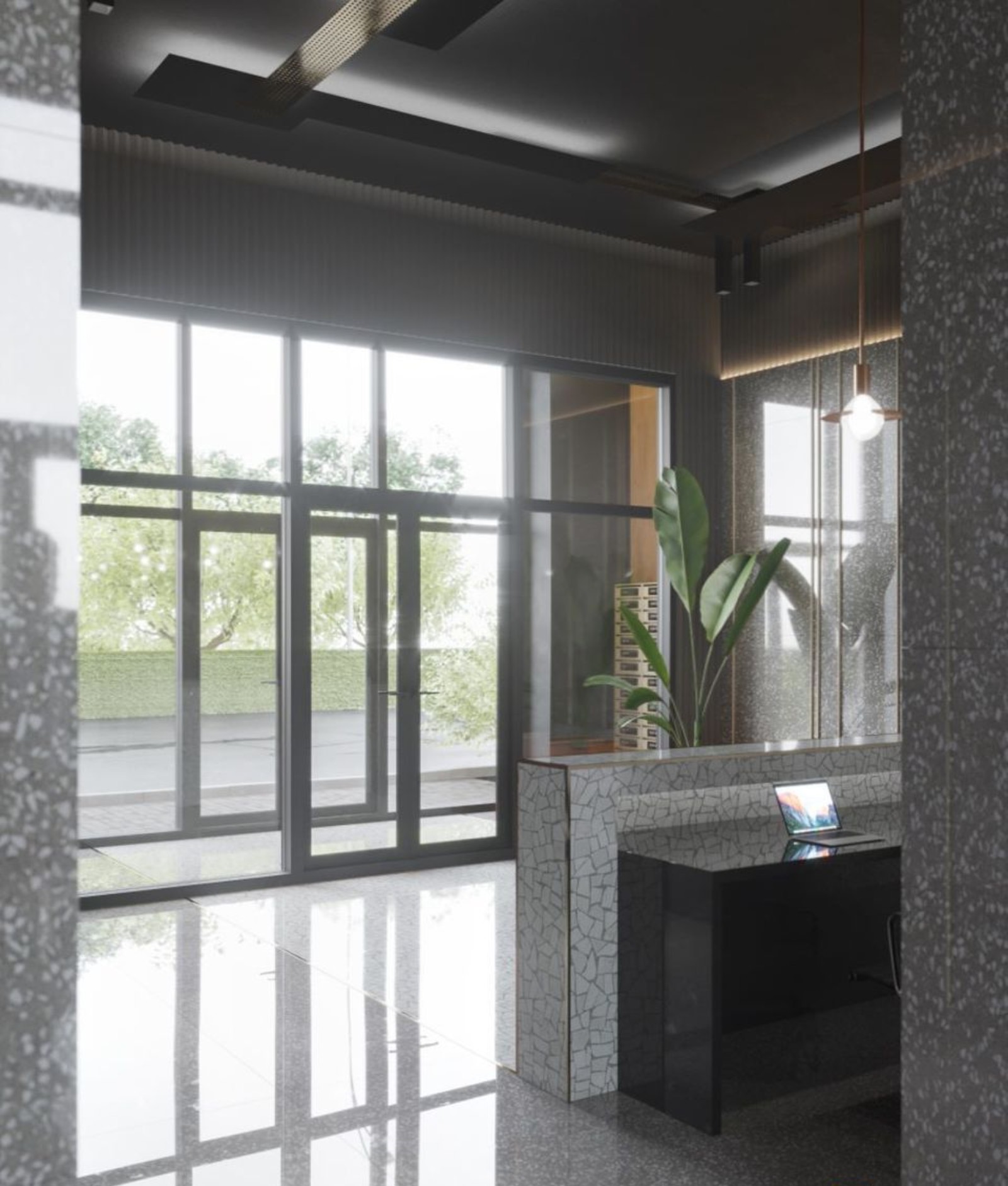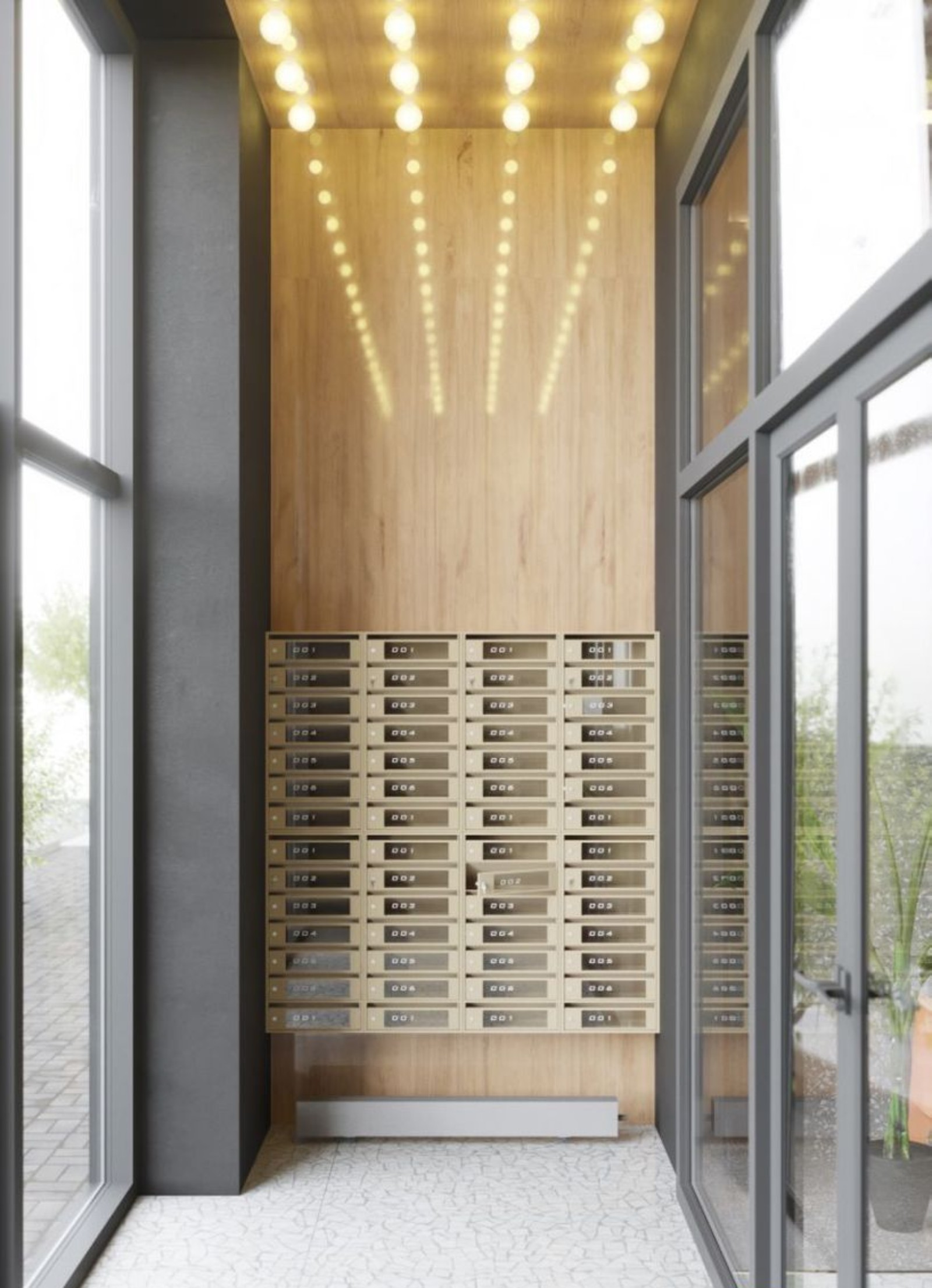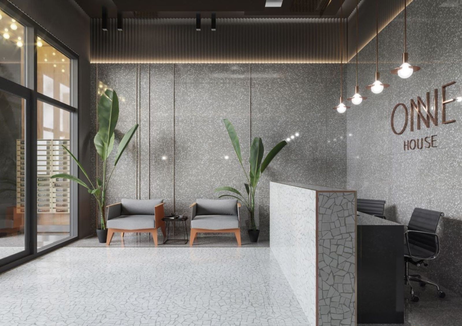 На нижнем этаже оборудуются большие уютные холлы, отделанные натуральным камнем и деревом. Также предусмотрена зона ресепшн, а работающий здесь консьерж всегда поможет выкатить во двор коляску, придержит входную дверь.