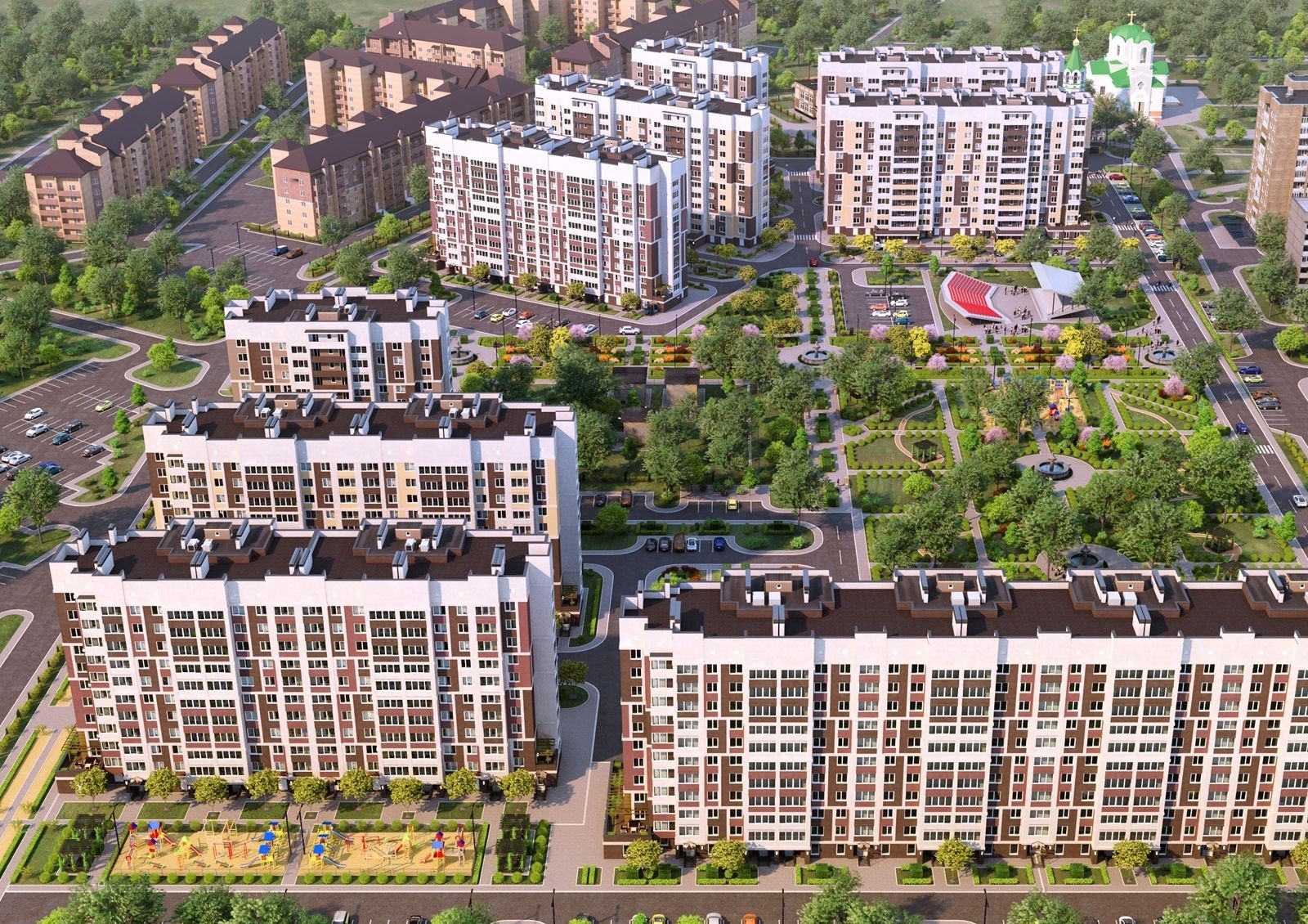 «Сади Вишневі» — новый жилой комплекс в пригороде Киева, 40% площади которого занимает собственный парк с цветущими клумбами, прогулочными аллеями и обустроенными уголками для отдыха. Панорамные виды на гектары зелени, чистый воздух и пение птиц станут бесплатным бонусом к квартире в этом комплексе. Для детей проектом обустройства придомовой территории предусмотрены игровые городки, площадки для занятий спортом и групповых игр.