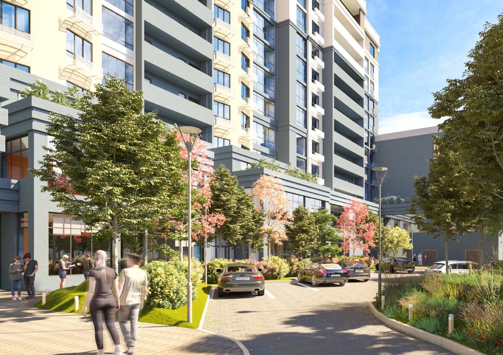 Кроме самого жилого корпуса, на участке сооружается детская площадка и уютная зона отдыха. С наружной стороны организуются гостевые парковочные места для автомашин, устраиваются широкие удобные проезды. Оборудуется подземный паркинг, устанавливаются фонари уличного освещения. Имеется площадка для занятия спортом.
