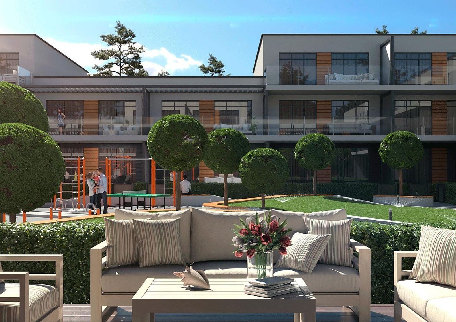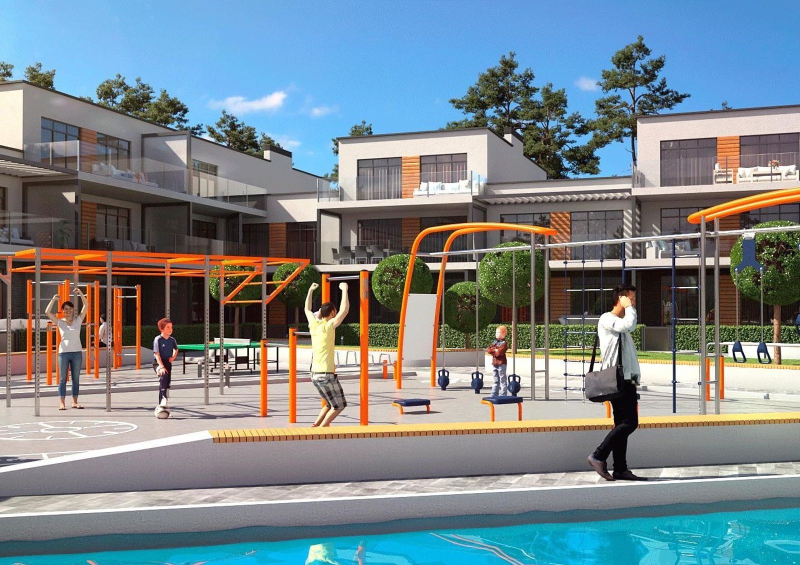 Для занятий спортом на территории оборудована спортивная площадка, а в минуте расположен фитнес-центр Champions Club с бассейном, тренажерным залом, студией для групповых занятий, детской фитнес-программой, SPA процедурами и студией красоты.