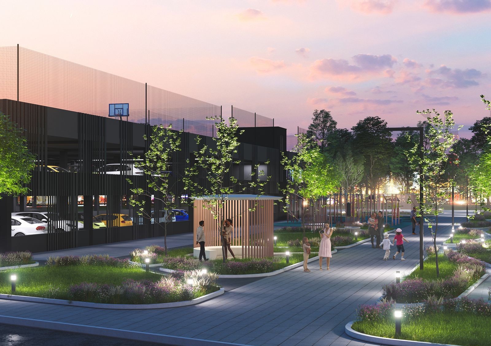 Проектом обустройства придомовой территории предусмотрены современные интерактивные детские и спортивные площадки для разных возрастных групп, беседки для отдыха на свежем воздухе, зеленые островки с цветущими клумбами, пешеходные аллеи. Нижний этаж дома отведен под коммерческие площади, на которых разместят кафе, магазины разной направленности, салон красоты и другие сервисы. Для комфорта жильцов с автомобилями и гостей комплекса во дворе предусмотрен многоуровневый наземный паркинг на 100 мест с баскетбольной площадкой на крыше и открытая стоянка.