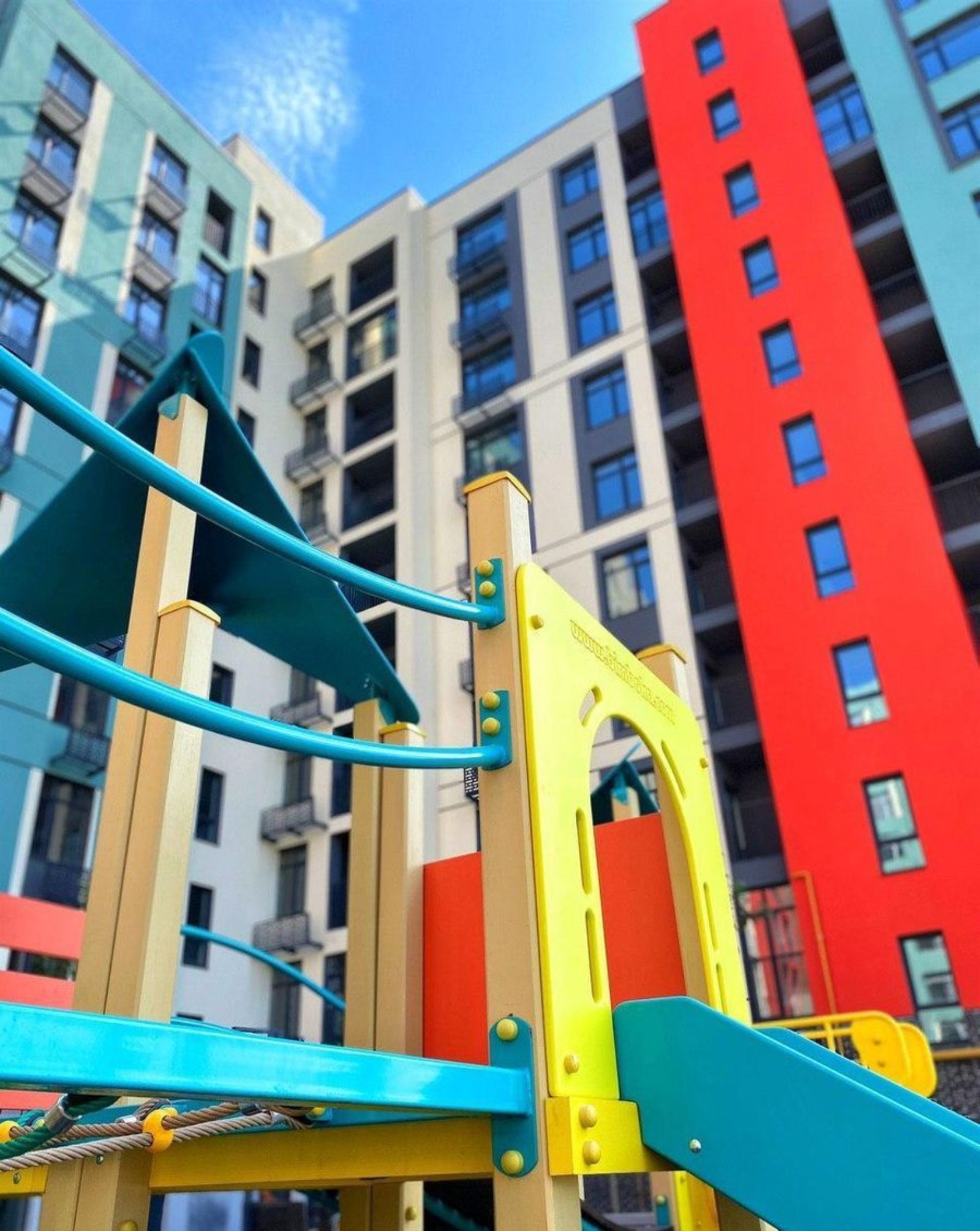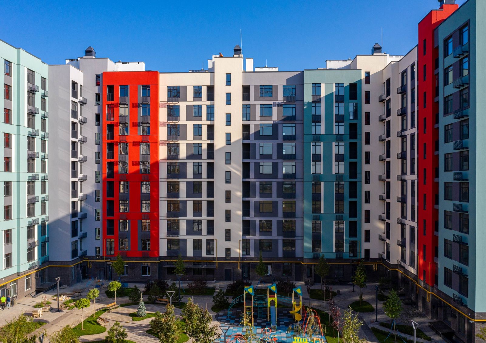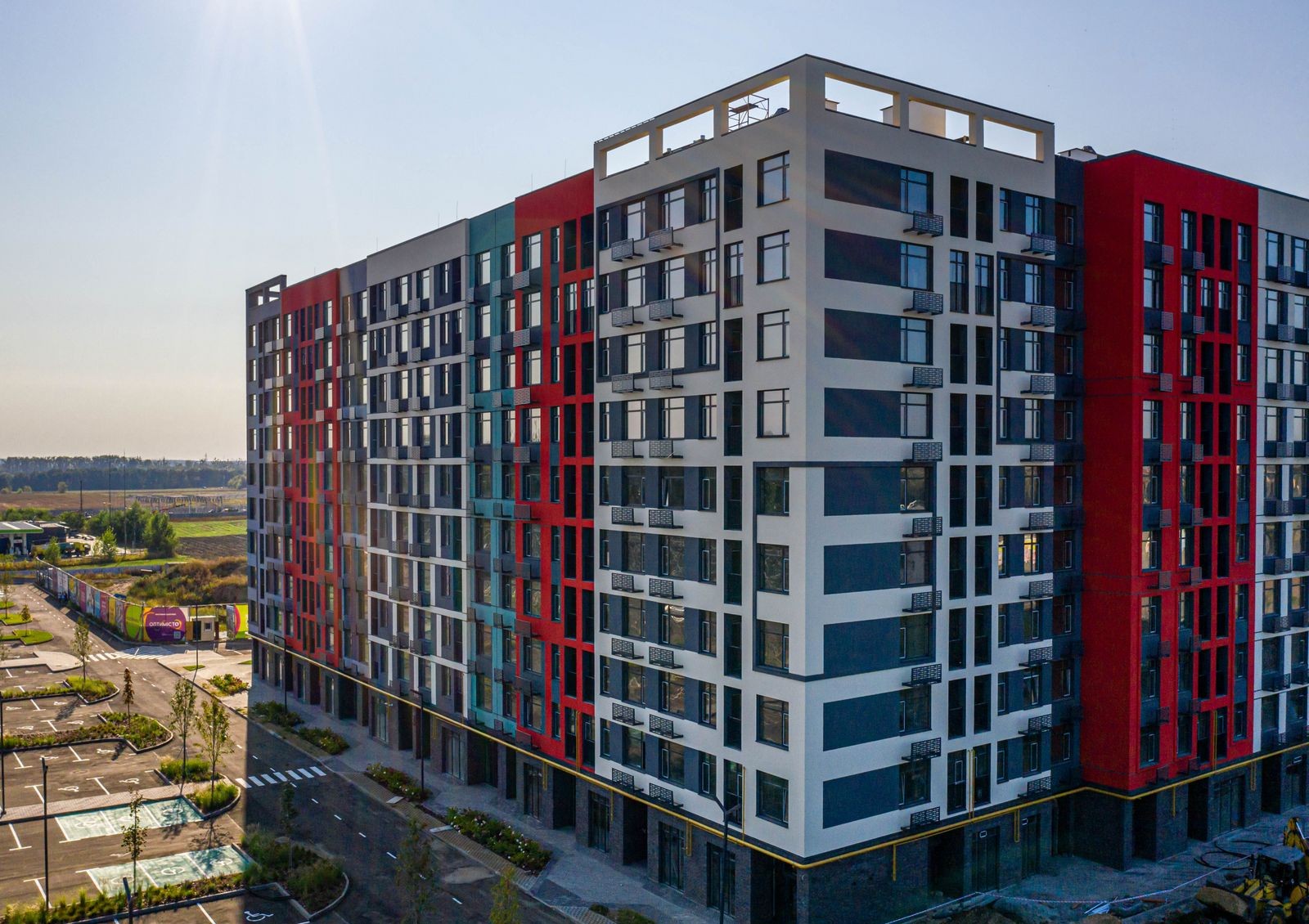 Название комплекса «Оптимісто» отображается во внешнем виде домов и придомовой территории: фасады, места для отдыха и детские площадки оформлены яркими цветами, которые будут узнаваемы даже издалека.