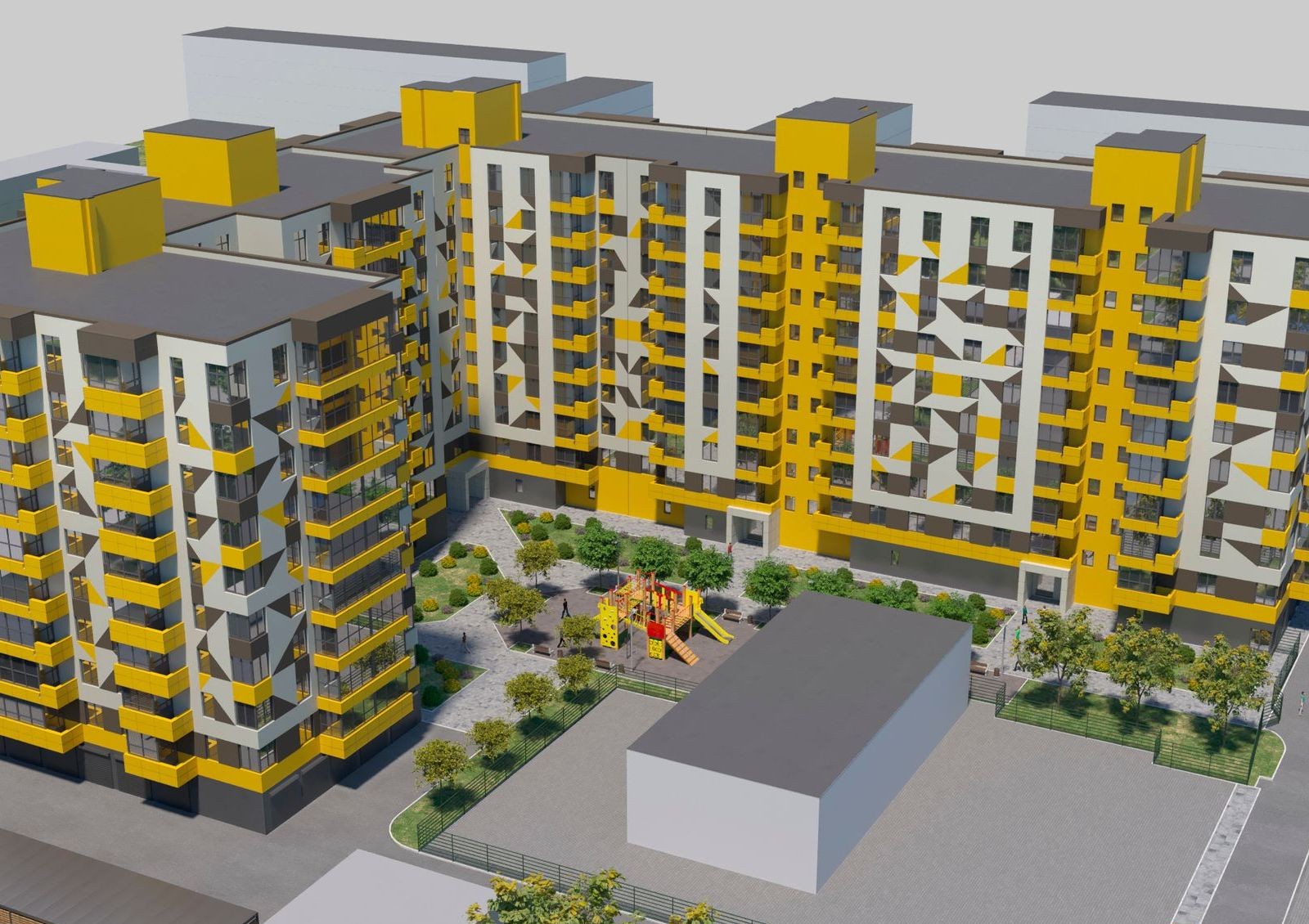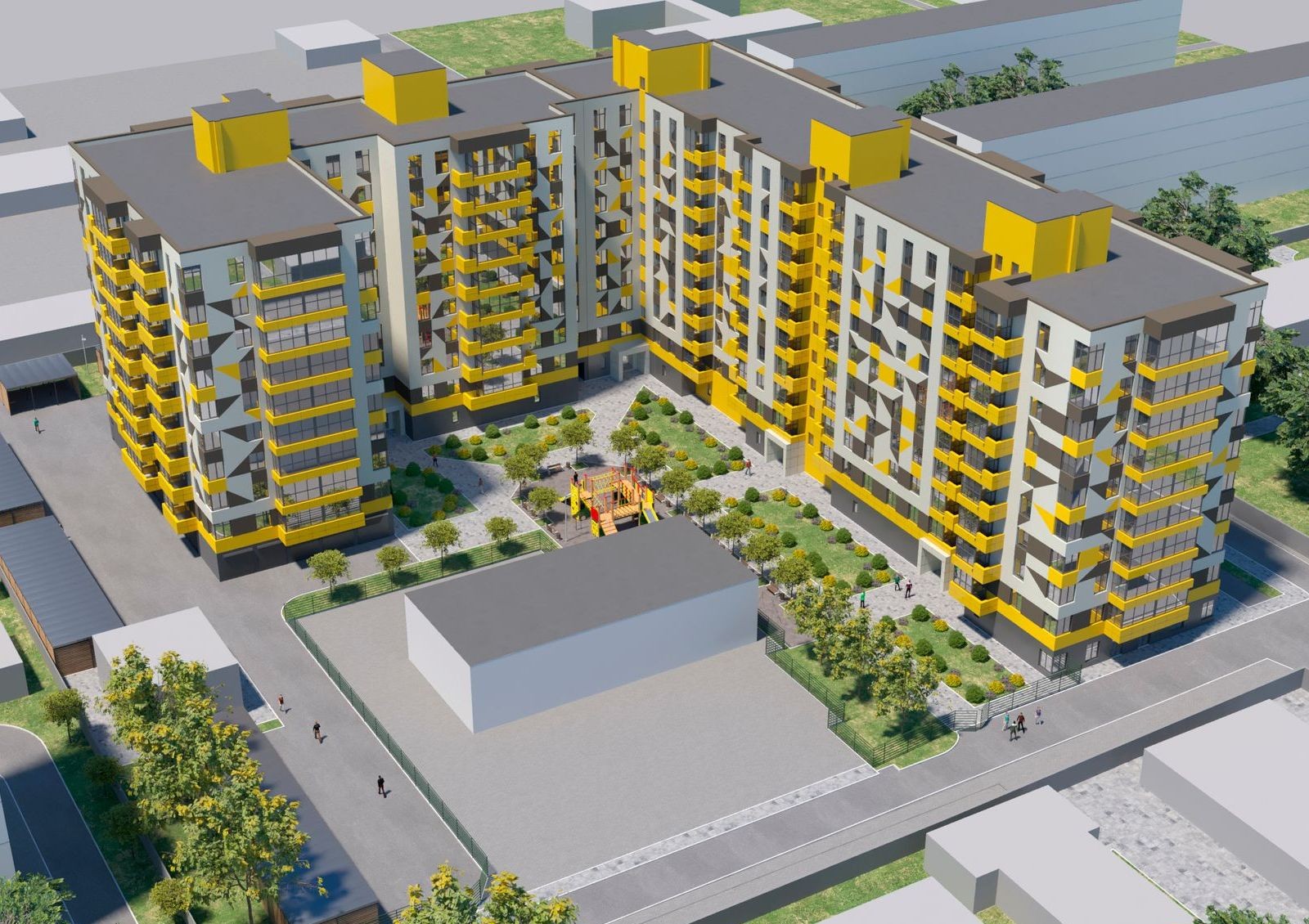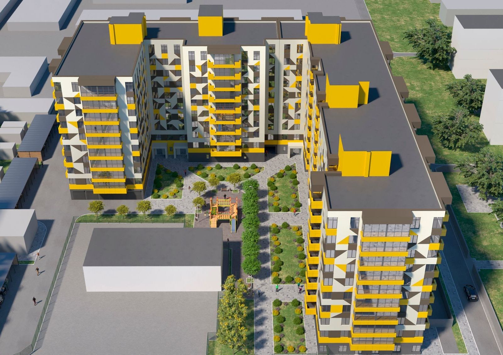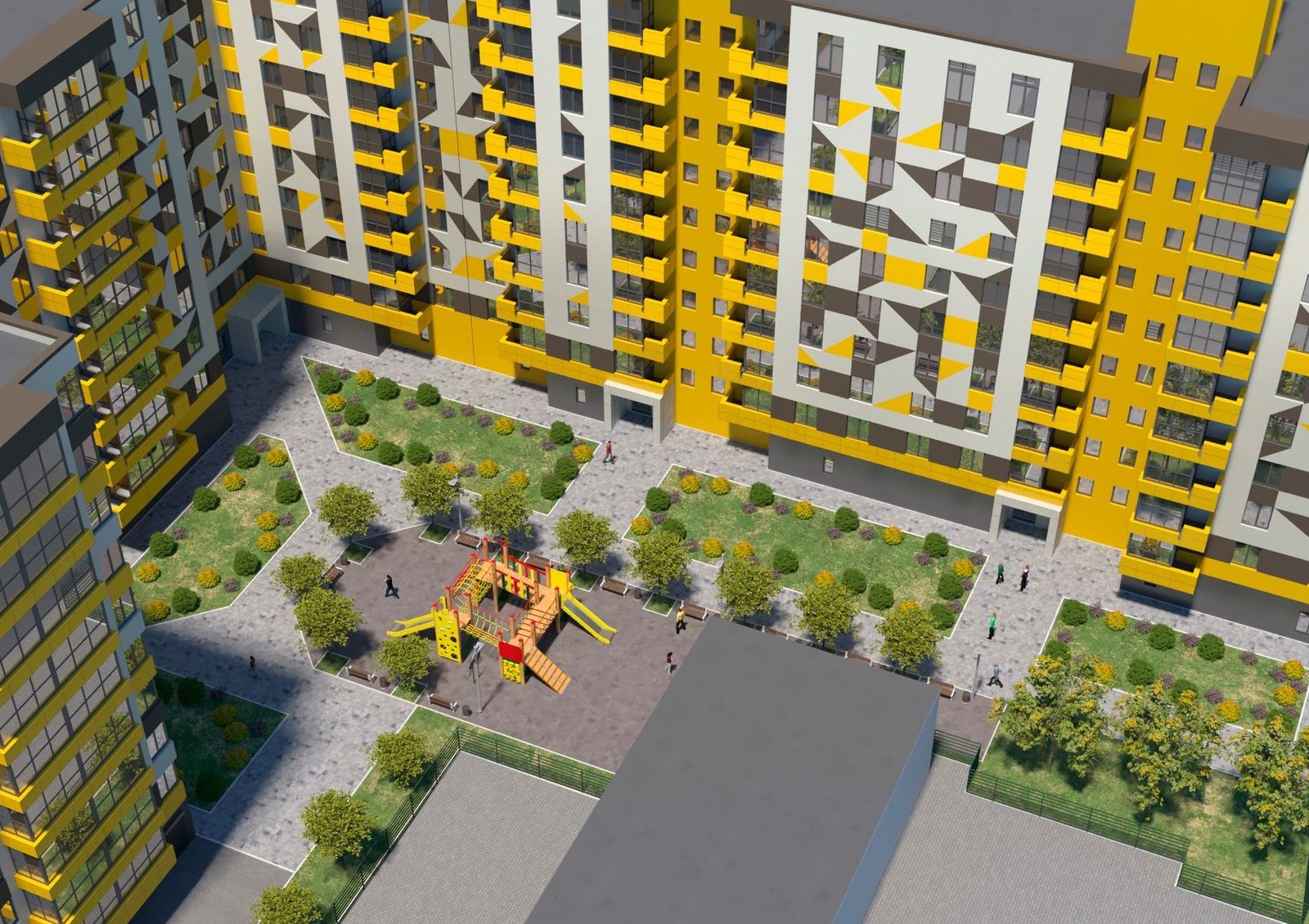 Запланировано, что придомовая территория ЖК будет покрыта асфальтом и тротуарной плиткой. Зеленые насаждения сделают двор более уютным, рядом с домом разместится детская площадка с песочницей, качелями и другими развлечениями.